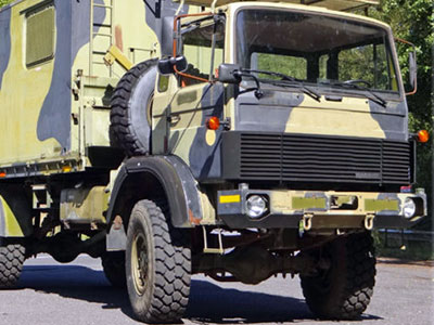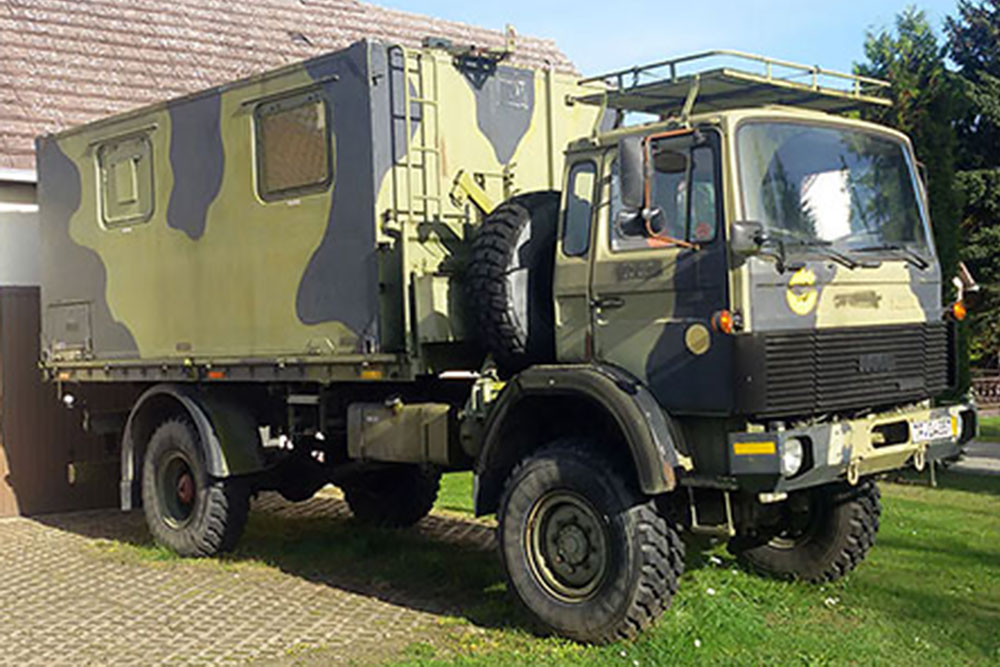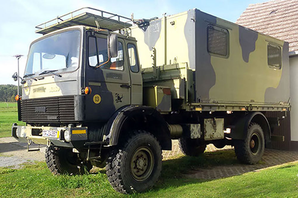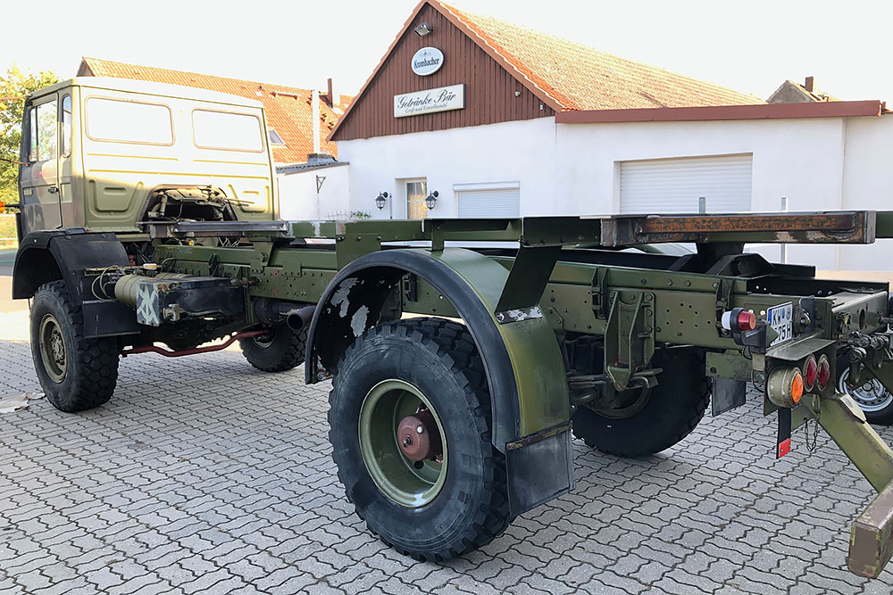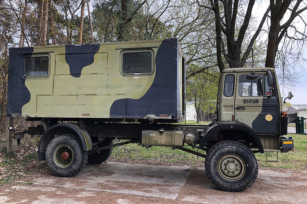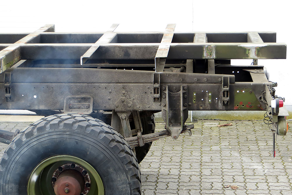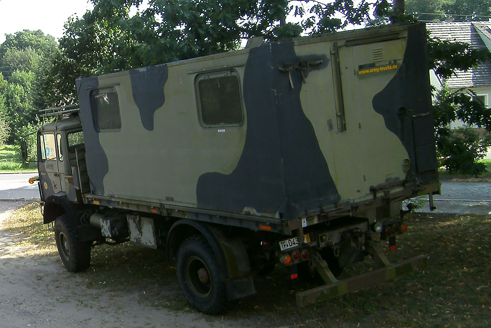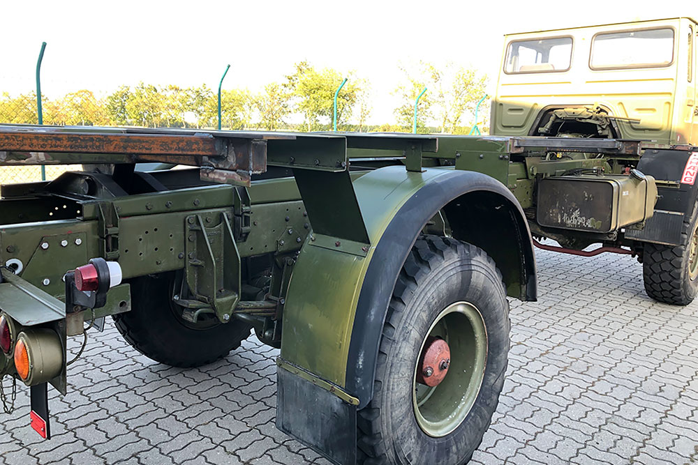 Luftgekühlter Diesel-Motor (Turbo), 6-Zylinder-Reihe, Einzelkabine 2-türig, Servolenkung, 6-Gang-Getriebe, 4x4-permanent-Allrad-Antrieb, Untersetzungsgetriebe, Differenzialsperre mitte und hinten, Armeeausführung mit langem Radstand, großer Bodenfreiheit und extra starken Blattfedern, Einzelbereifung: 365/85 R20...