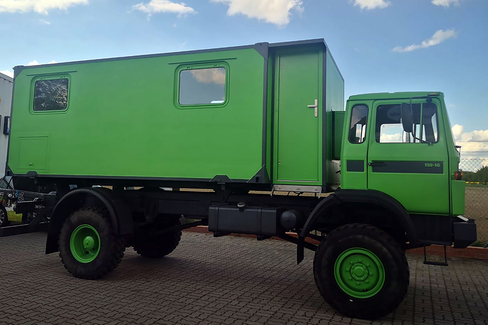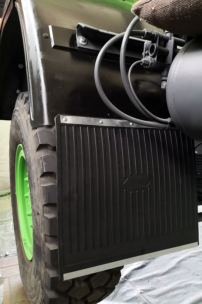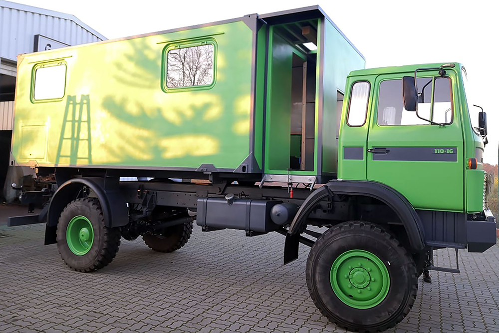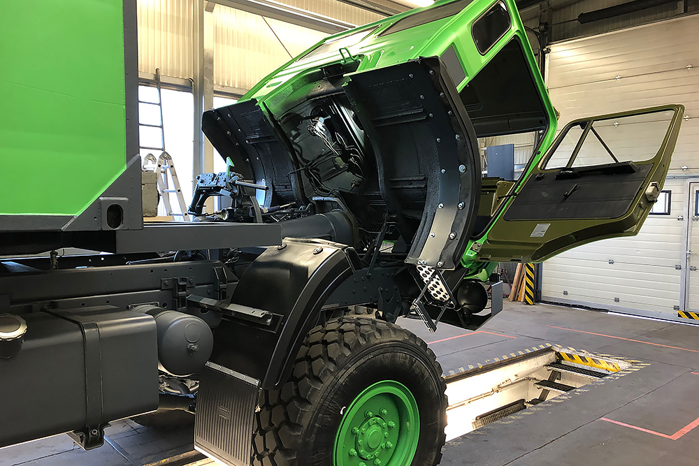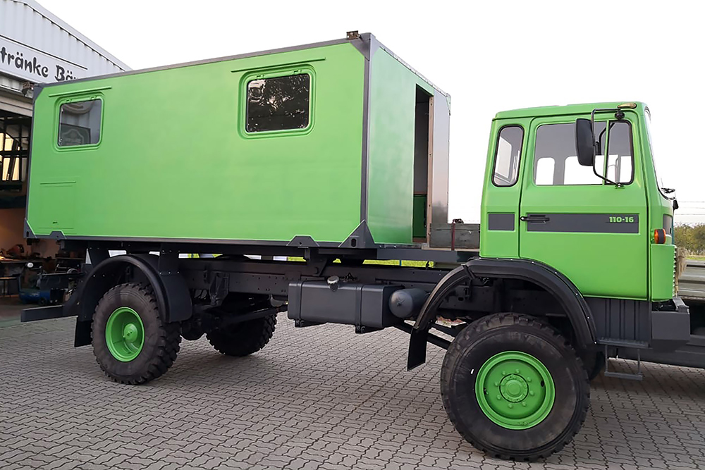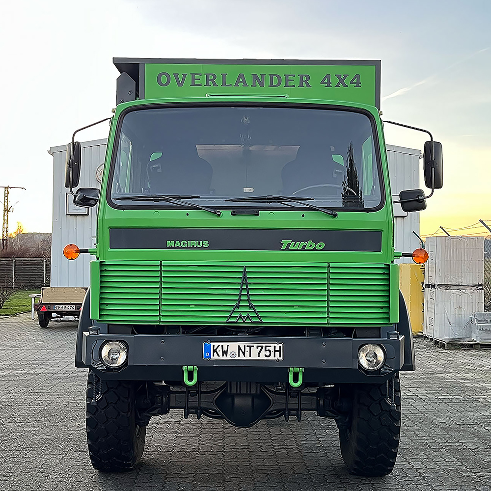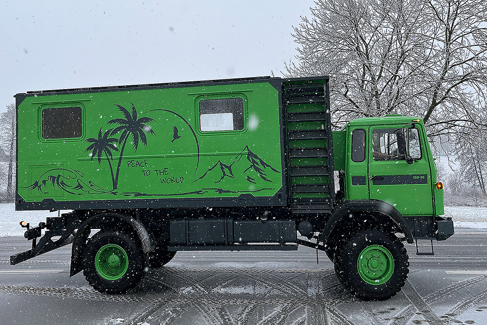 Luftgekühlter Diesel-Motor (Turbo), 6-Zylinder-Reihe, Einzelkabine 2-türig, Servolenkung, 6-Gang-Getriebe, 4x4-permanent-Allrad-Antrieb, Untersetzungsgetriebe, Differenzialsperre mitte und hinten, Armeeausführung mit langem Radstand, großer Bodenfreiheit und extra starken Blattfedern, Einzelbereifung: 365/85 R20...