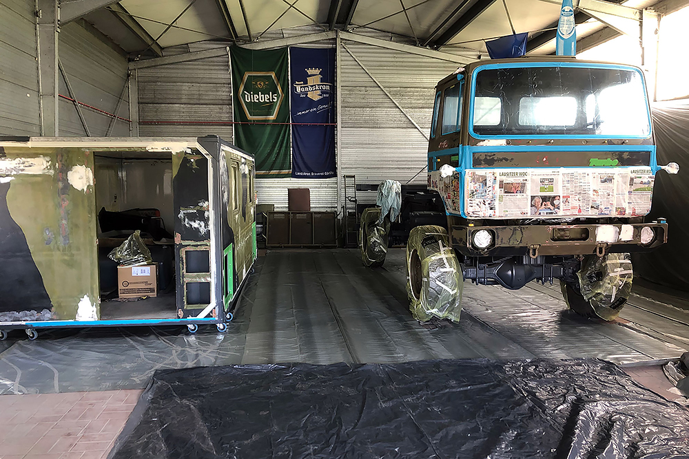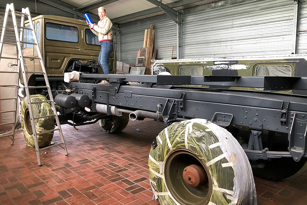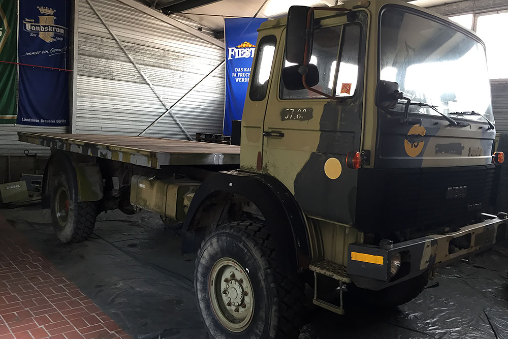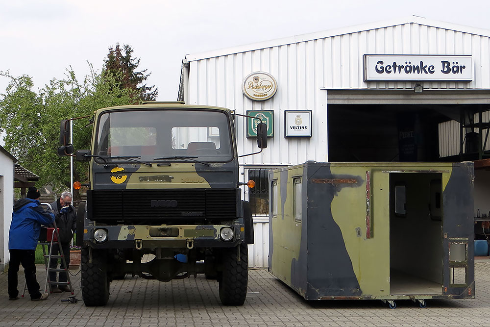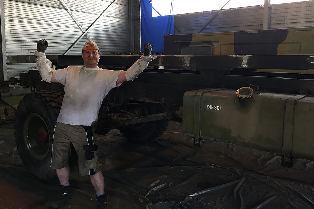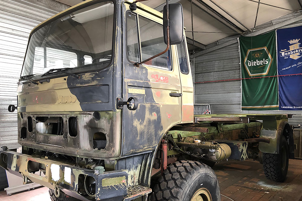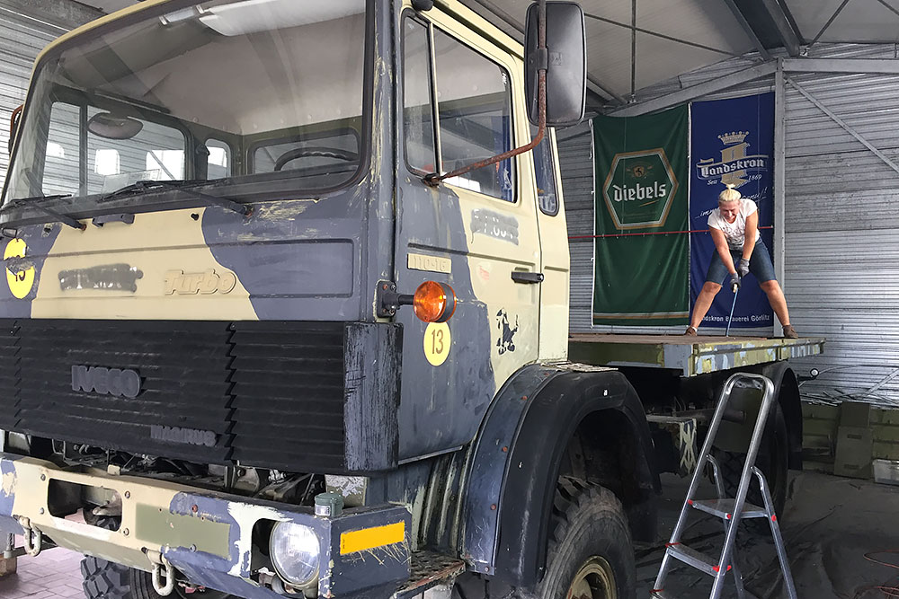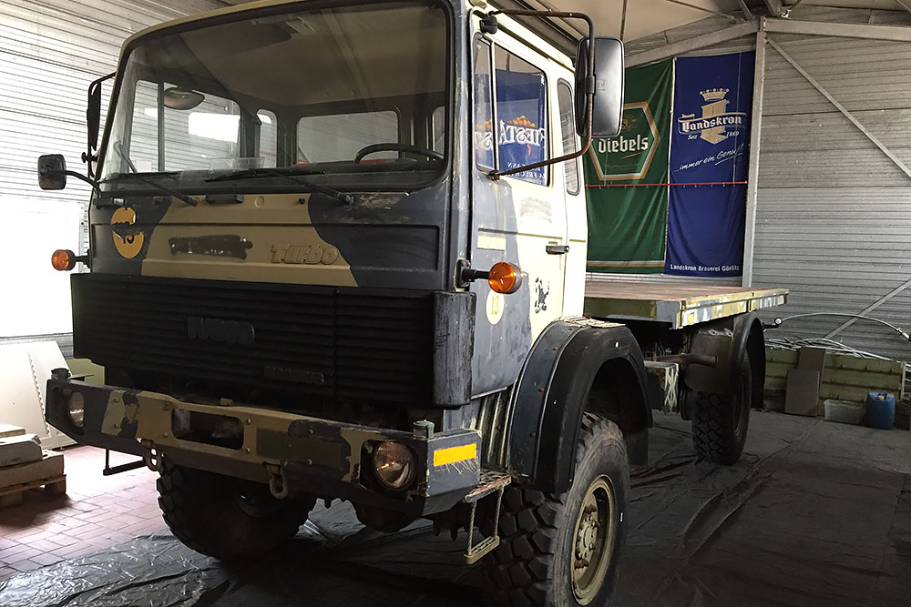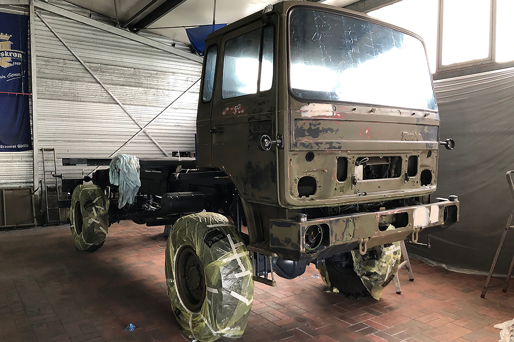 August 2019 - Der LKW wurde von den Soldaten einmal in Wachs getaucht! Es folgt daher vor der erneuten Lackierung wochenlanges reinigen, schleifen, spachteln, reinigen, schleifen, spachteln, reinigen, schleifen, spachteln, reinigen, schleifen, spachteln... würg...!