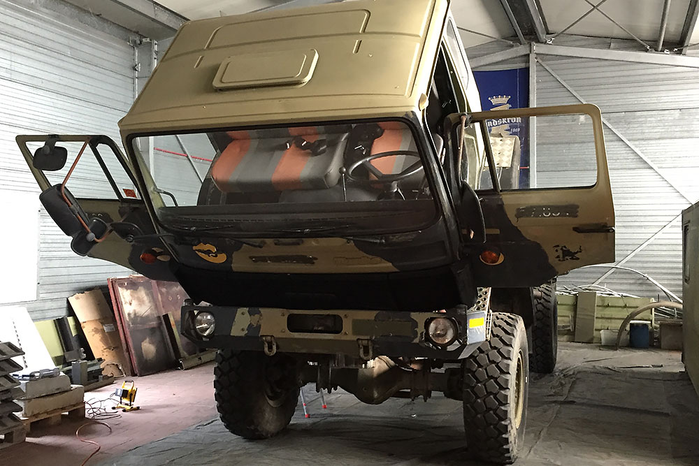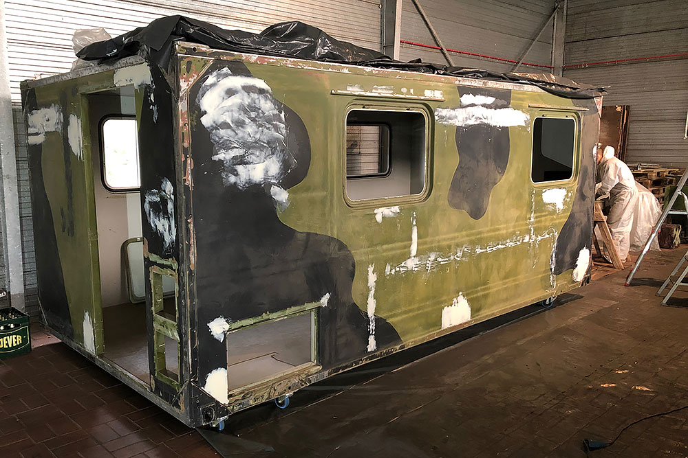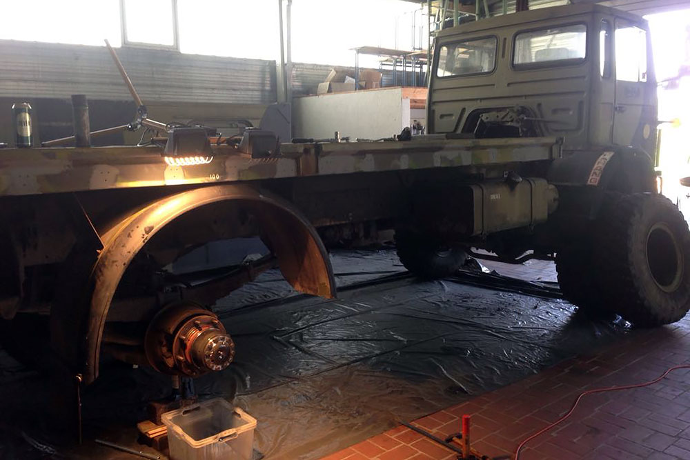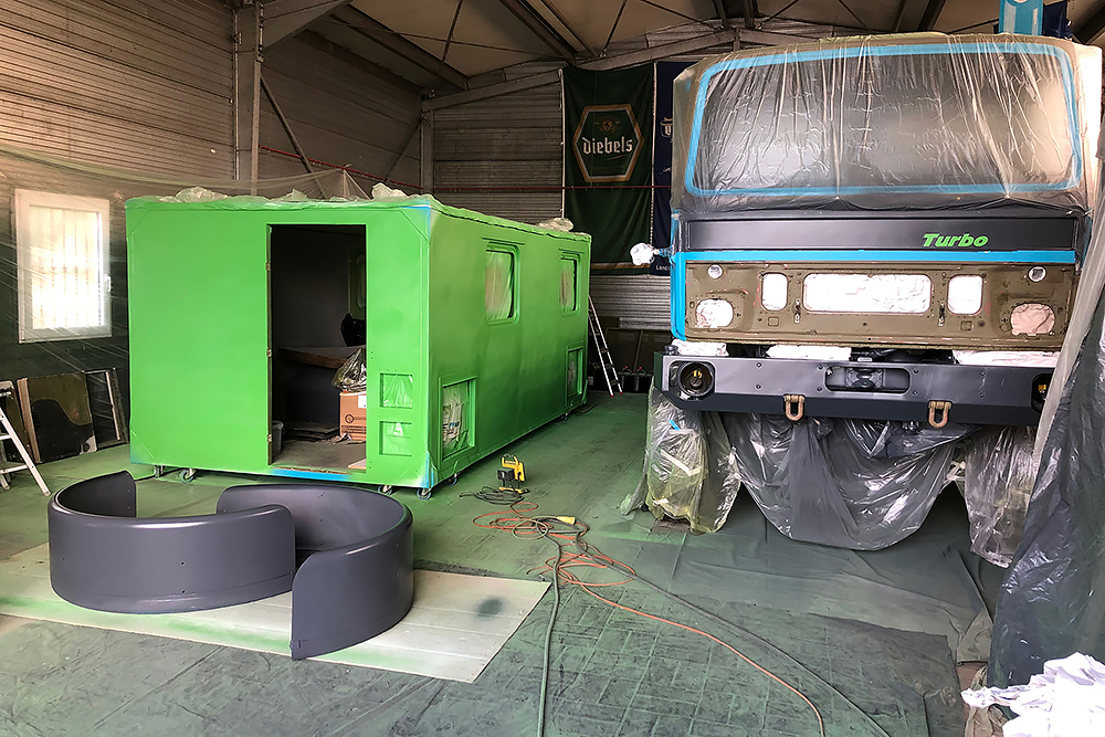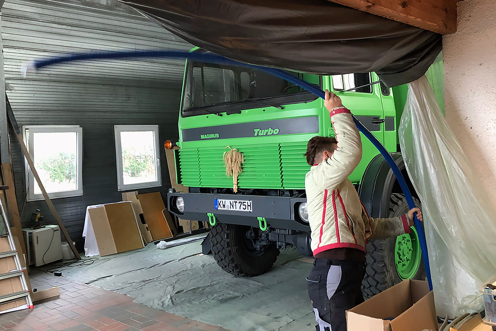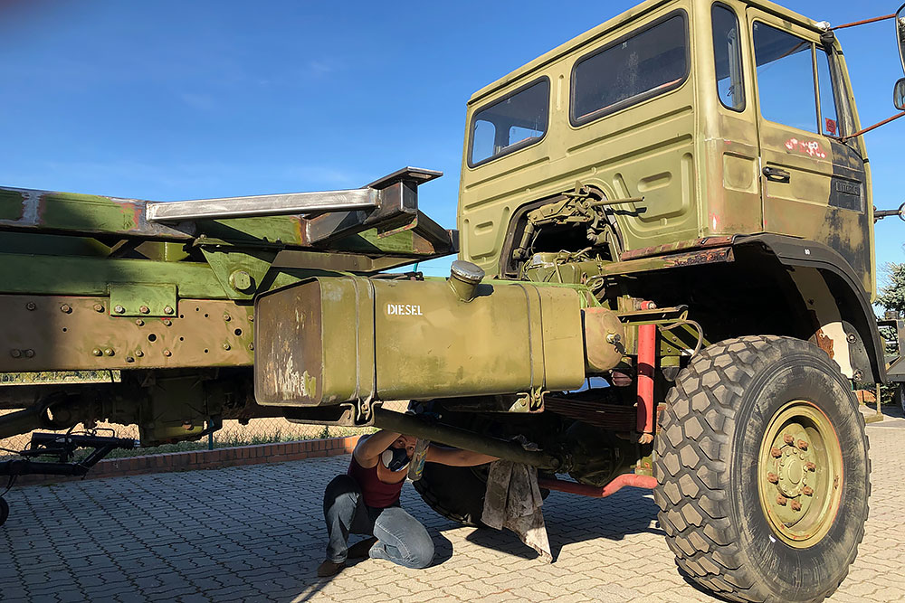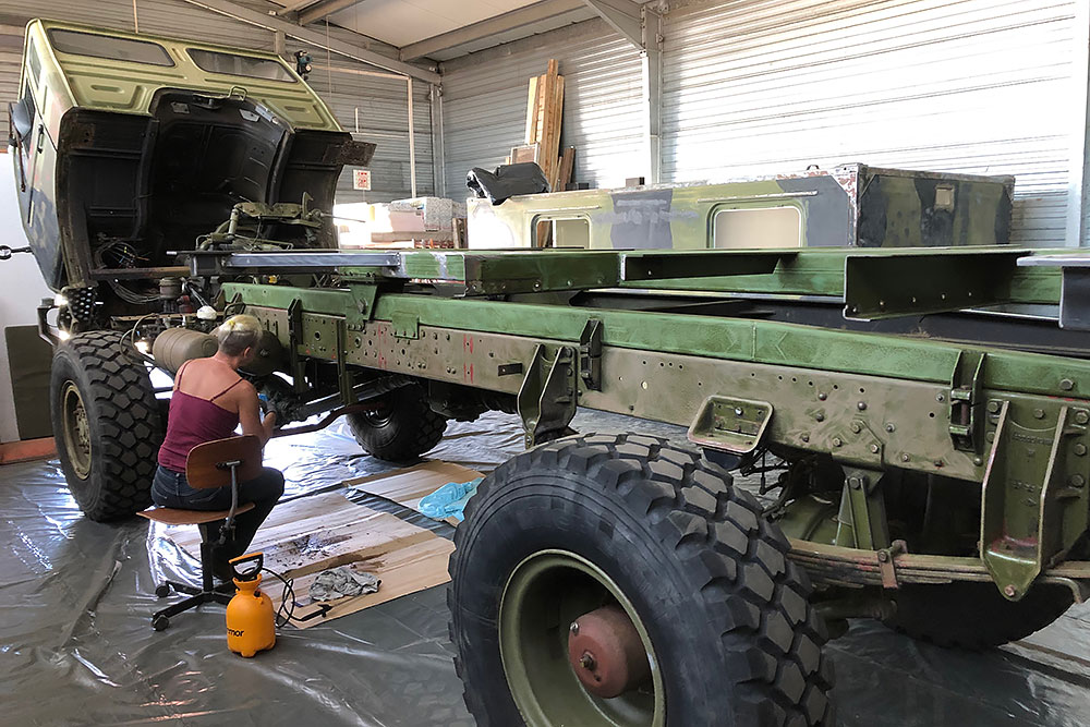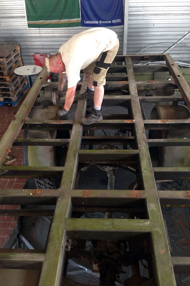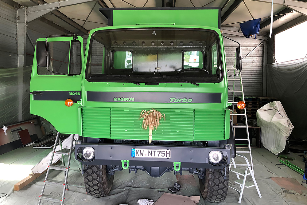 August 2019 - Der LKW wurde von den Soldaten einmal in Wachs getaucht! Es folgt daher vor der erneuten Lackierung wochenlanges reinigen, schleifen, spachteln, reinigen, schleifen, spachteln, reinigen, schleifen, spachteln, reinigen, schleifen, spachteln... würg...!