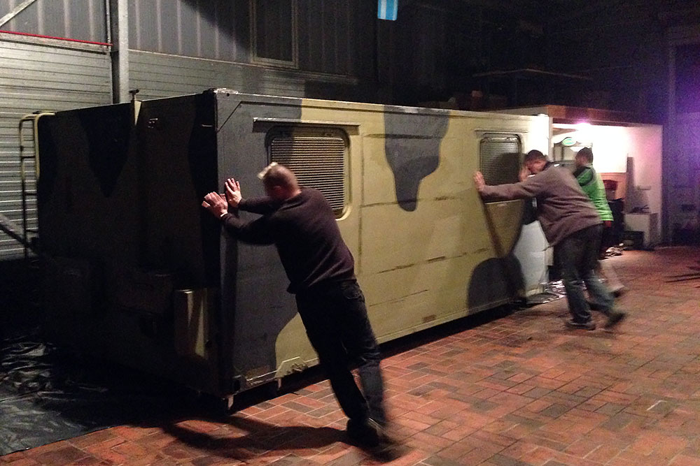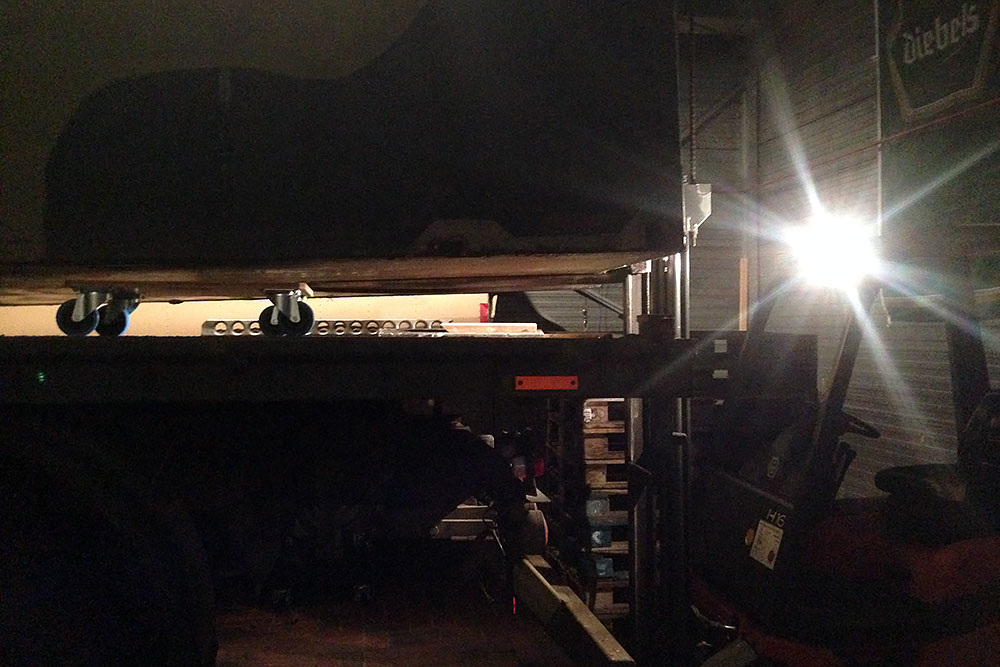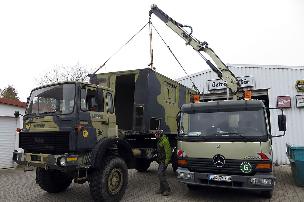 Dezember 2016 - Nach Rückkehr, Wohnungs- und Arbeitssuche im neuen zu Hause Land Brandenburg, beginnen wir das Mammut I aus der alten Heimat Niedersachsen zum Verkauf wieder fit zu machen. Beim Mammut II entfernen wir schon einmal die Einrichtung aus dem Koffer und bringen diesen vom Buckel des Mammuts runter. Ein Kran ist leider nicht zur Stelle, aber Not macht ja bekanntlich erfinderisch: