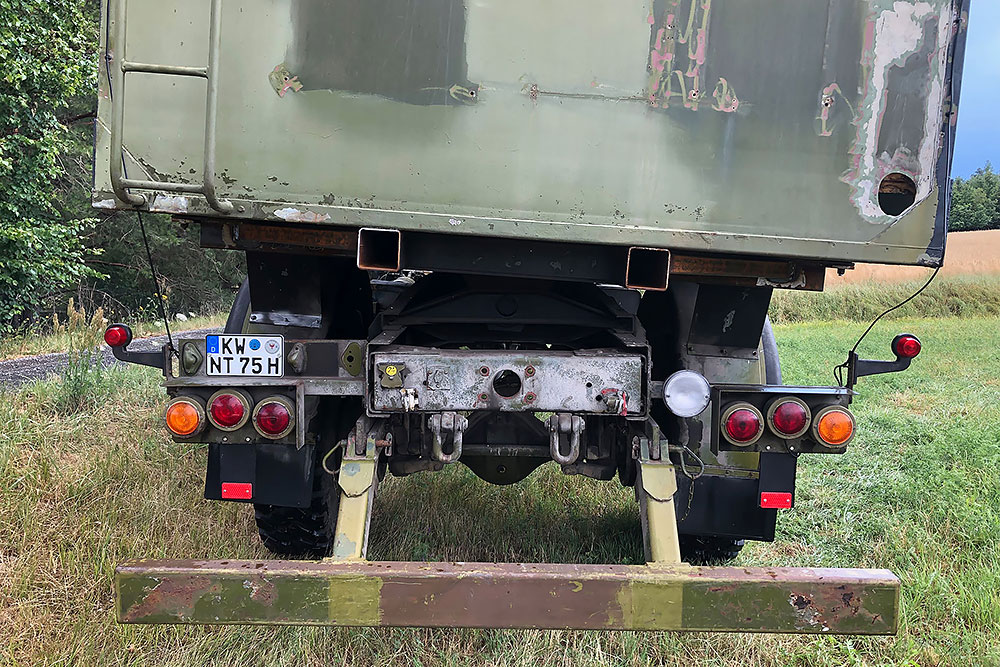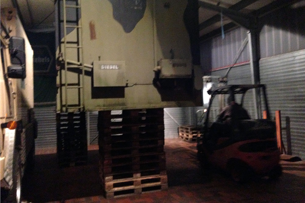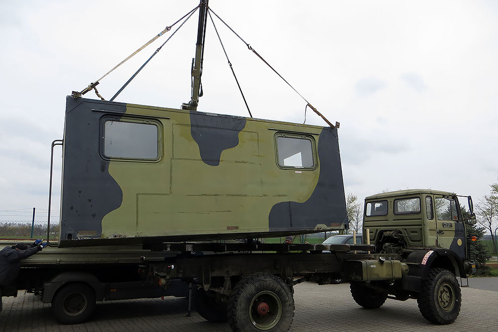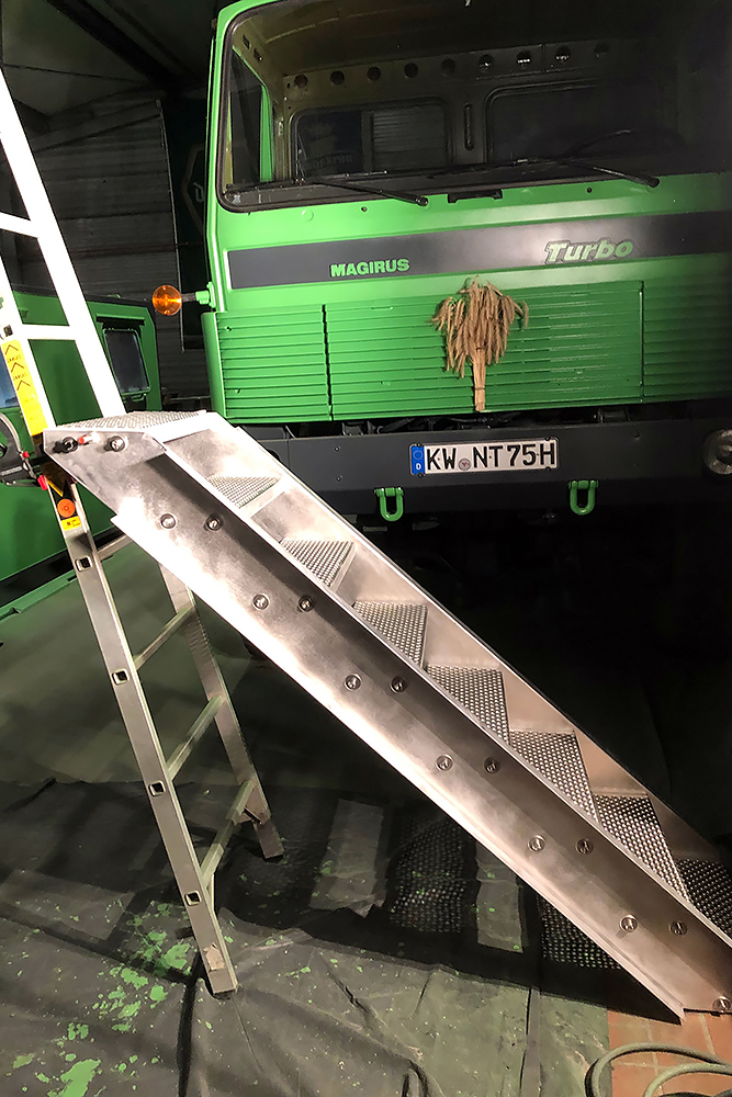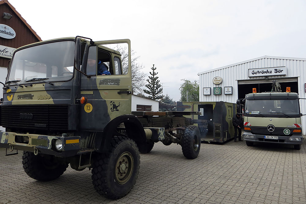 Juni 2019 - Ja, "2019"!!! Ein Jahr ist schon wieder rum und viel schlanker und leichter soll es nun "mal wieder" zum TÜV gehen. Noch haben wir keine deutschen Papiere für das dänische Gefährt, damit auch keine Zulassung! Die Heinis vom TÜV spielen seit über einem Jahr nun Katz und Maus mit uns. Irgendwo stand "geschlossener Kasten" in den Papieren nach der Einführung nach Deutschland und ohne Koffer daher keine Oldtimer-Zulassung, weil dies eine technische Änderung bedeuten würde. Das der Koffer auf der Plattform nur eine Zuladung wäre, wollten sie nicht akzeptieren. Der Koffer muss also mit, komme was wolle! Doch Steffen unser Held, schaffte es mit seinem LKW die Kiste zu verladen: