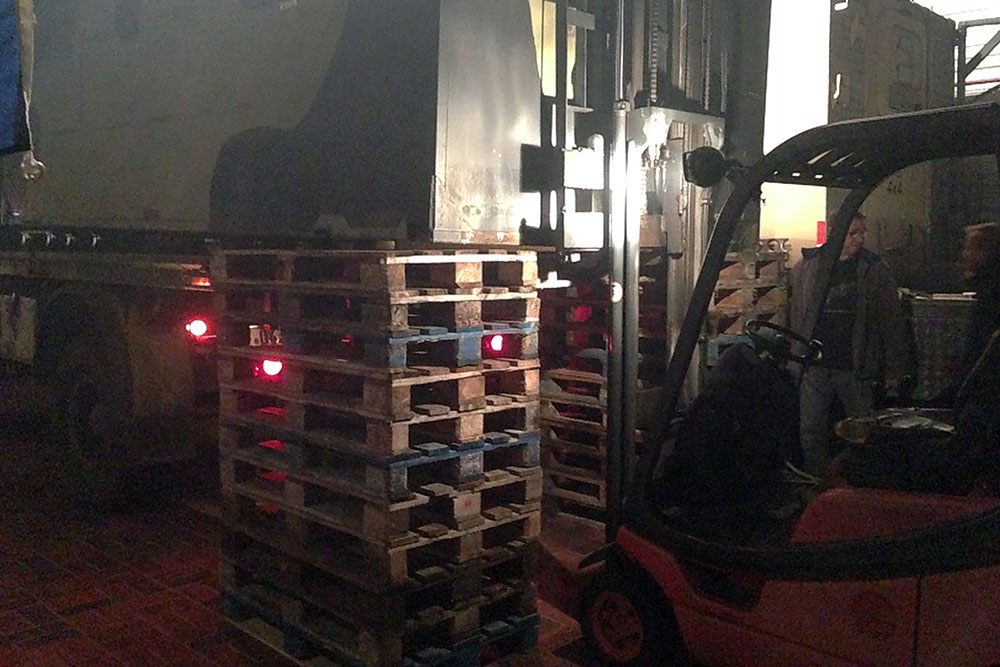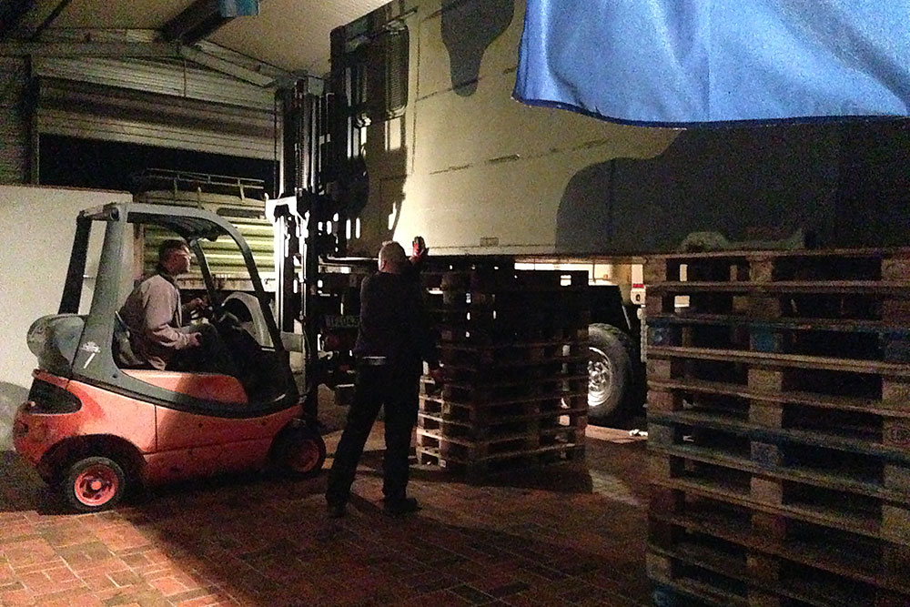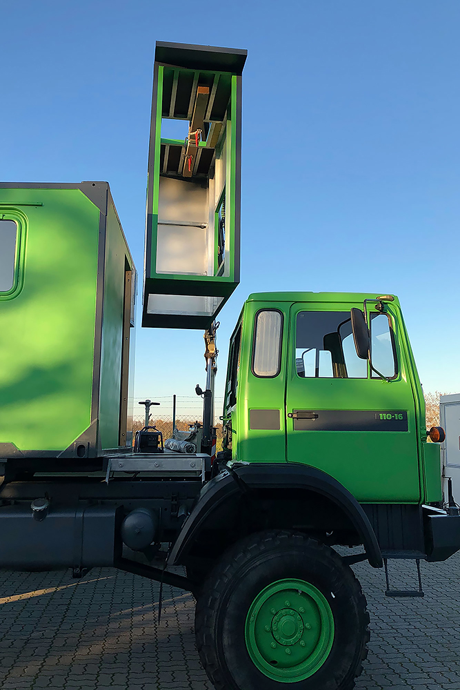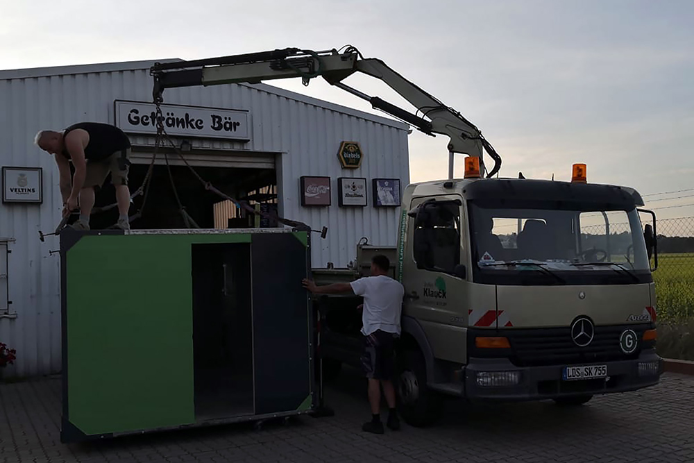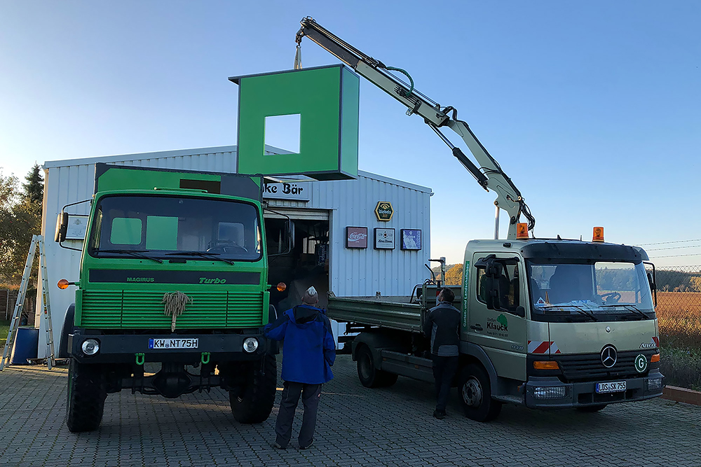 Juni 2019 - Ja, "2019"!!! Ein Jahr ist schon wieder rum und viel schlanker und leichter soll es nun "mal wieder" zum TÜV gehen. Noch haben wir keine deutschen Papiere für das dänische Gefährt, damit auch keine Zulassung! Die Heinis vom TÜV spielen seit über einem Jahr nun Katz und Maus mit uns. Irgendwo stand "geschlossener Kasten" in den Papieren nach der Einführung nach Deutschland und ohne Koffer daher keine Oldtimer-Zulassung, weil dies eine technische Änderung bedeuten würde. Das der Koffer auf der Plattform nur eine Zuladung wäre, wollten sie nicht akzeptieren. Der Koffer muss also mit, komme was wolle! Doch Steffen unser Held, schaffte es mit seinem LKW die Kiste zu verladen: