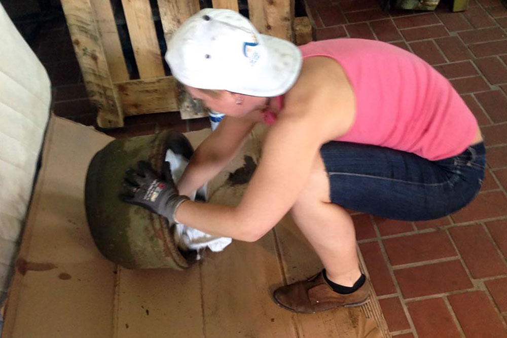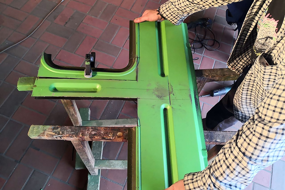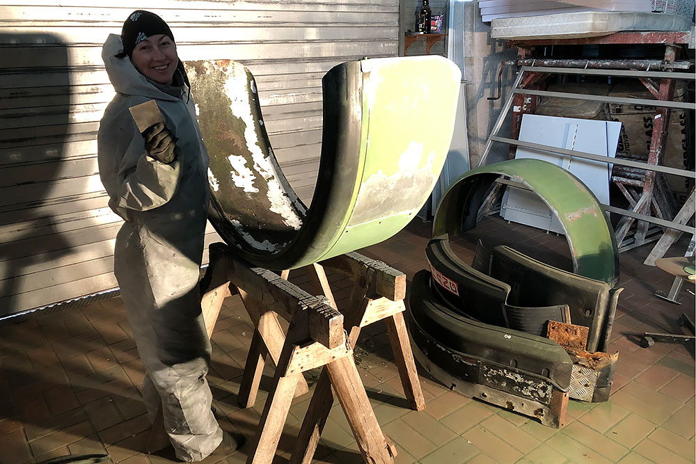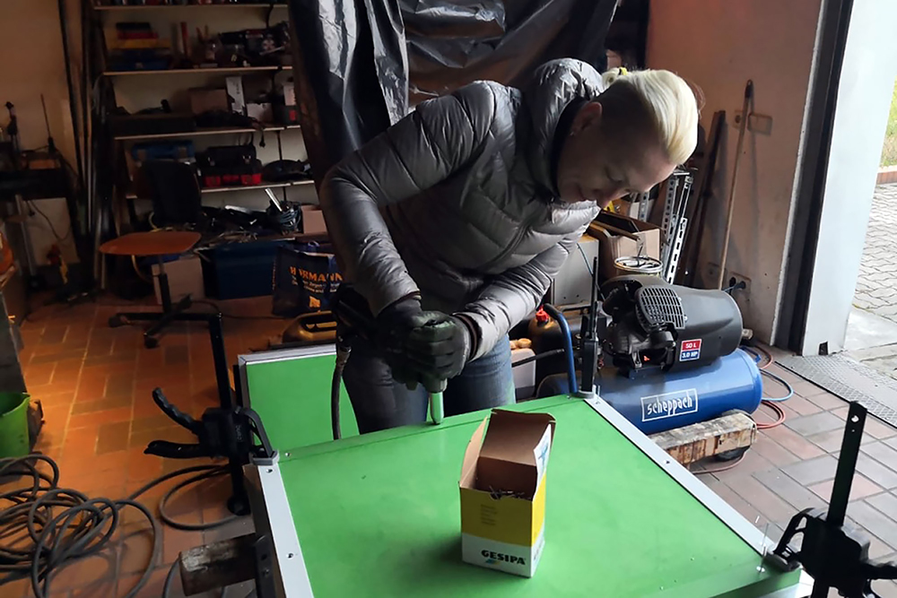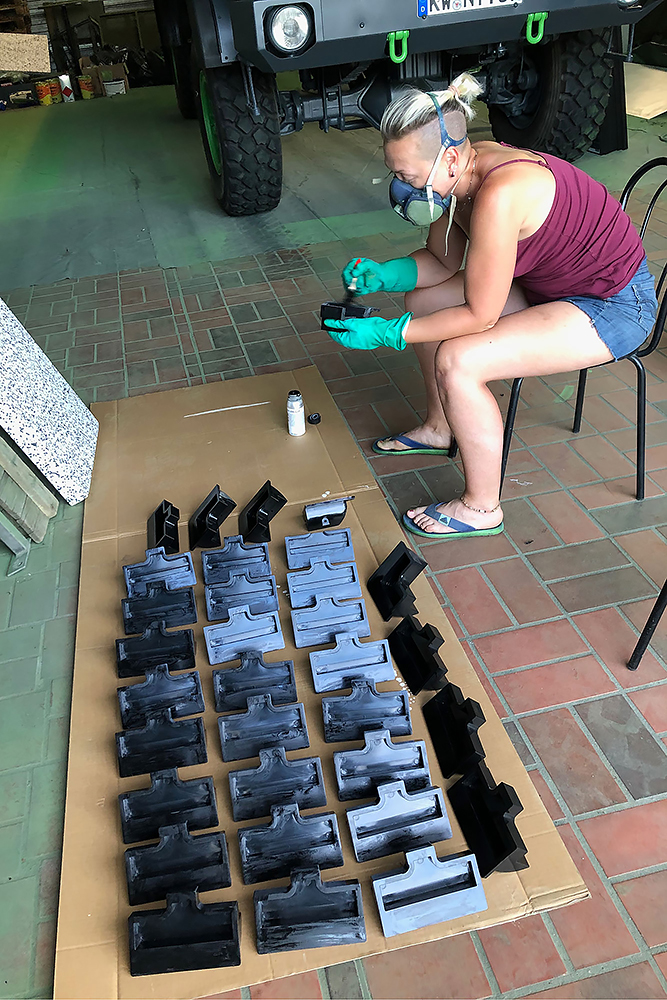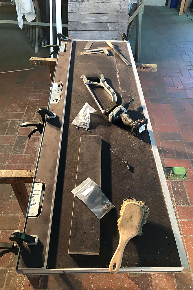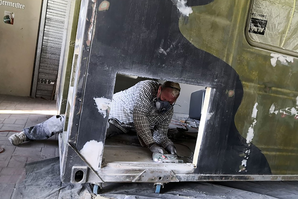 Am Montag den 21.09.2020 ist TÜV-Tag, wir werden sehen! In der Zwischenzeit verbringen wir das Wochenende mit Arbeiten an der Einstiegstreppe. Natalia behandelt die Aluminiumteile mit Pelox RE Rostentferner, um sie vor dem Lackieren anzuätzen und ich baue eine Edelstahlhalterung für die Aufhängung der Treppe.