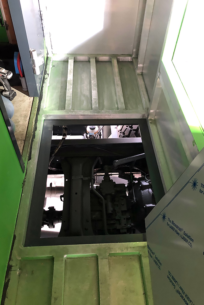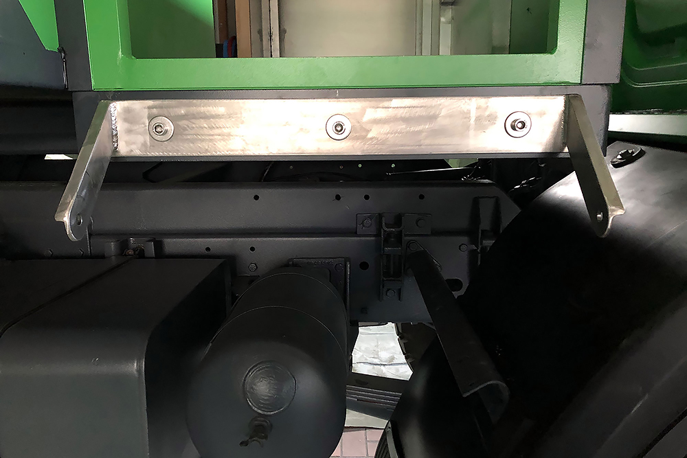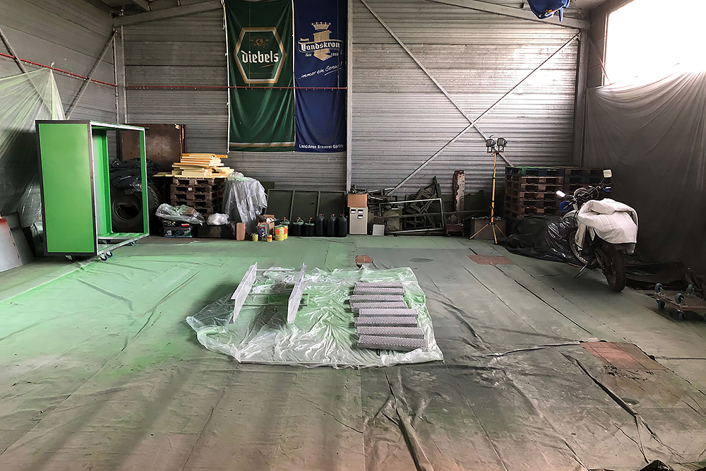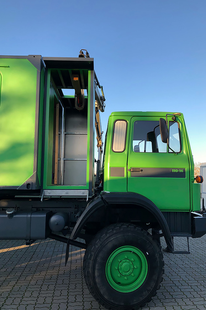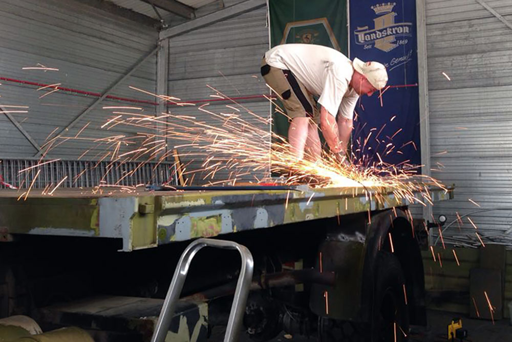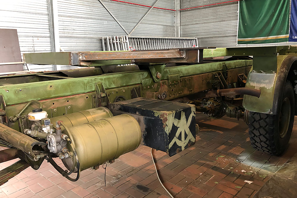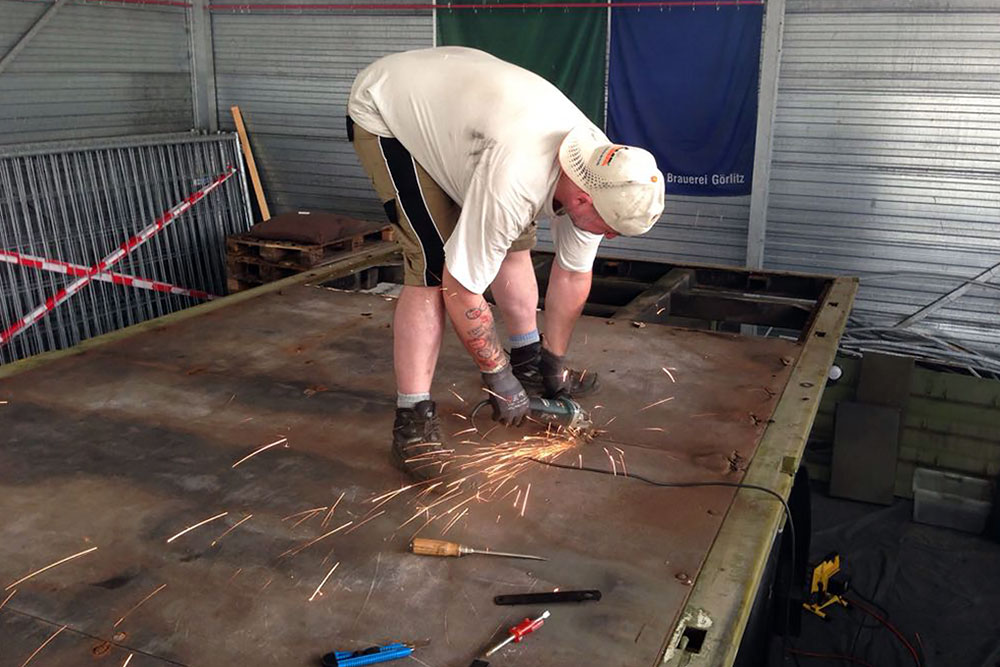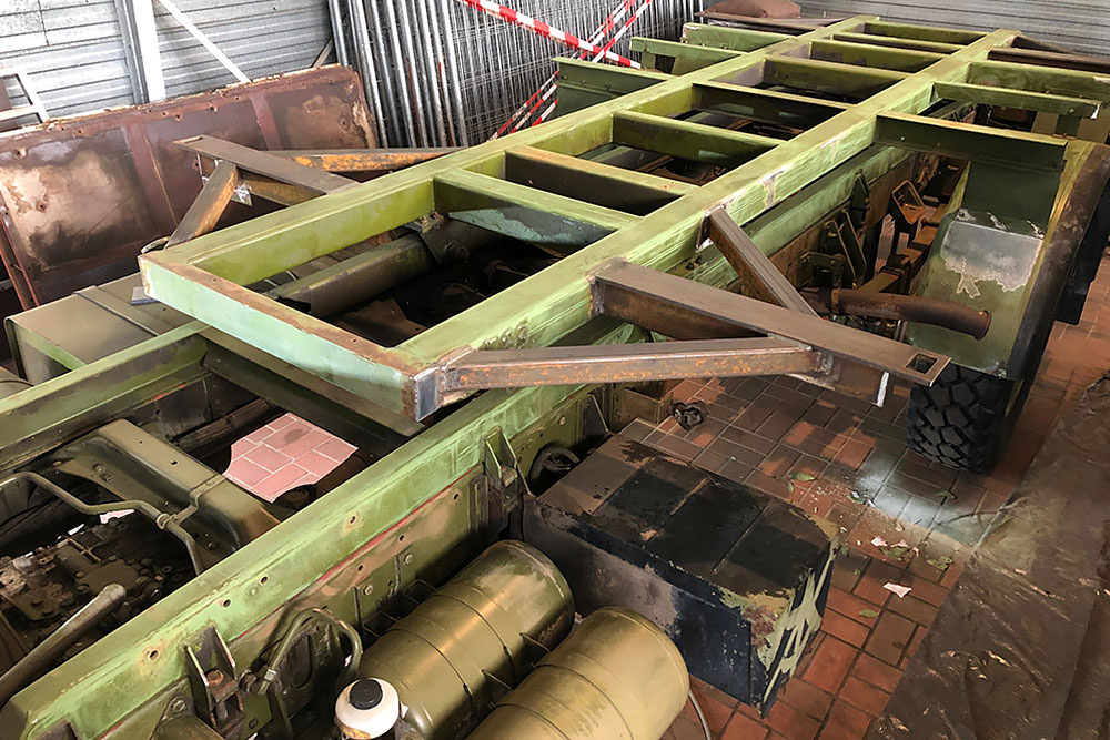 Juni 2018 - Der Kompressor arbeitet auch nicht besonders gut und bekommt daher zum besseren Antrieb einen neuen Riemen verpasst. Danach wird abgespeckt! Der Koffer soll um 180° gedreht und ohne rückseitigem Überstand wieder auf den LKW. Daher kürzen wir die Plattform ein und zerlegen diese bis nur noch übrig bleibt, was auch wirklich benötigt wird. Eine neue Halterung brauchen wir so oder so. Alles Unnötige haben wir in der Zwischenzeit demontiert und der Wiederverwertung zugeführt.