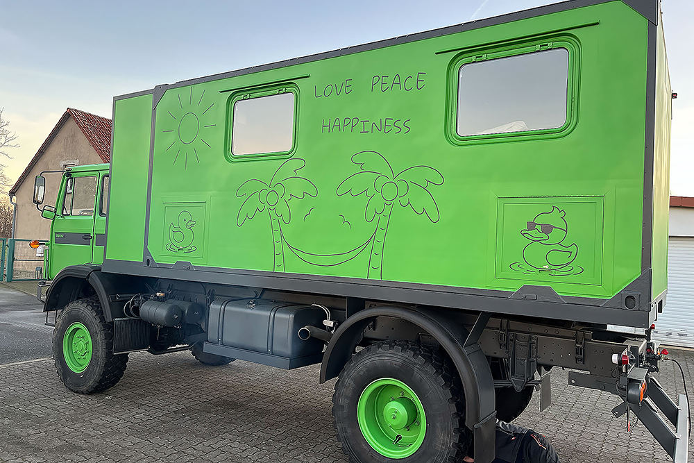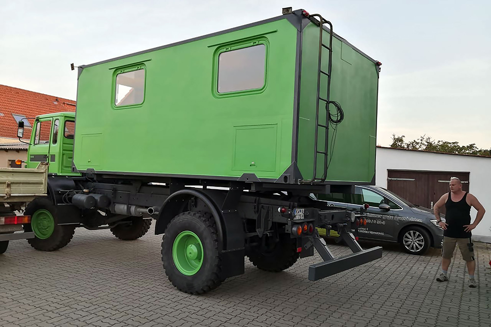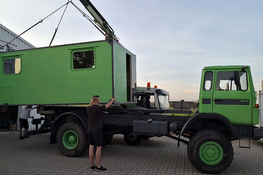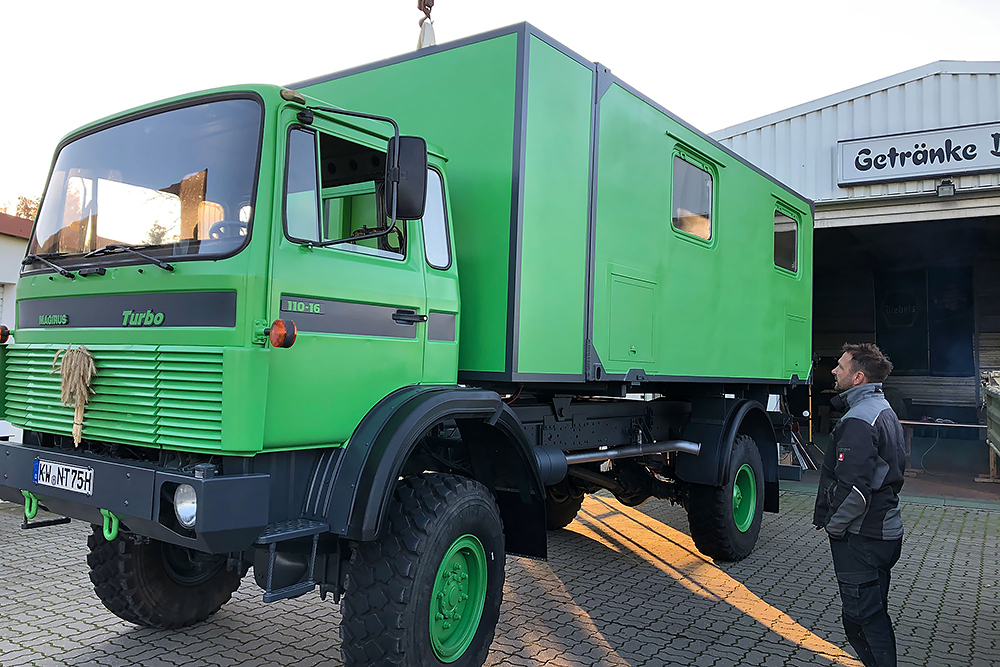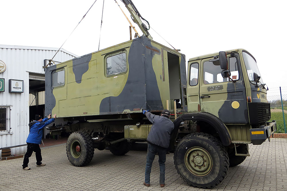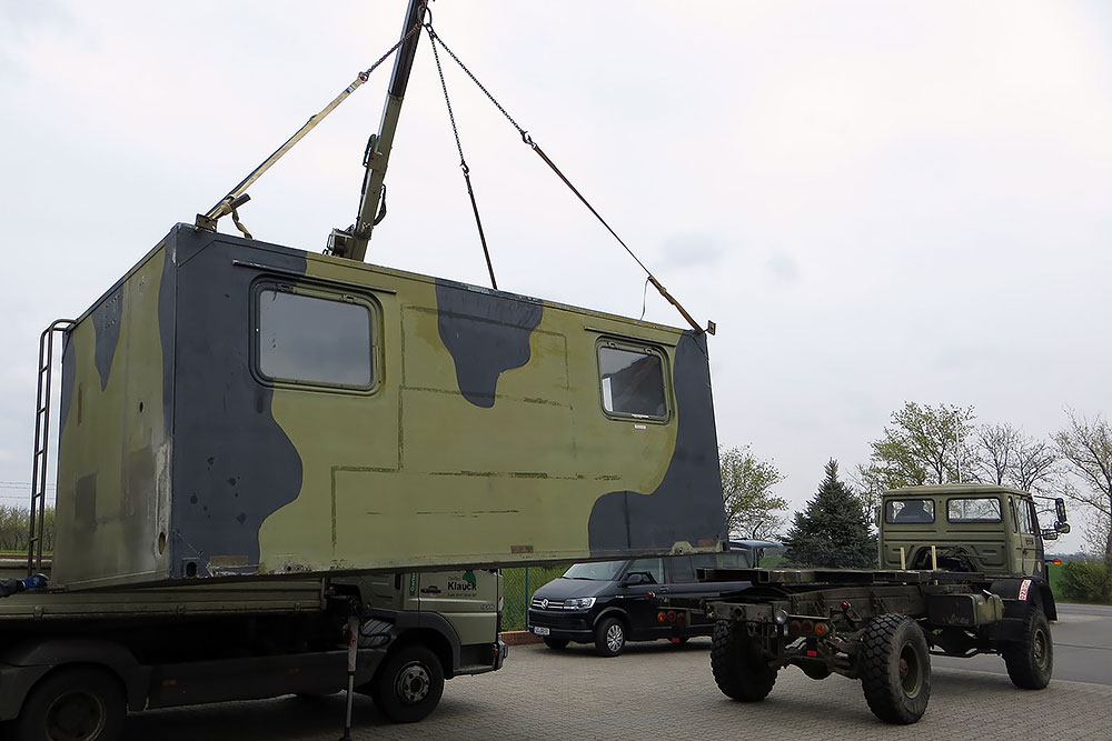 14.09.2020 - Es ist soweit, heute ist Hochzeit! Der Wohnkoffer wird in seine vorgesehene Position gehoben und soll diesen Platz nie wieder verlassen. Eigentlich ist es erst die Verlobung, denn es fehlt ja noch die Verlängerung des Koffers! Da ich aber das Loch für den Durchstieg erst nach dem TÜV-Termin in die Fahrerkabine schneiden möchte, muss diese noch unten bleiben. Steffen unser Held holt die letzte Kraft aus seinem LKW-Kran und zur unser großen Freude schafft er es auch mit letzter Mühe, keine 5kg mehr hätte der Wohnkoffer wiegen dürfen!