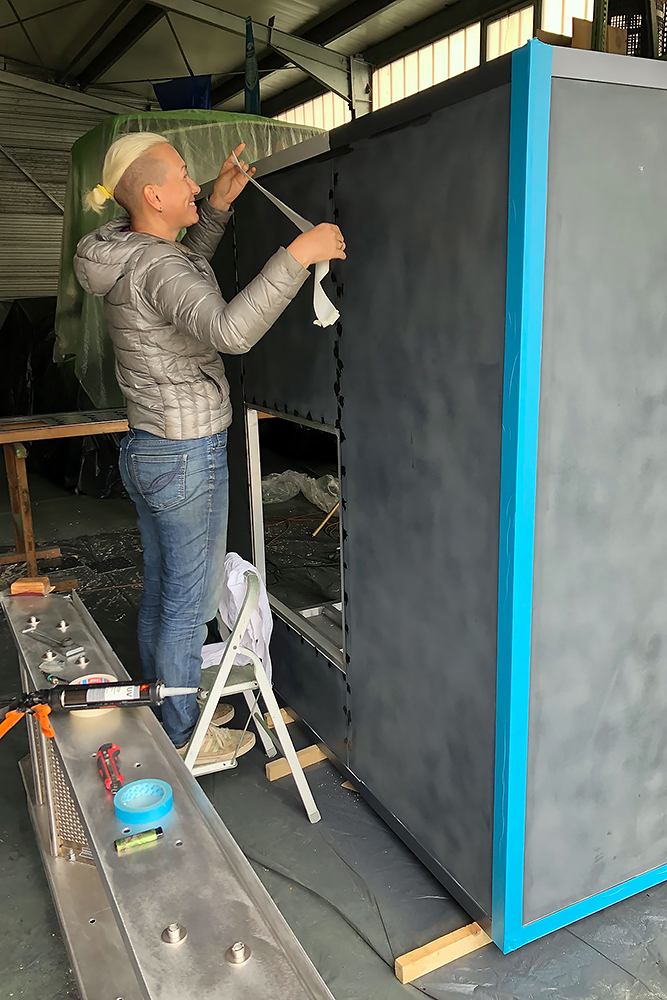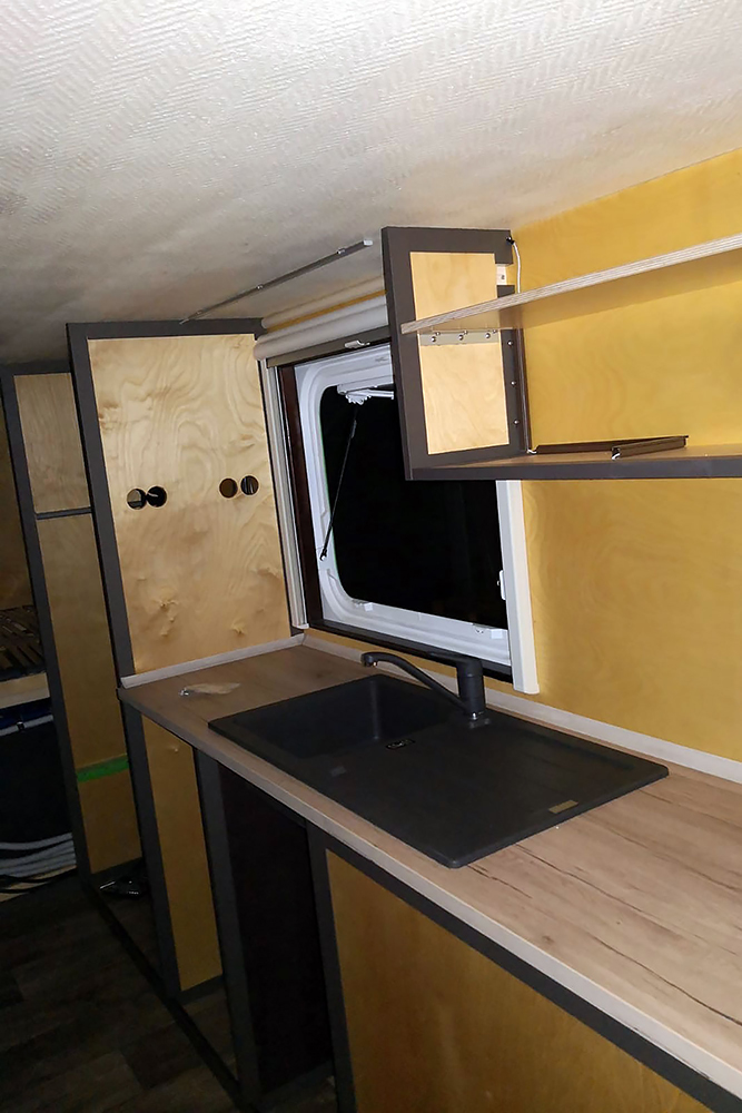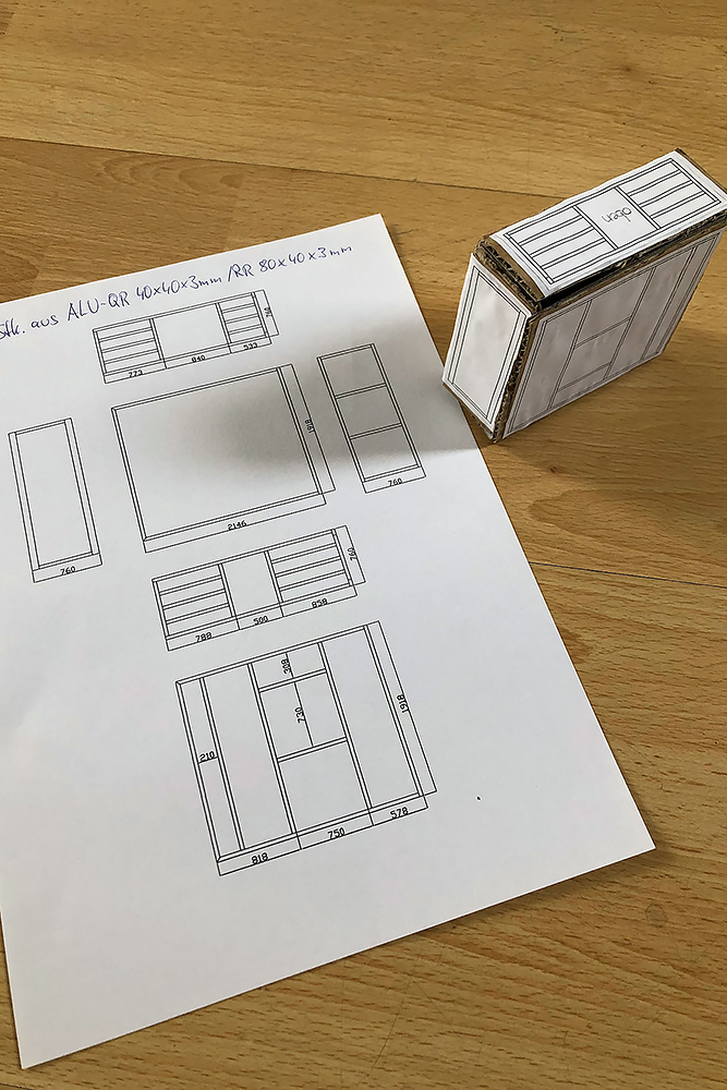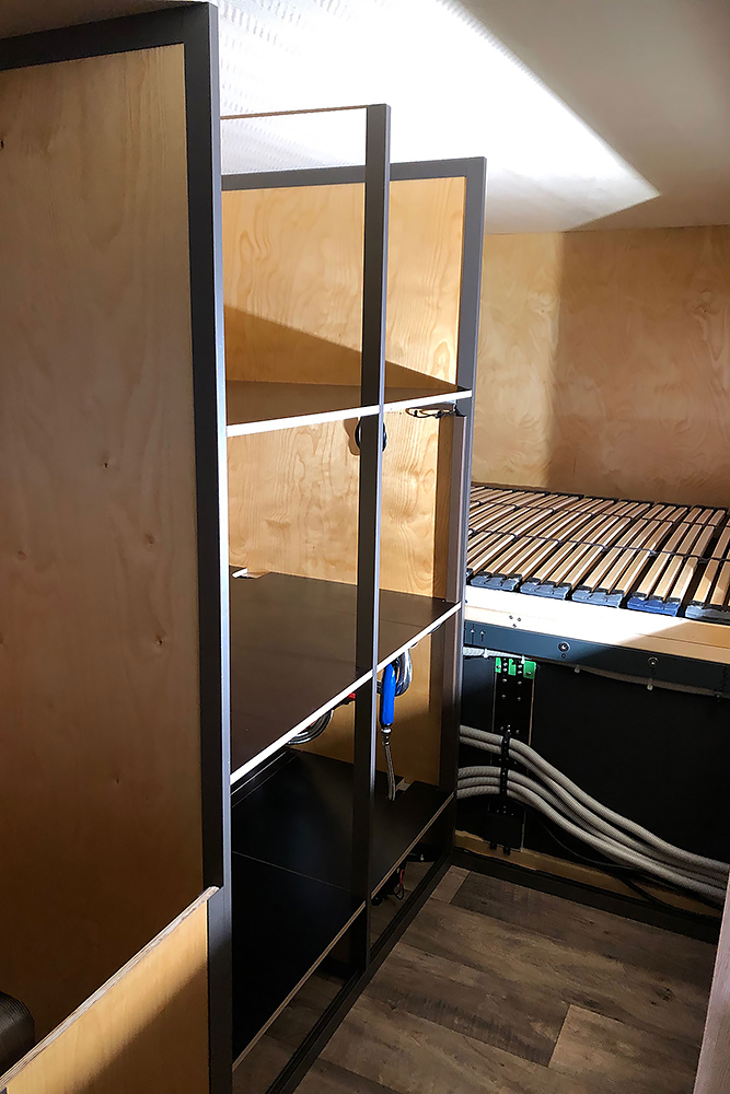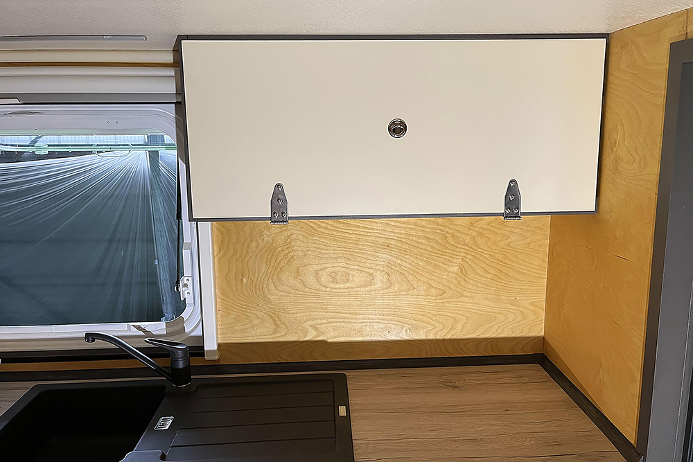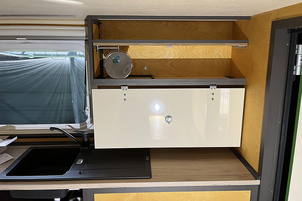 Die Schranktüren fertigen wir aus leichten Alu-Verbundplatten. Im Hängeschrank in der Küche findet dahinter auch noch ein versteckter Kosmetikspiegel seinen Platz: