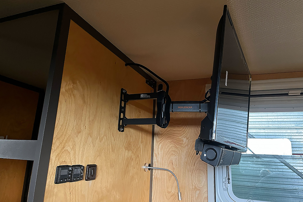 Ein Fernseher mit Soundbar für die regnerischen Tage ist auch bereits angebracht: