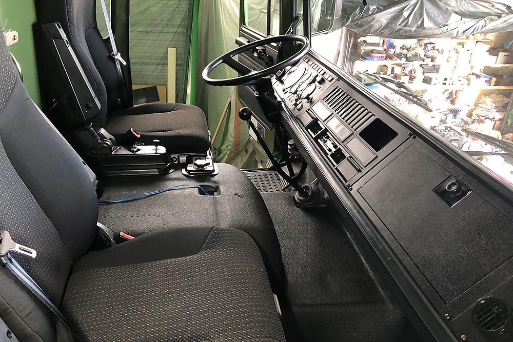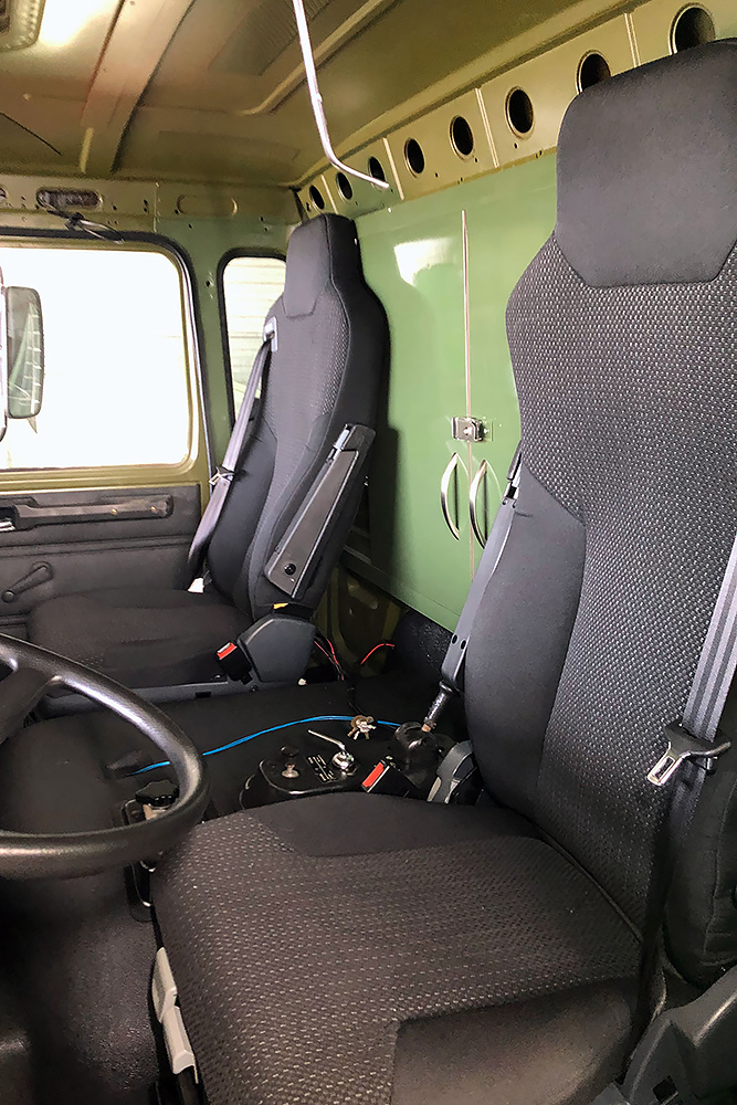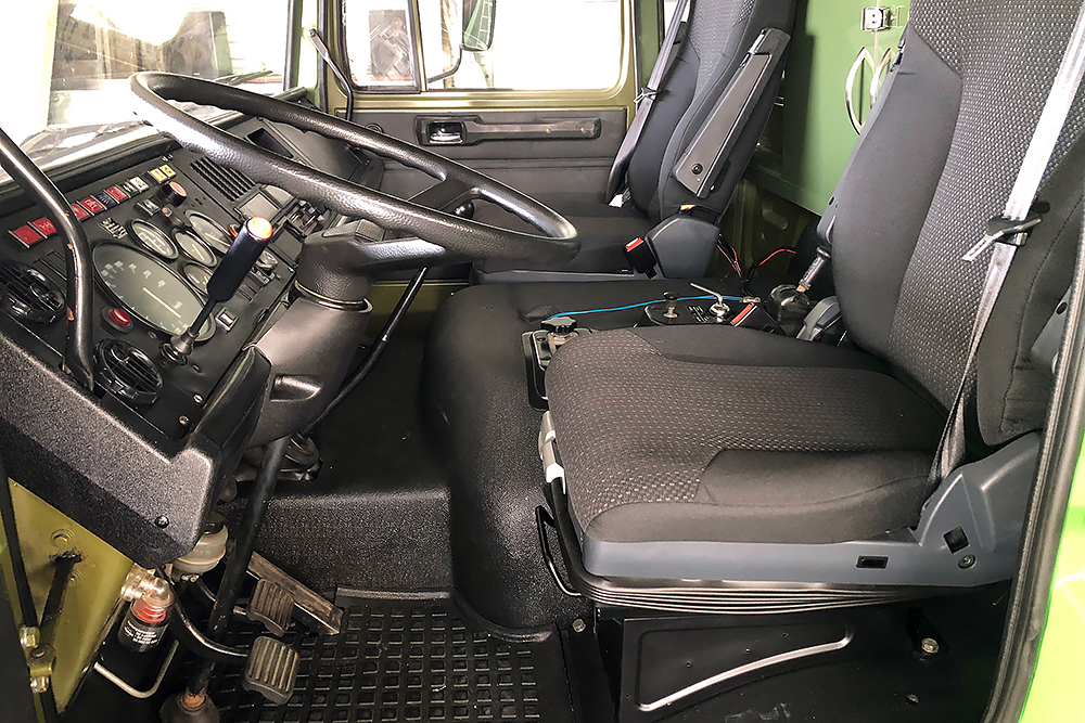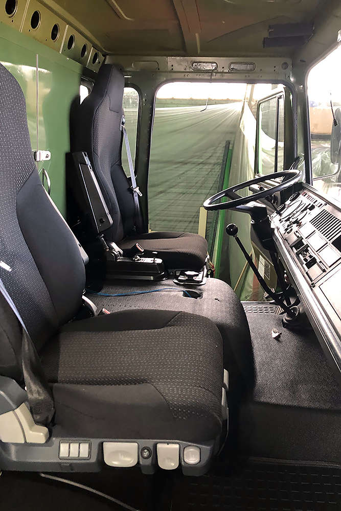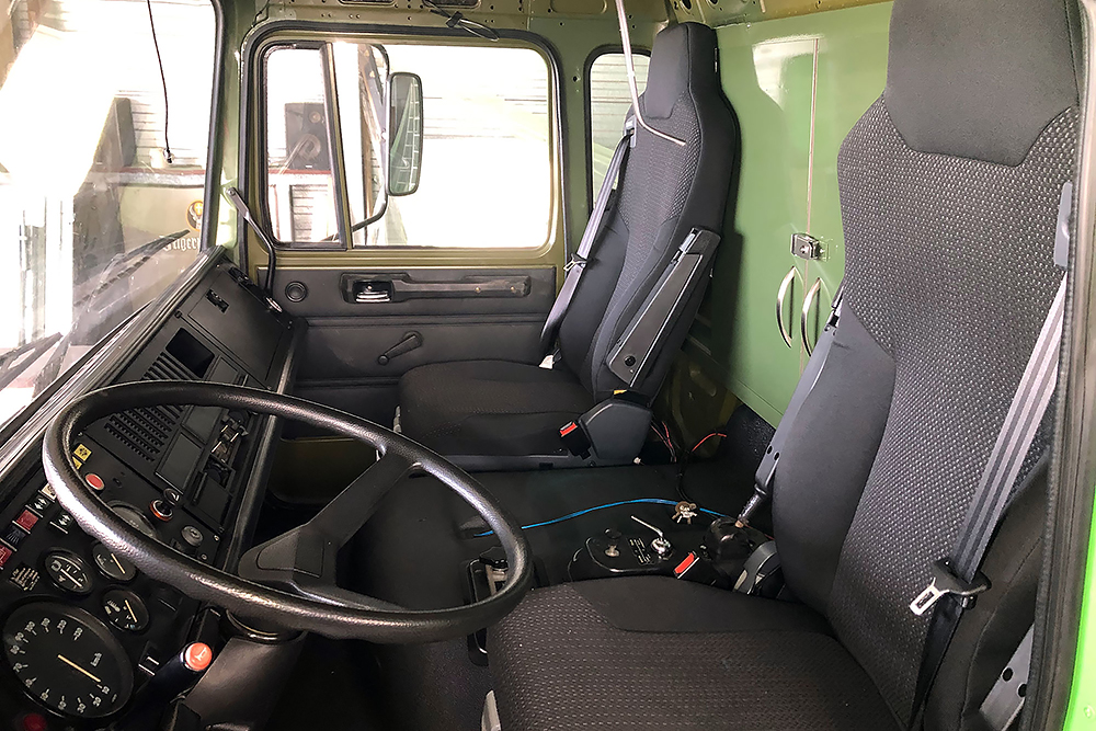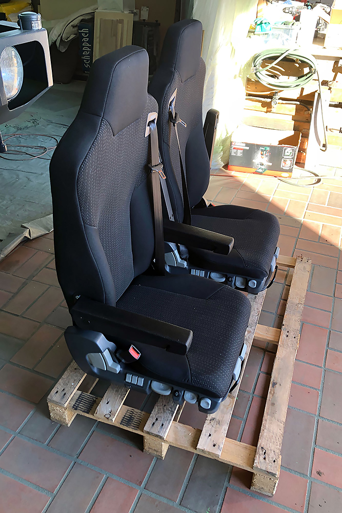 Die Kabine haben wir schallisoliert und durch 2 luftgefederte ISRI-Sitze, die aus Holland eingeflogen kamen, etwas bandscheibenfreundlicher gestaltet: