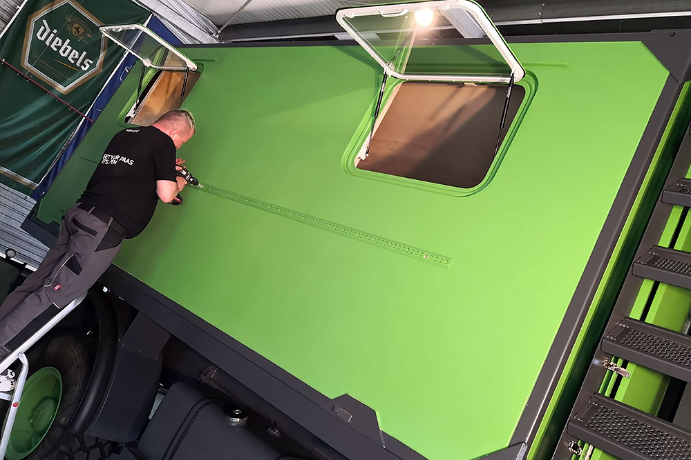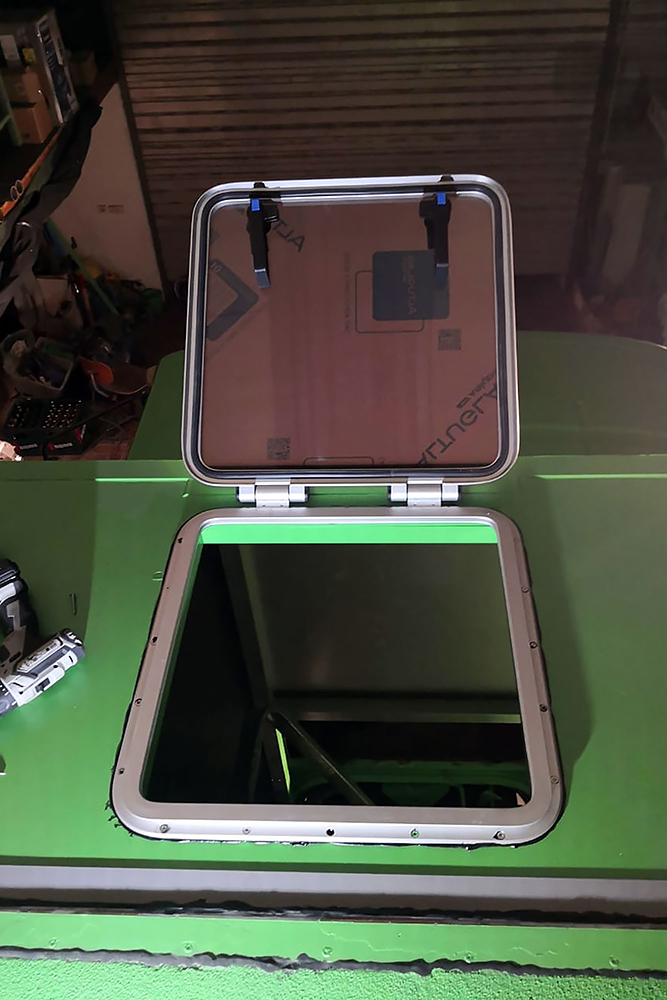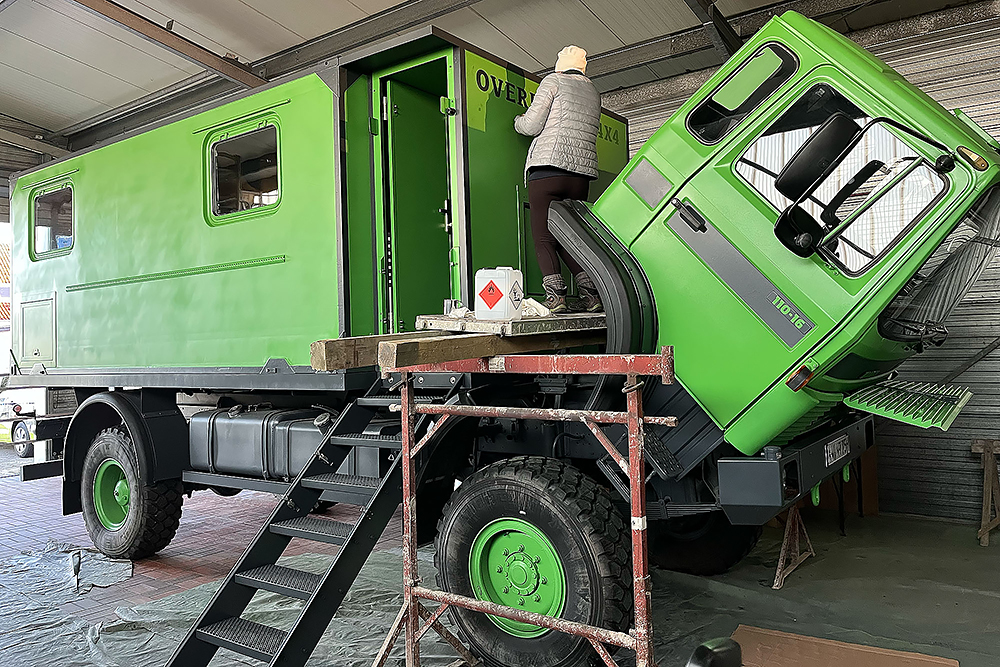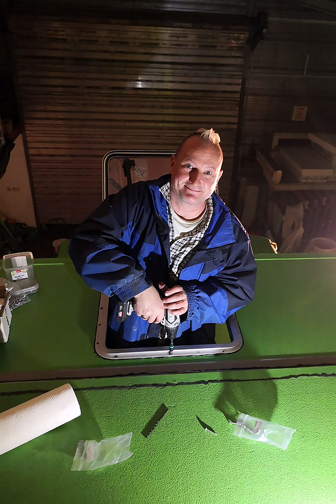 Wir verkleben die Erweiterung des Wohnkoffers an den vorhandenen mit reichlich Sikaflex 252 und sichern alles mit 22 Stk. Schrauben M10 ab, das wird reichen! Und weil wir gerade in Fahrt sind, kleben und schrauben wir auch noch die Dachluke drauf, montieren die Einstiegstreppe und verlegen neue Kabel für die Starterbatterien. Diese befinden sich jetzt zwecks Diebstahl- und Kälteschutz nicht mehr draußen, sondern in einem Staufach im Wohnkoffer.