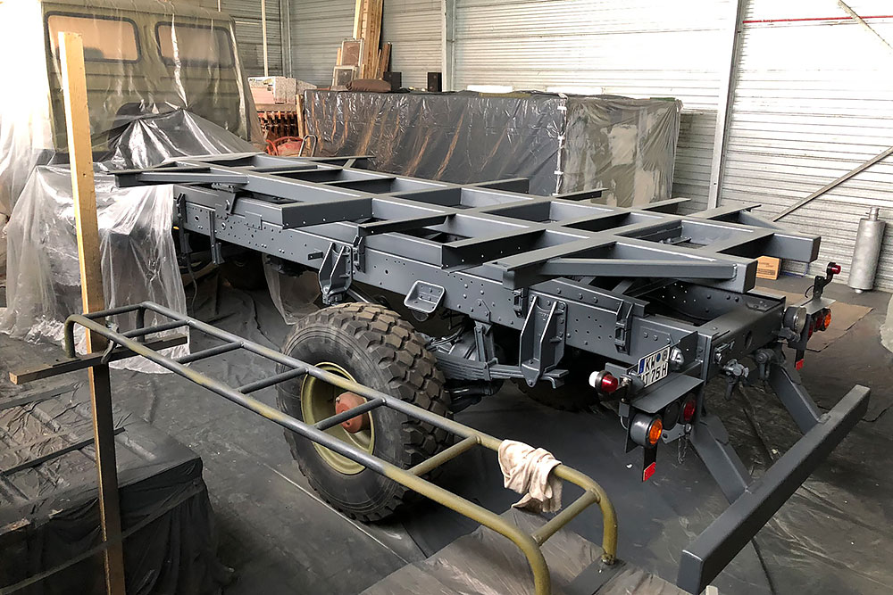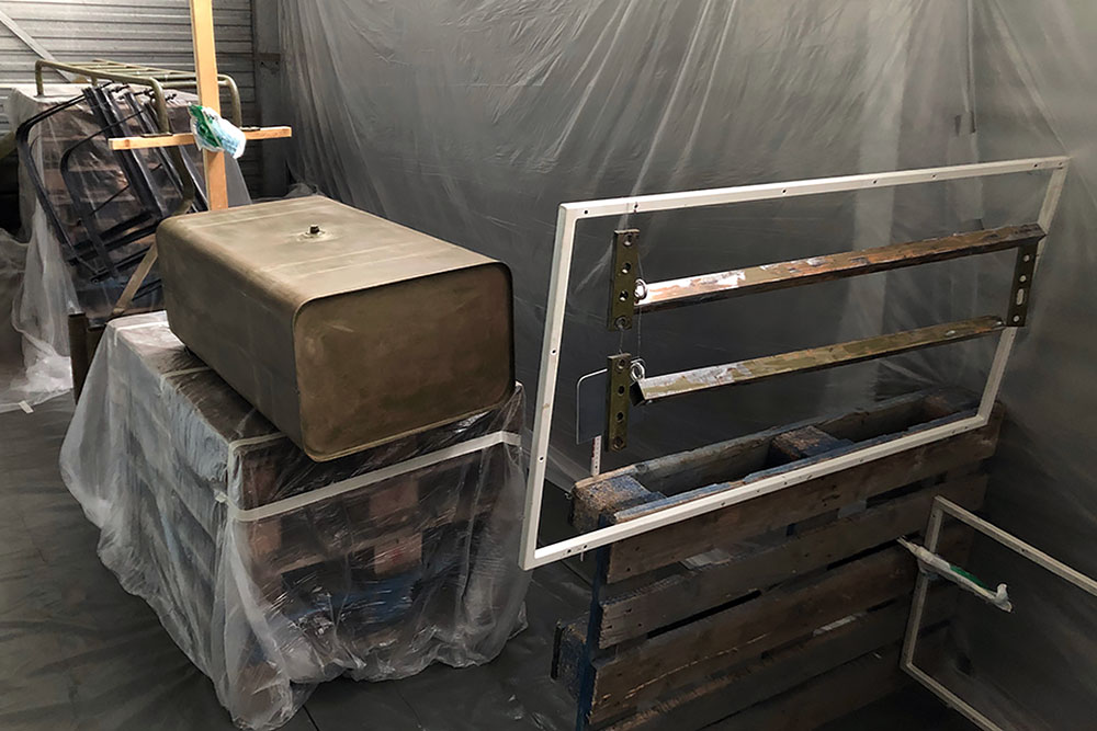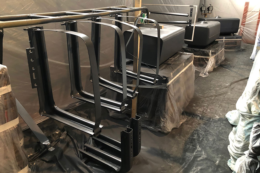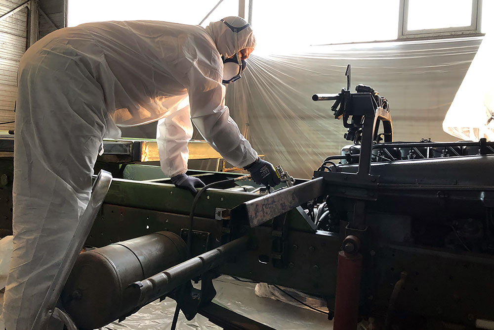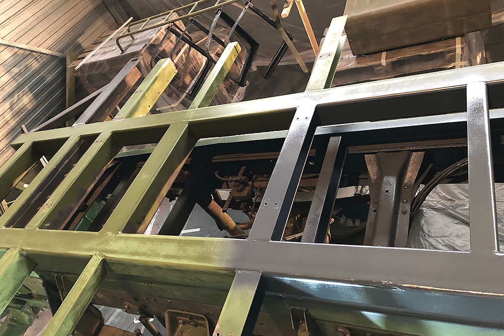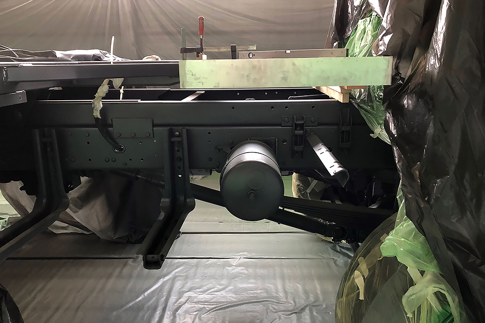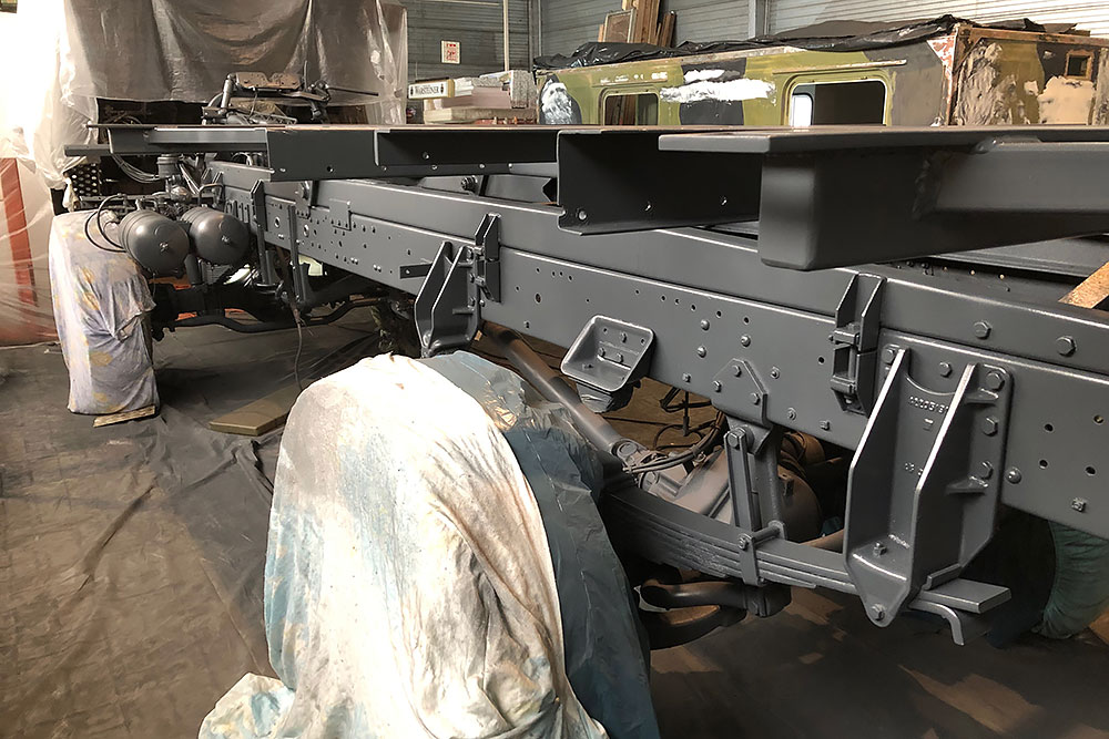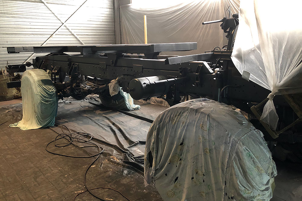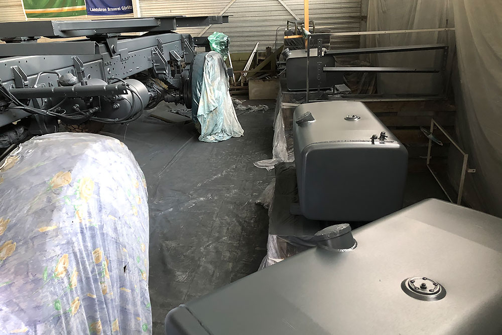 Oktober 2019 - Das Fahrgestell samt neuen Tanks lackieren wir 30h lang, mit 20L Lack, anthrazitgrau: