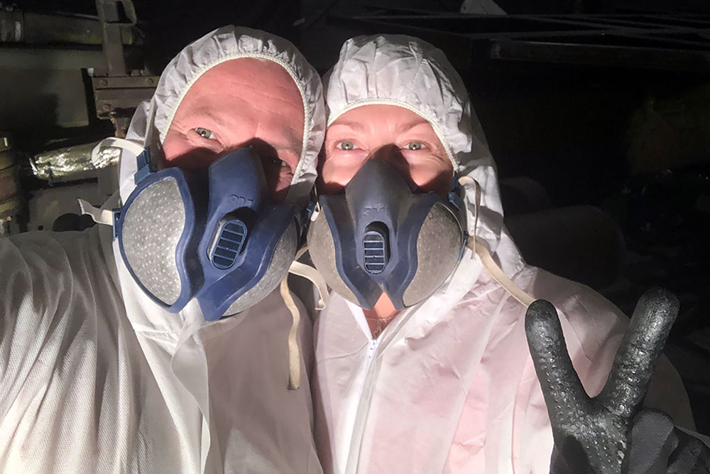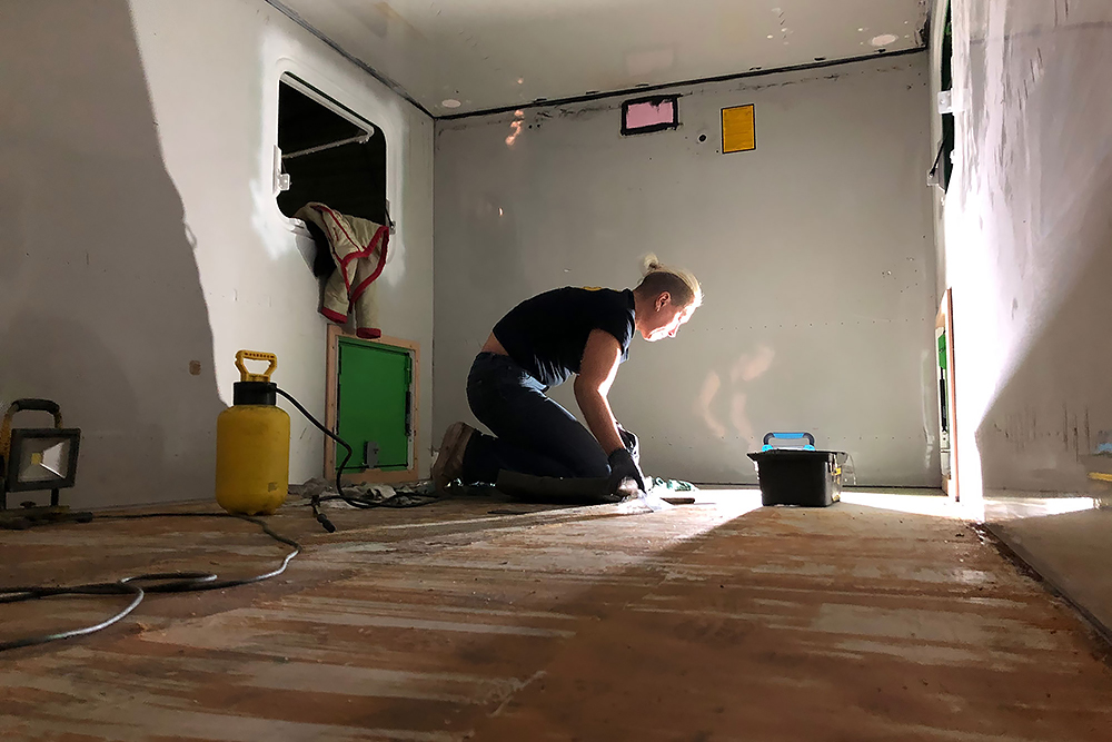 Mit Hilfe von uns speziell entwickenten Techniken, entfernen wir als nächstes den für die dänischen Soldaten bombensicheren, Armeestiefel tauglichen, daher vollverklebten, alten PVC-Bodenbelag aus dem Wohnkoffer. OK, ich helfe nur mit und mache ein paar Fotos, was für eine Sch...arbeit, eine wahnsinnige Quälerei, meine Frau ist echt die beste und stärkste!