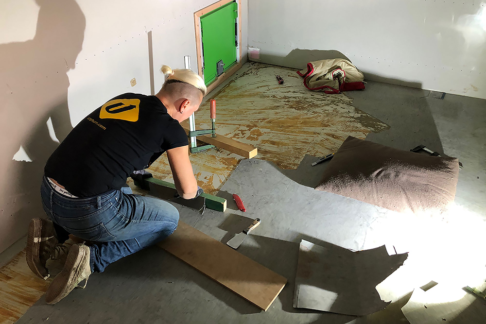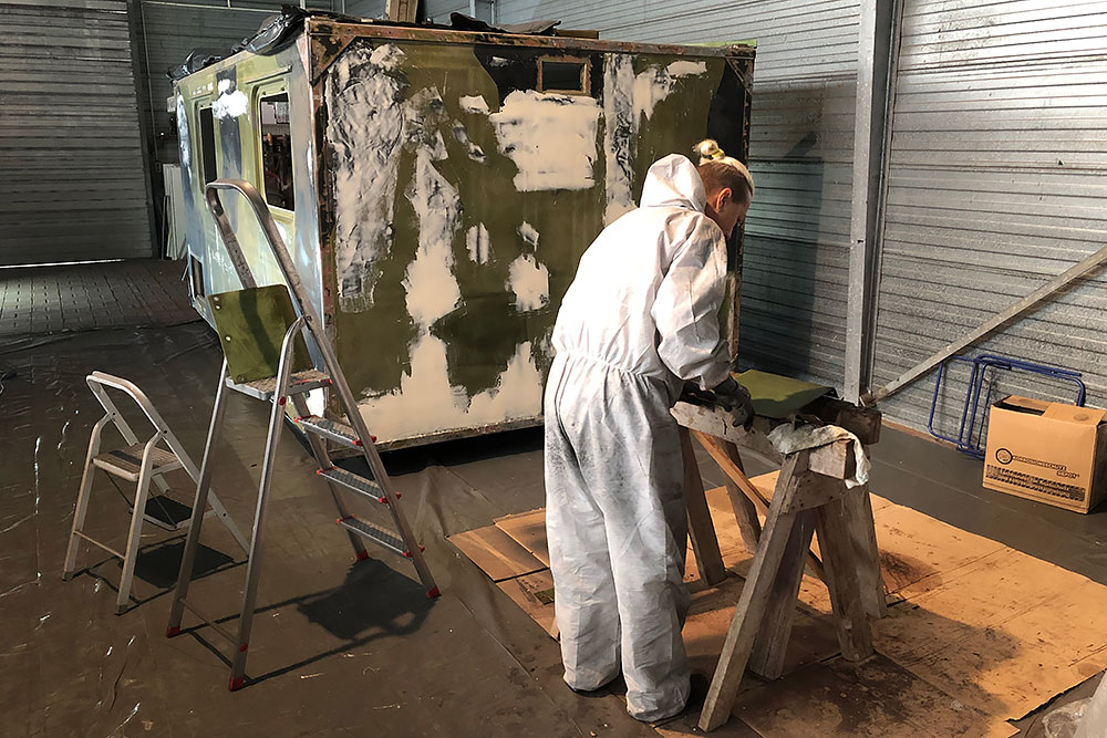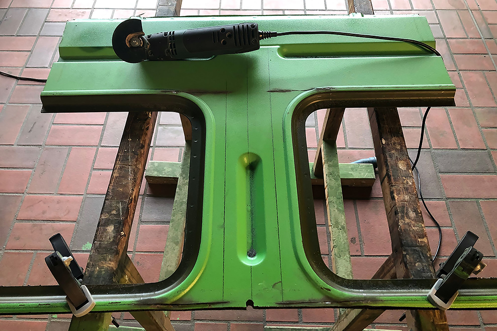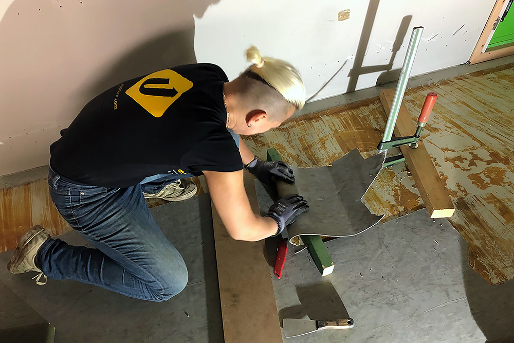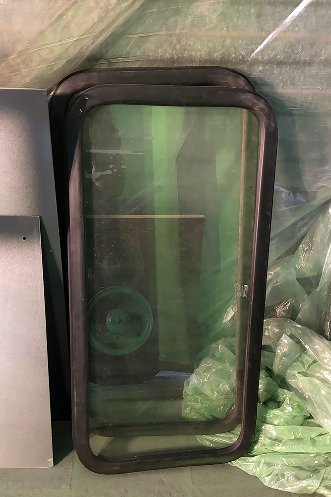 100 Cuttermesserklingen später, macht sie sich daran die Kleberreste vom Boden zu entfernen. Ich schneide unterdessen den Durchgang in die Fahrerkabine und entschließe mich dazu, aus zwei breiten = zwei schmale Scheiben zu machen. Das heißt: Teile sauber ausschneiden und einpassen, wieder einschweißen, schleifen und spachteln, wieder schleifen und wieder spachteln, die Schablonen für die neuen Scheiben anfertigen und die Dichtungen kürzen... War echt ne tolle Idee von mir! Fast so schön wie alten verklebten Vinylboden zu entfernen!