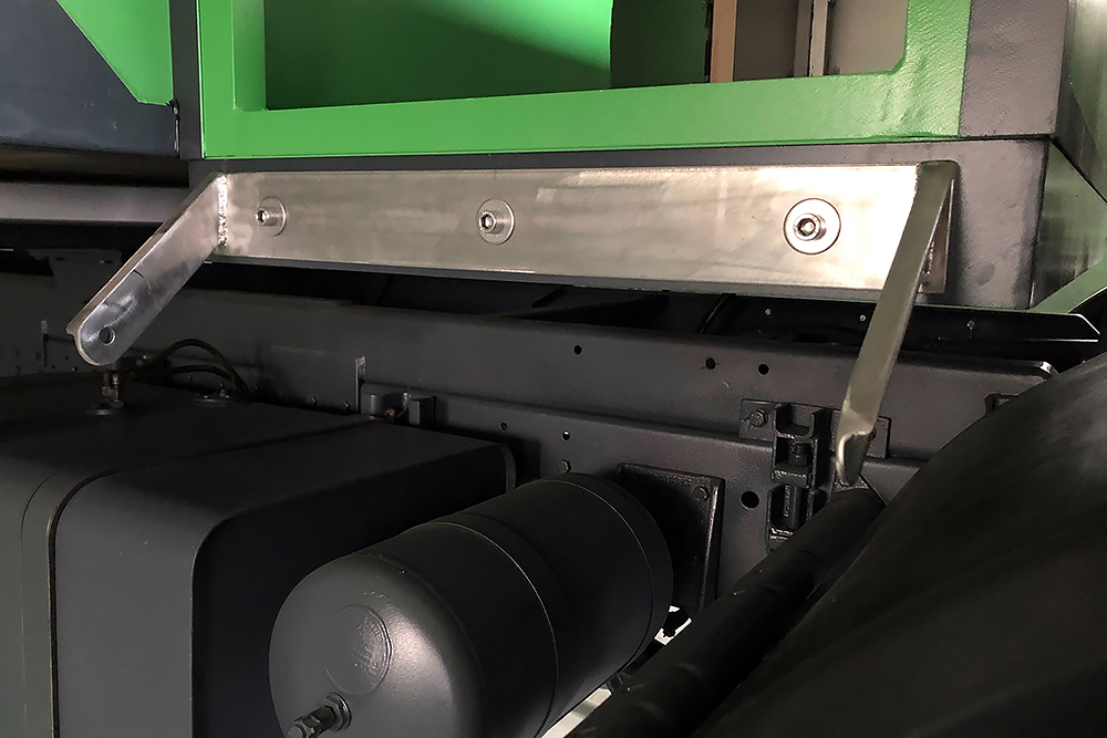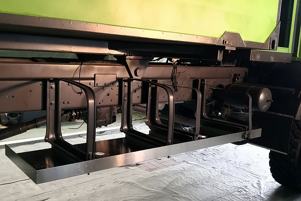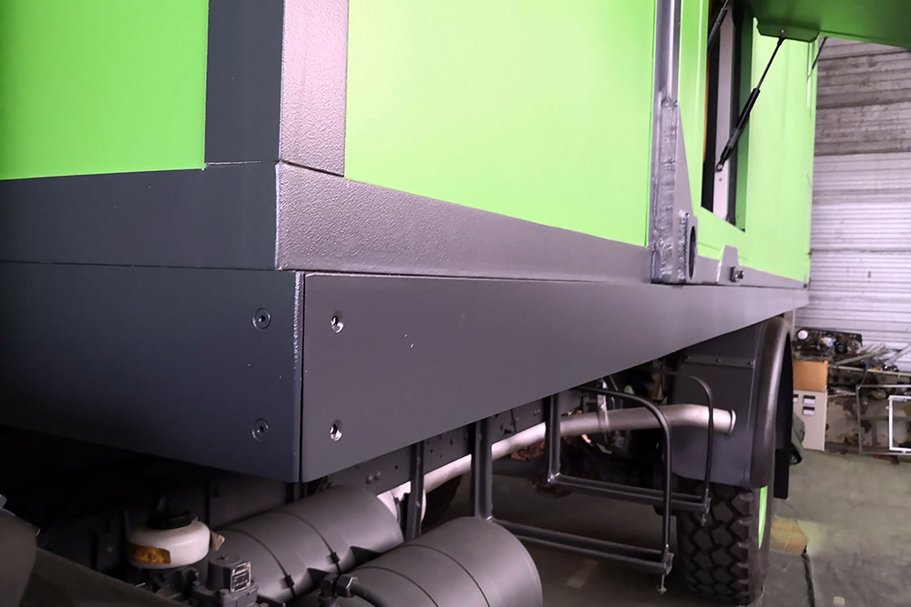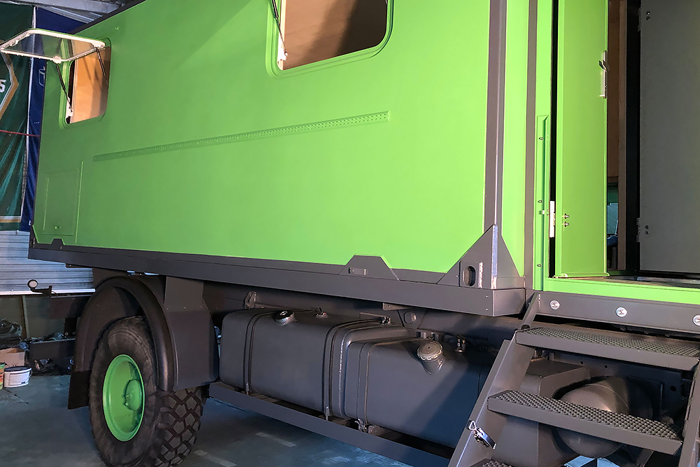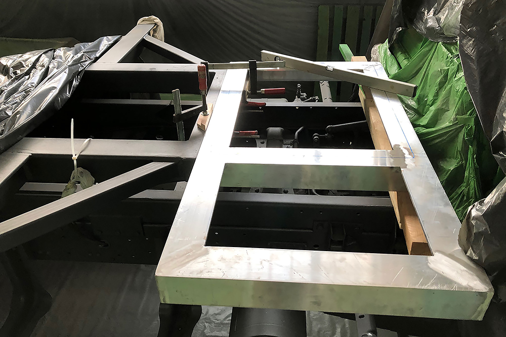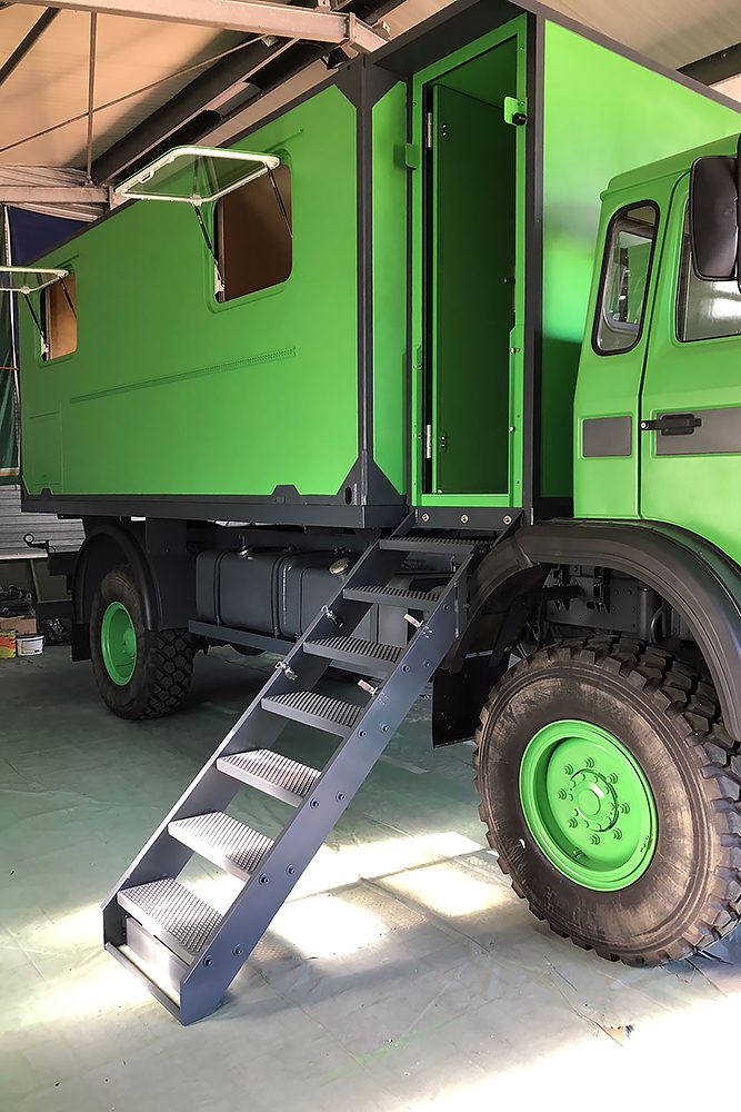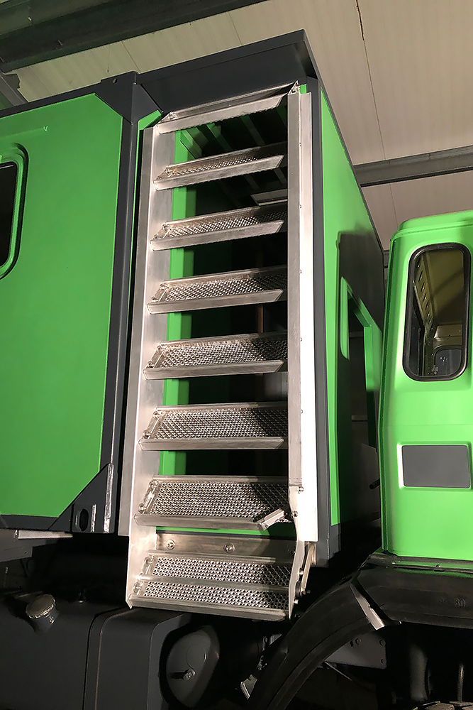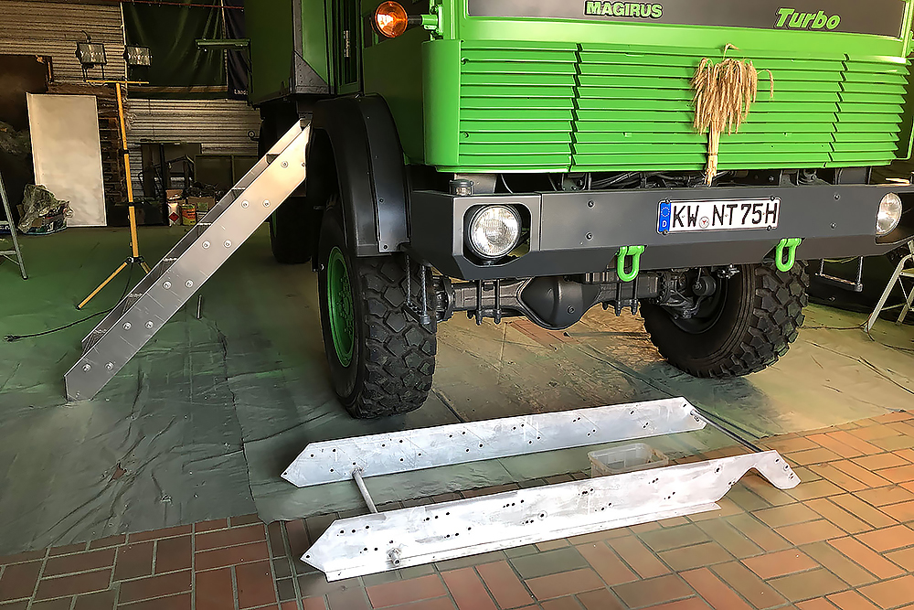 Die Einstiegstreppe haben wir noch einmal komplett neu gebaut und um eine Trittstufe gekürzt. Die Dieseltanks bekamen Wannen perpasst, damit sich später in der Wüste kein Sandblech an den Tankhaltern verkeilen kann und der Koffer, rein aus optischen Gründen, bekam noch einen Aluminiumrahmen aus Winkel 100 x 50 x 3 mm: