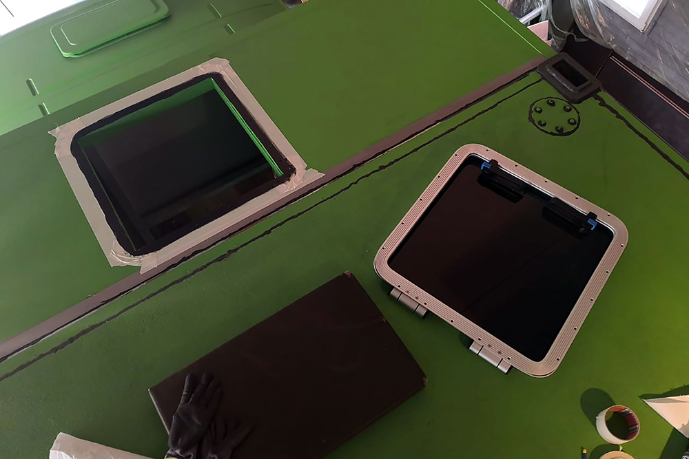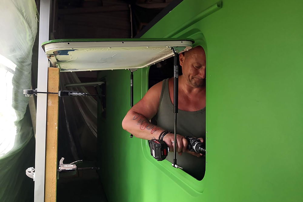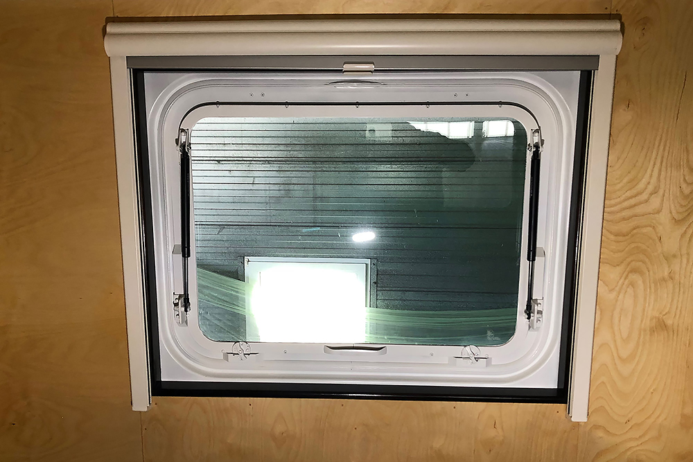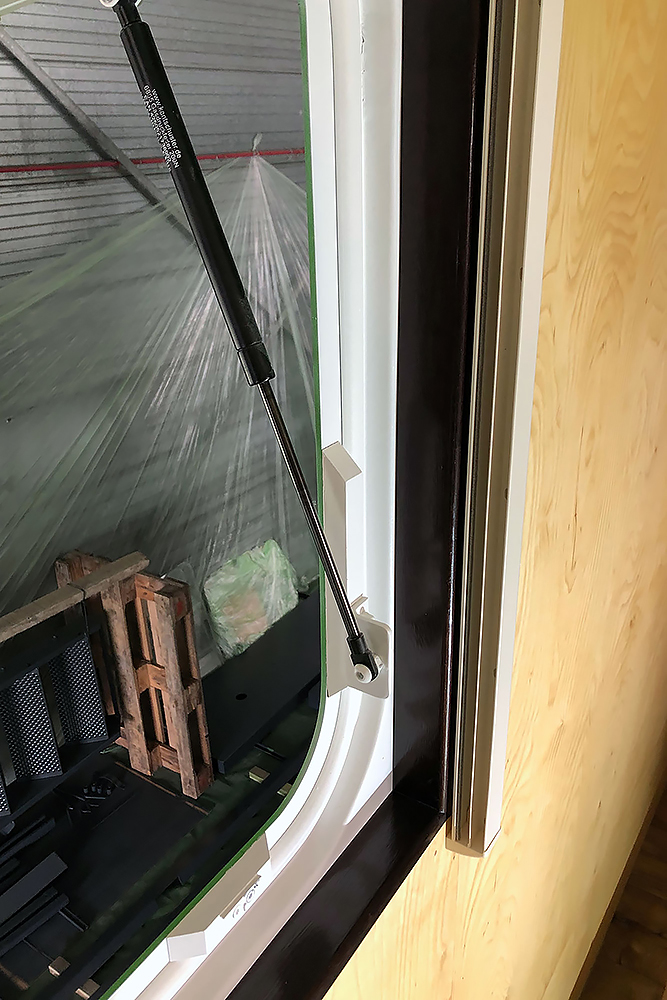 09.08.2020 - Zwischendurch bauen wir in mühseliger Feinarbeit die Fenster um, die zuvor nur zu einer Spaltlüftung geöffnet werden konnten. Sie bekommen Gasdruckfedern und zum Schließen, Vorreiber aus dem Yachtbau verpasst.