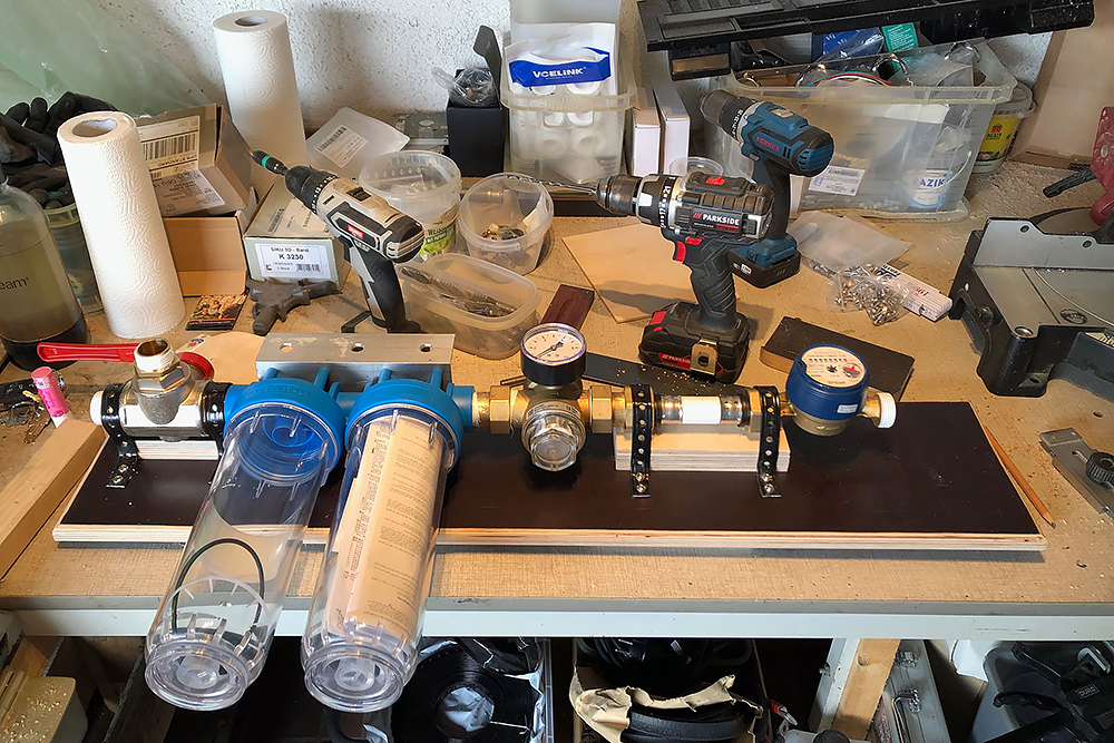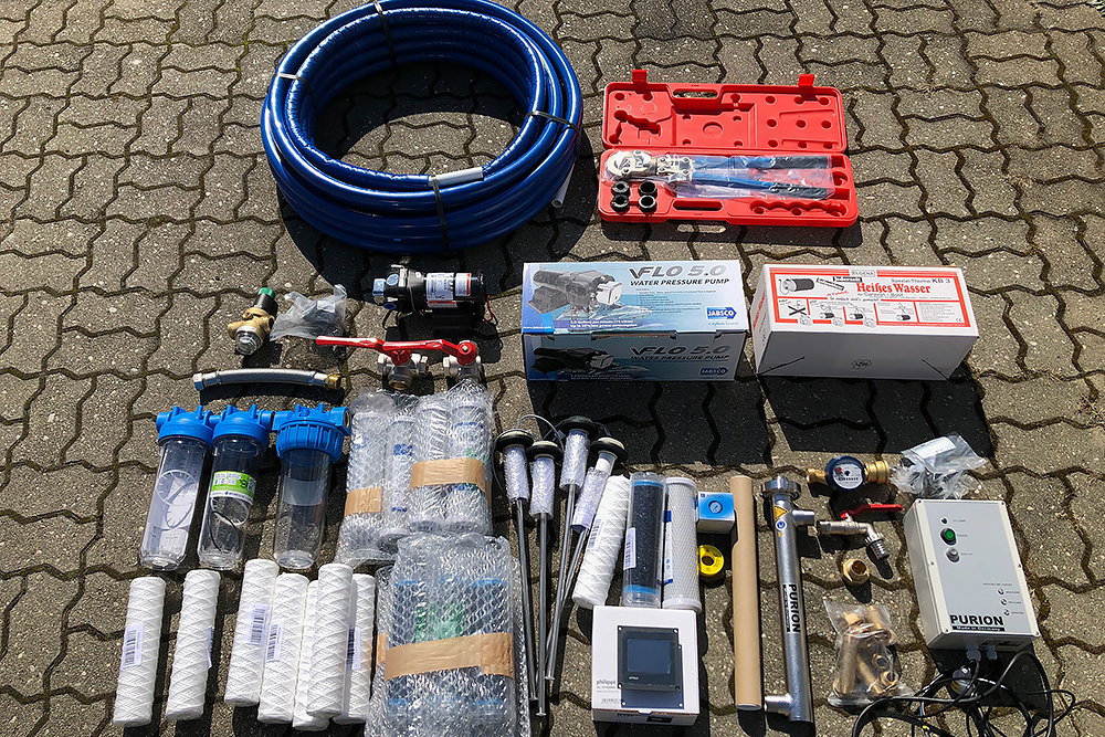 So, Diesel fließt schon mal, nun geht es an die Wasserversorgung! Lange hat es gedauert bis klar war, wie diese aussehen soll. Viele Pläne wurden gemacht und wieder verworfen. Wir entschließen uns letzendlich, dass nur gefiltertes Wasser in die Tanks gelangen soll und diese dadurch dann auch nur mit Druck betankt werden können. Sollte kein Wasserhahn zur Verfügung stehen, übernimmt das dann eine Gartenpumpe BP2 von Kärcher (50L/min).