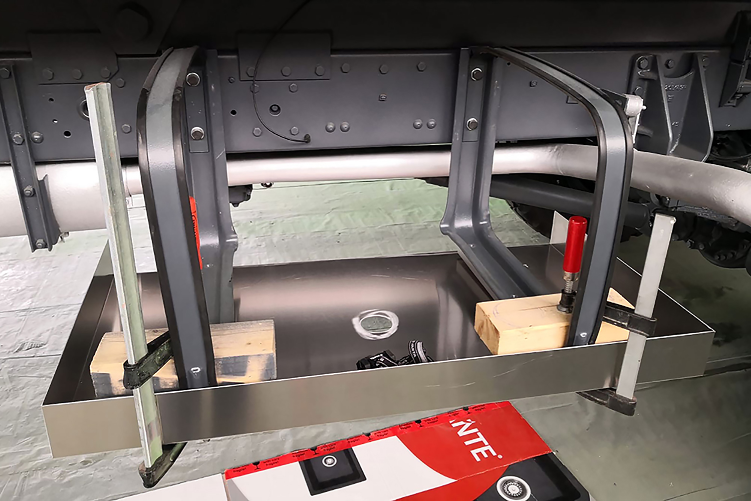 Die Trinkwassertanks sind auf Buchenholz zur Unterlüftung in 4 cm Höhe montiert und an der Unterseite kleben zur Isolierung schon 19 mm Armaflex XG, die anderen Seiten folgen noch...