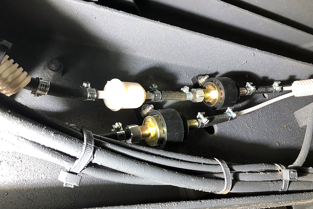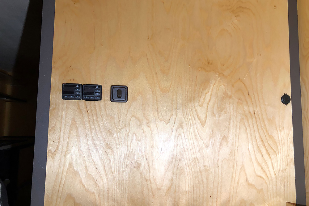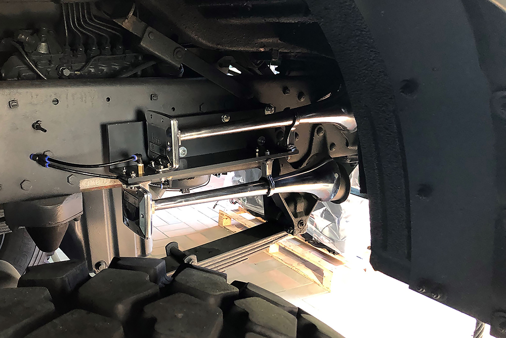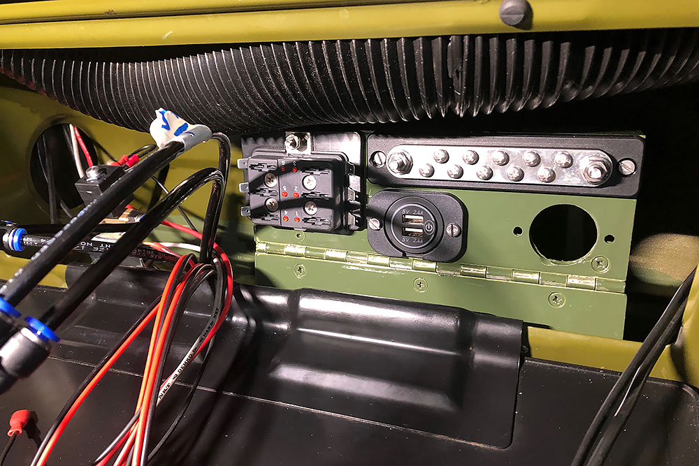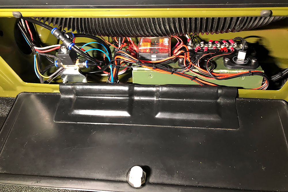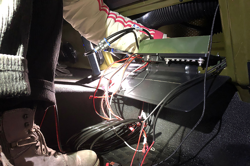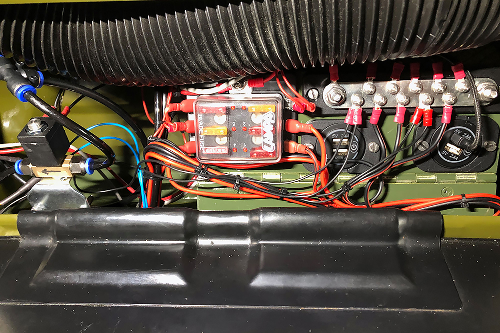 Das Ganze braucht natürlich auch Strom und Druckluft für die wir neue Zuleitungen verlegen. Wir finden für alles einen geeigneten Platz hinter einer Klappe auf der Beifahrerseite. Mit hoher Ingenieurskunst entwickeln wir eine über Zündung und Relais geschaltete, abgesicherte Unterverteilung mit Sammelschiene für Masse, Elektro-Pneumatischem-Magnetventil für die Fanfaren, 4 USB-Steckplätzen für Soundbox, Phone, Navi und GPS, für die Innenbeleuchtung, den 2 neuen Tankgebern, der Sitzheizung, der Dieselfilterheizung und Luftzufuhr zu den Sitzen. Alles auf engsten Raum klappbar installiert: