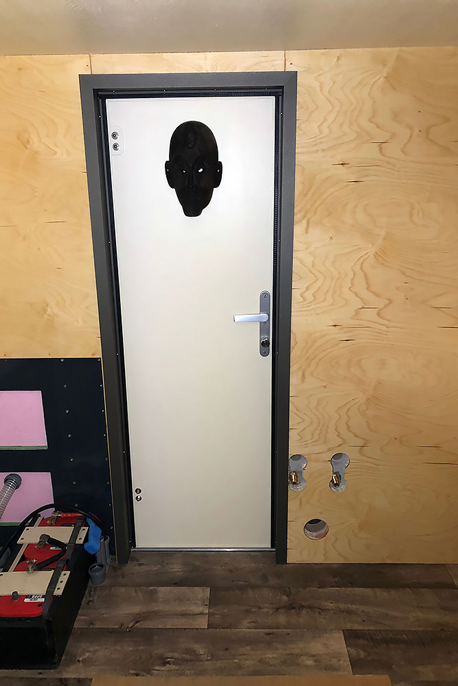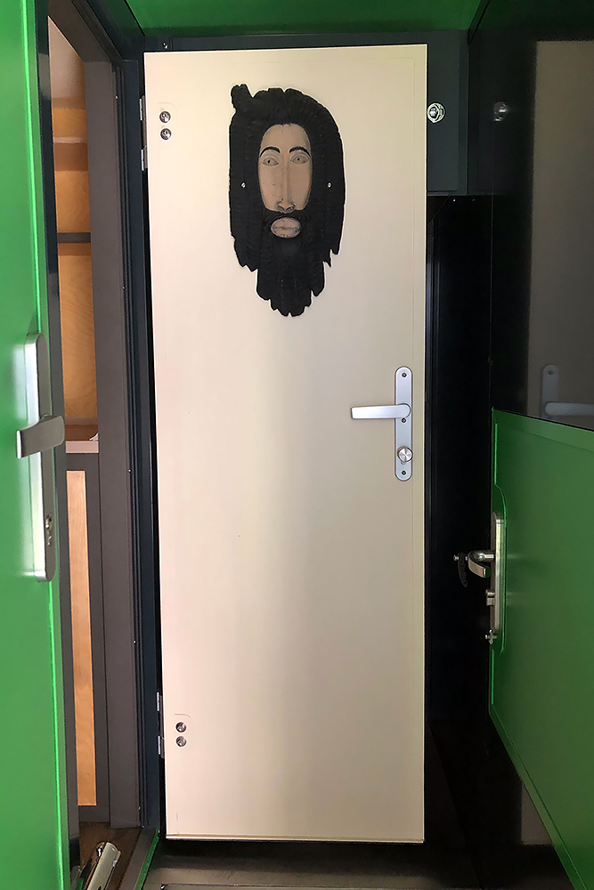 Die Tür zum Wohnbereich erhält Schnitzkunst aus Jamaika, denn die Maske aus Nepal war einfach zu dick!