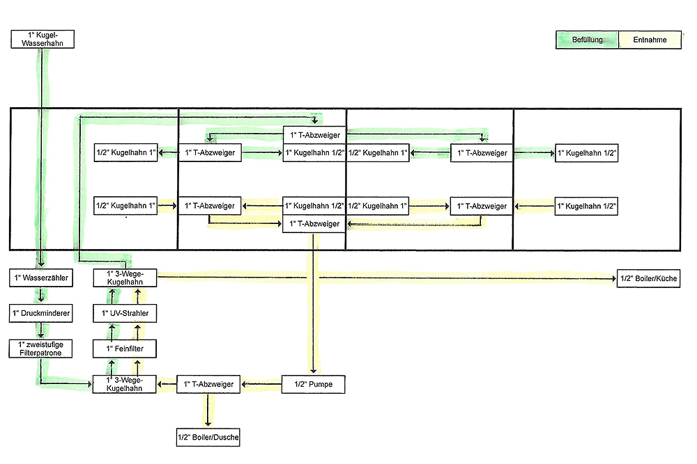 Für die Entnahme sollen zwei 3-Wege-Kugelhähne umgelegt, der Kugelhahn des gewünschten Tanks geöffnet und das Wasser noch einmal durch den Feinfilter und der UV-Bestrahlung gepumt werden, bevor es aus dem Küchenhahn läuft. Das Duschwasser soll aber kein zweites Mal gefiltert werden.
