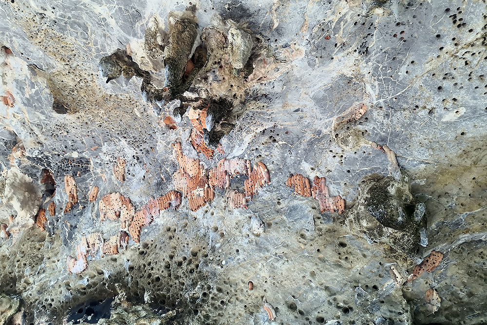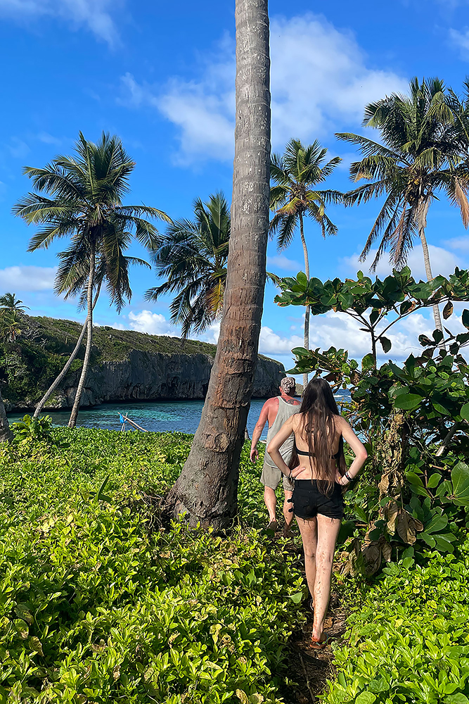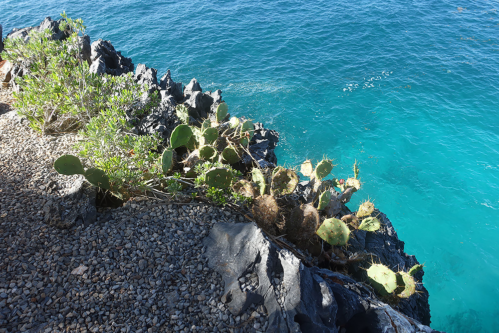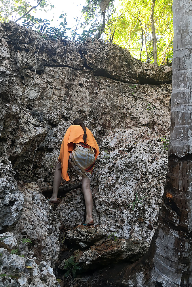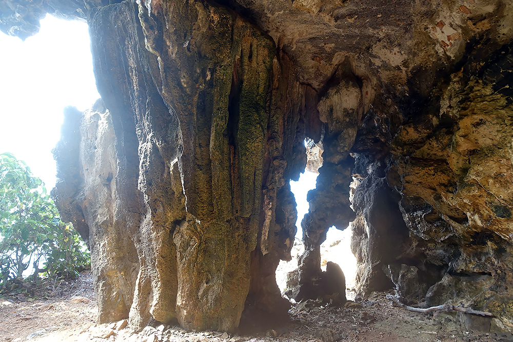 Heute schlägt sie sich aber noch tapfer und nach einer Abkühlung im Meer, klettern wir an einem Felshang zu den dortigen Höhlen.
