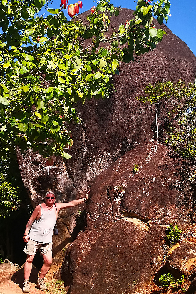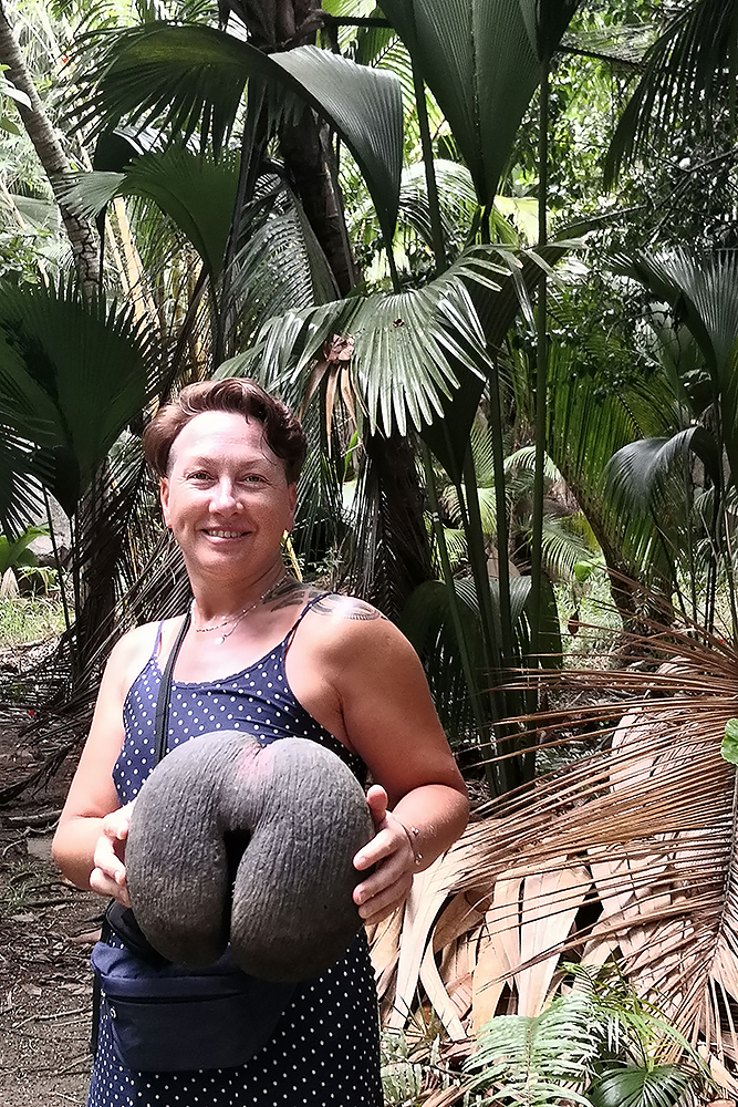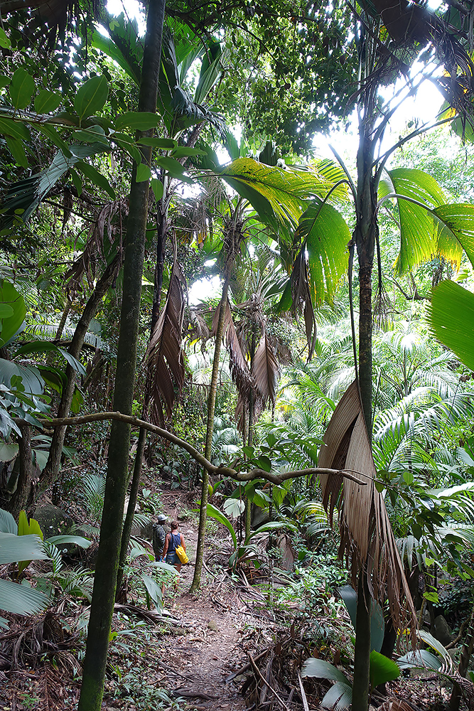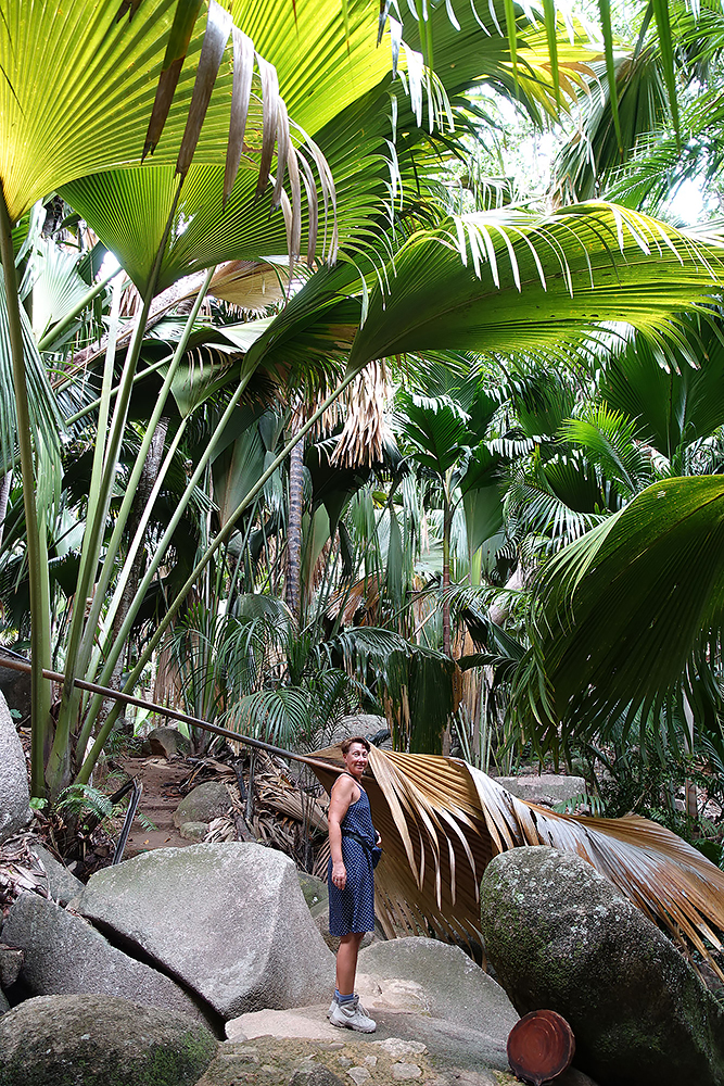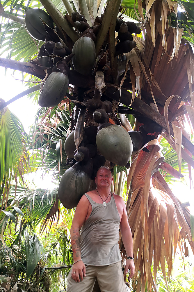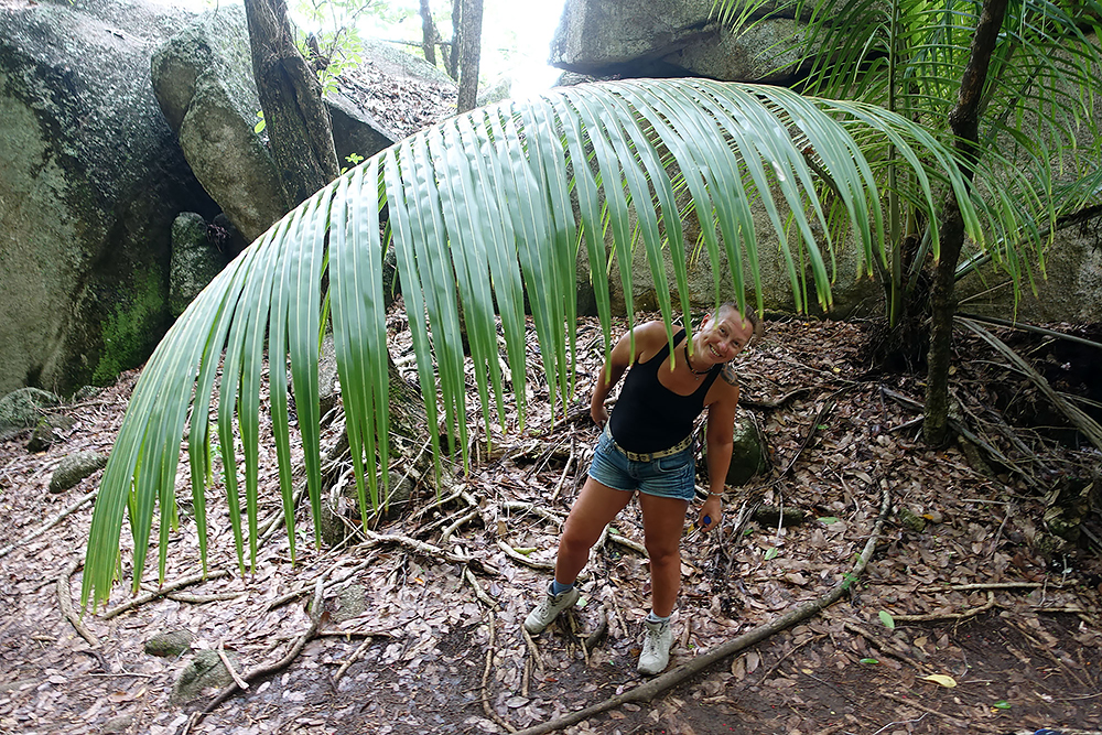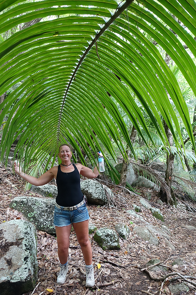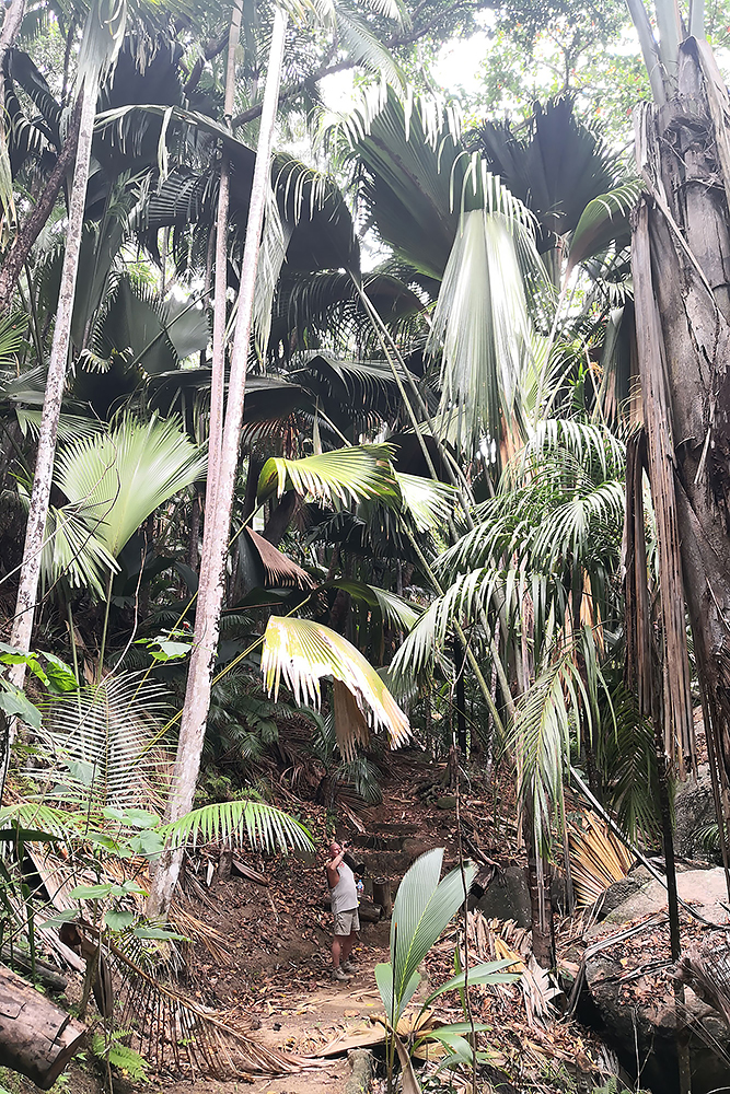 | 02.01.2023 Im neuen Jahr wandern wir durch den Ferdinand Nature Reserve, in dem unter anderem die riesigen Palmen wachsen, für denen die Seychellen so bekannt sind, denn sie wachsen nur hier. Ihre Kokosnussfrüchte, sind entwerder männlich oder weiblich. Das Abbild der weiblichen dient übrigens auch als Visastempel. Doch wer tropisches Klima kennt der weiß auch, so eine "jungle tour" ist nicht witzig, die kostet Kraft! |