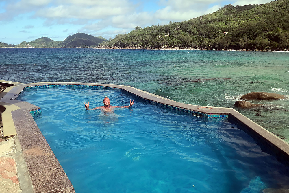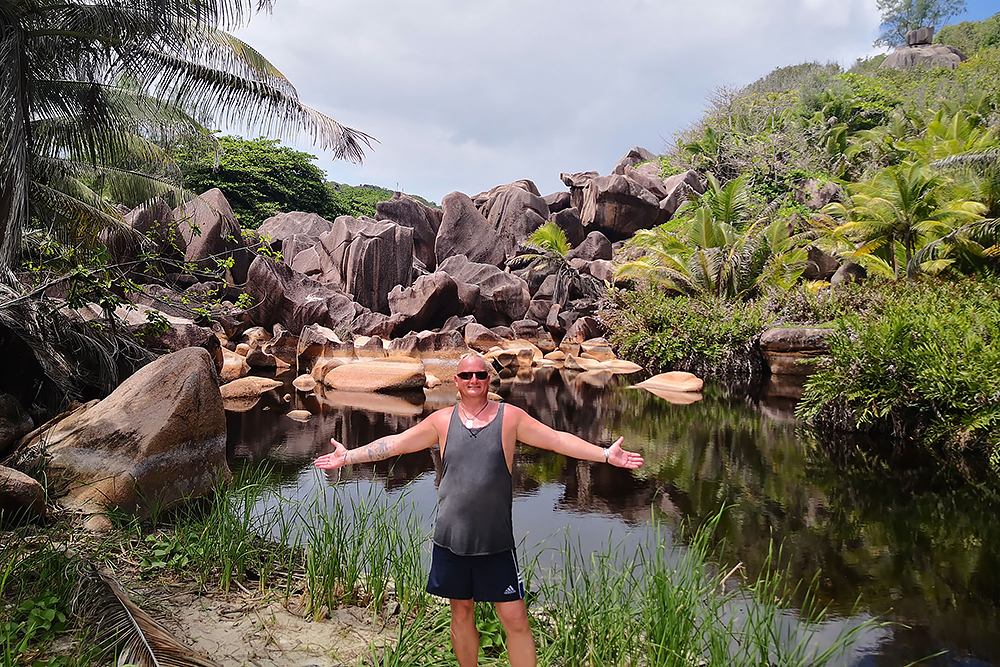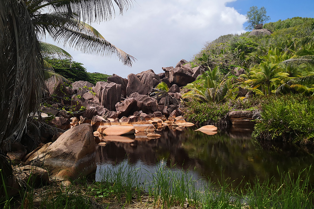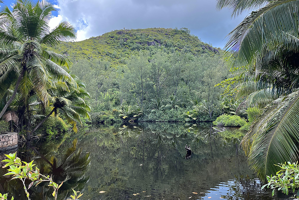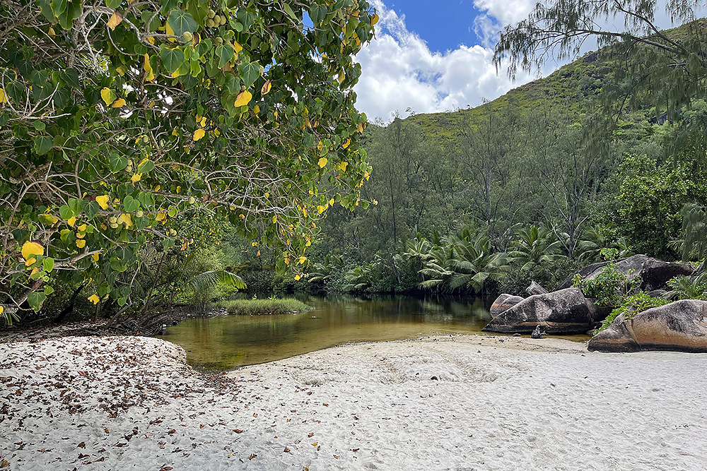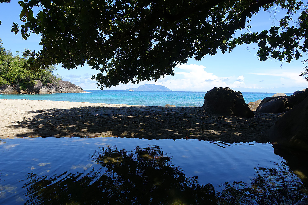 | 28.12.2022 Doch die Seychellen haben auch Berge und Frau Becker mag Trekking für ihre Figur! Wir gehen zum Glück nur wandern, doch mir reicht das in der Hitze und dem Sauerstoffmangel. Wir folgen dem "Anse Major Trail" der uns am Ende mit einem kühlen Bad im "Rivers Major Pool" belohnt. Es handelt sich dabei um einen kleinen kristallklaren Süßwasserteich, den nur 50 m Strand vom Ozean trennen. |