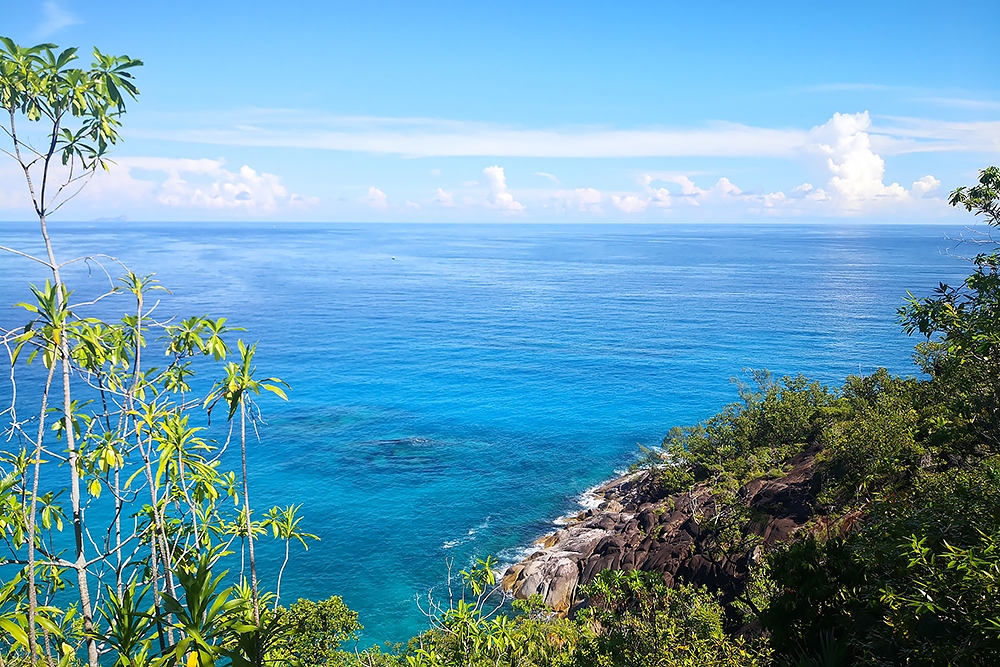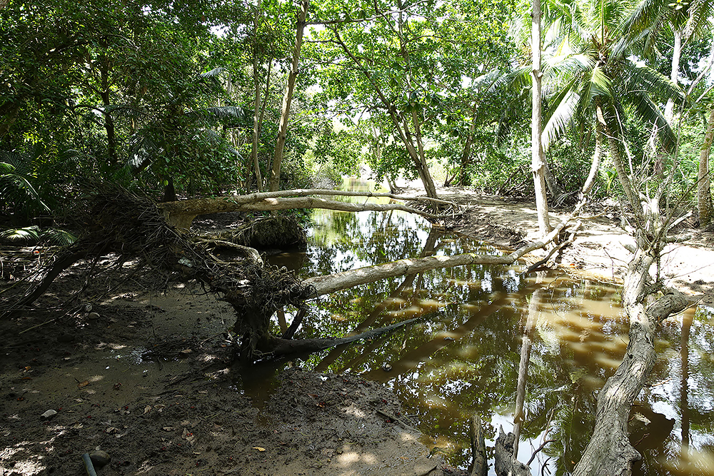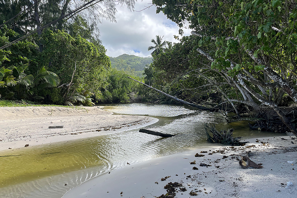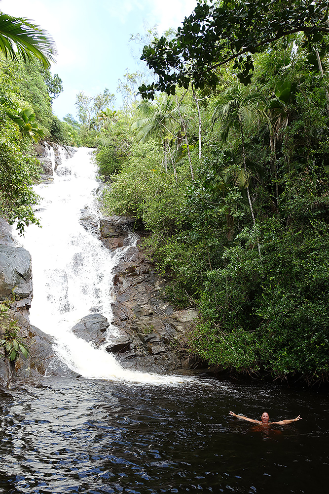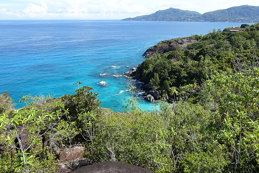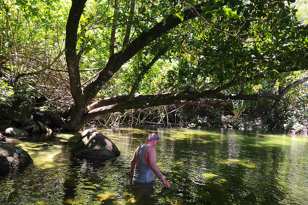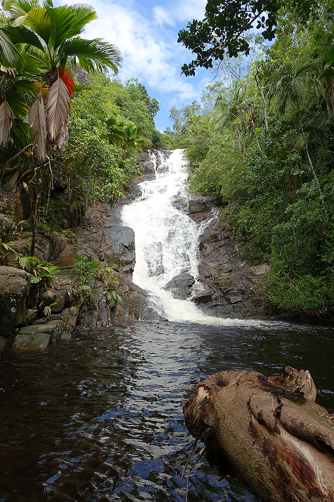 | 28.12.2022 Doch die Seychellen haben auch Berge und Frau Becker mag Trekking für ihre Figur! Wir gehen zum Glück nur wandern, doch mir reicht das in der Hitze und dem Sauerstoffmangel. Wir folgen dem "Anse Major Trail" der uns am Ende mit einem kühlen Bad im "Rivers Major Pool" belohnt. Es handelt sich dabei um einen kleinen kristallklaren Süßwasserteich, den nur 50 m Strand vom Ozean trennen. |