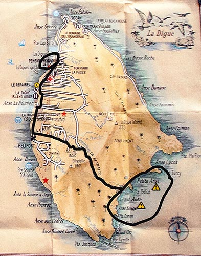 Petite Anse. Meine Frau schlägt auch noch vor, die ca. sieben Kilometer über die Insel zu laufen und sich nicht (wie es alle Touris machen) am Fährhafen gleich ein Fahrrad zu mieten. Ich Idiot stimme zu und stehe bei der Hitze und Luftfeuchtigkeit schon nach zwei Kilometern kurz vor meinem ersten Herzinfarkt! Eins steht mal fest, ich bin echt alt und fett geworden, doch meine Frau zum Glück nicht! ;-) Doch Unkraut vergeht nicht und ich ziehe es durch, am Ende 15 km Fußmarsch in einer Sauna mit Bergen! Aber die Insel ist ein Paradies und jeder Meter ist sie wert. Wir sehen Natur die so unwahr ist, das es eigentlich nur Pappmaché einer Filmkulisse sein kann. Keine Kamera der Welt kann dies wirklich ablichten und mir war eh nicht zumute danach! |