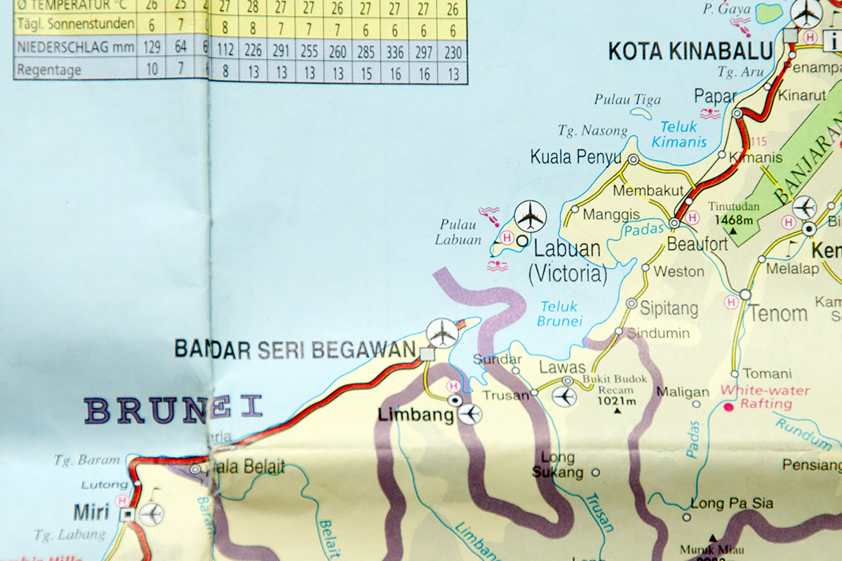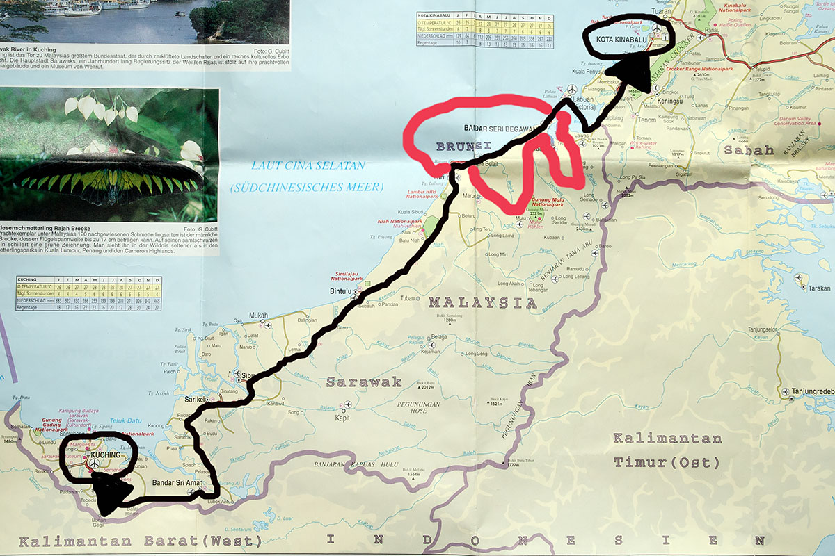 ASIEN MALAYSIA BORNEO Borneo ist die drittgrößte Insel der Welt und ist aufgeteilt zwischen den drei Staaten Indonesien, Malaysia und Brunei. Ich lande in Kota Kinabalu, Malaysia, mit dem Plan die Insel von Ost nach West durch den Regenwald zu durchqueren. Vom Bundesstaat Sabah, Malaysia durch das Sultanat Brunei, und dann durch den Bundesstaat Sarawak, Malaysia. ![]() Mit einem Taxi erreiche ich den Busterminal. Es ist 6:00Uhr am Morgen doch die Ticketverkäufer sind schon bei der Arbeit. Erst Bus, dann Speedboot und dann Fähre, so würde ich nach Brunei gelangen, erzählt mir eine Frau. Ich erzähle ihr, das ich mit einem Bus direkt nach Brunei fahren möchte und sie antwortet: „Yes yes, first bus, then speed boat and then ferry!“ Ich verstehe nur Bahnhof, kaufe ihr aber ein Ticket ab. Ob es hier eine Toilette geben würde frage ich sie noch und sie sagt ja ja, da drüben im Subway Restaurant! Ich gehe hinüber, die Tür ist verschlossen doch ein Mann der gerade den Boden wischt kann mich durch die Glasscheibe sehen. Er öffnet und ich bitte um Einlass. Ja klar, oben in der ersten Etage. Sie haben eigentlich noch geschlossen aber auch einen Kaffee bekomme ich zubereitet. Was für herzliche Menschen, das möchte ich in meinem Heimatland mal erleben! Um 7:00Uhr startet der Bus zu der 165km langen Fahrt nach Menumbok und hält dort tatsächlich an einem Fährhafen. ![]() |