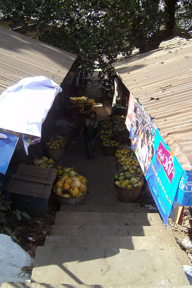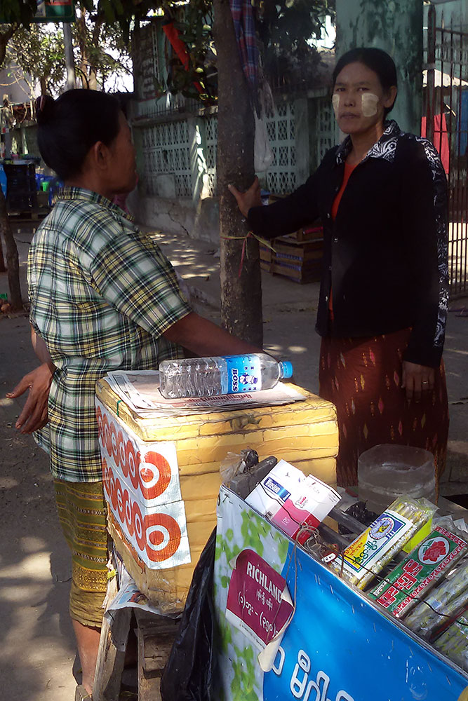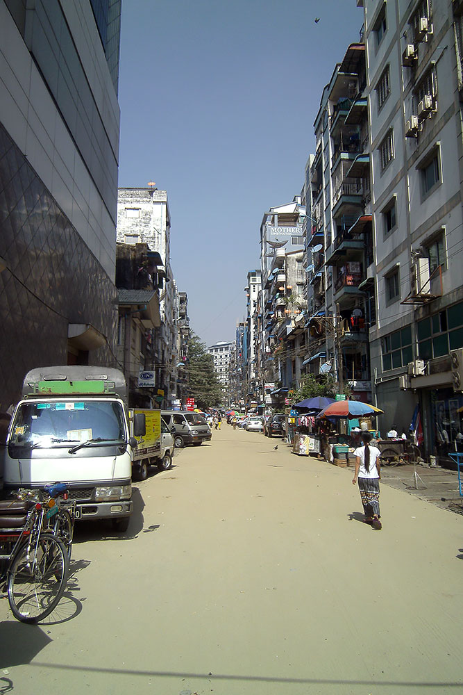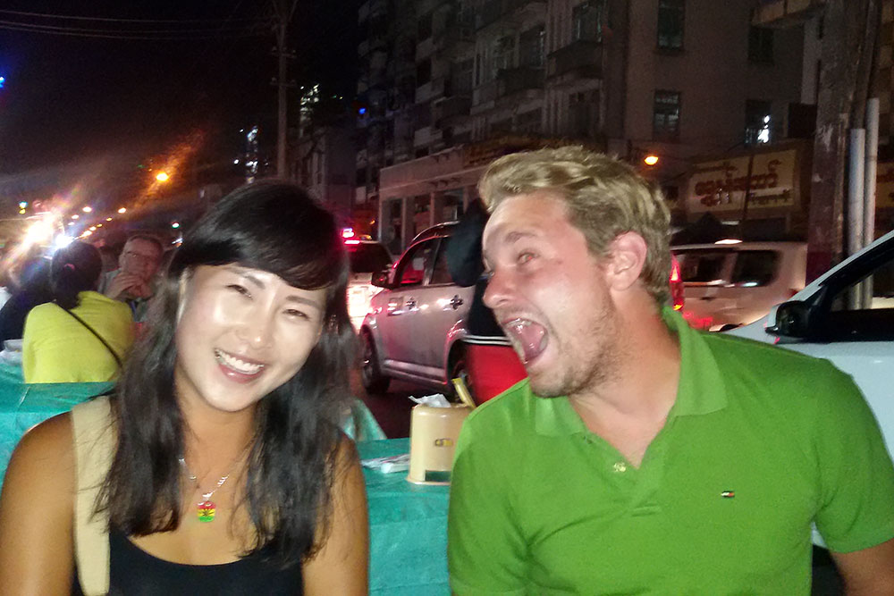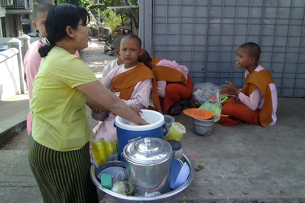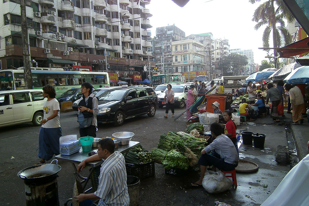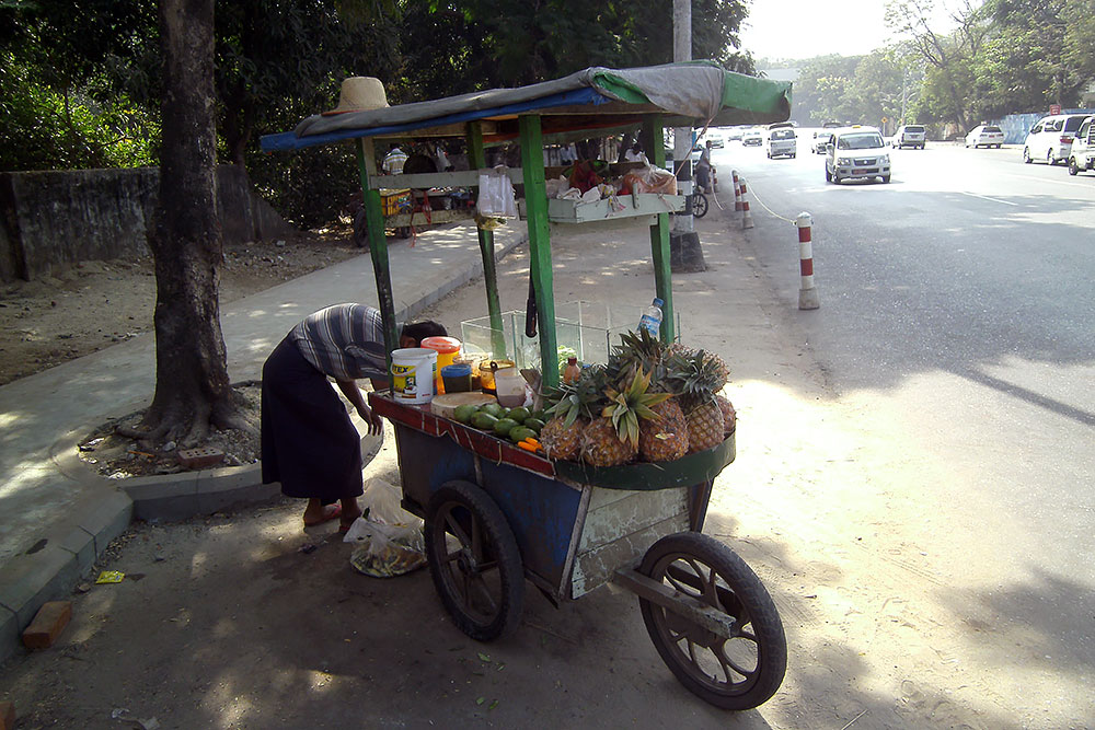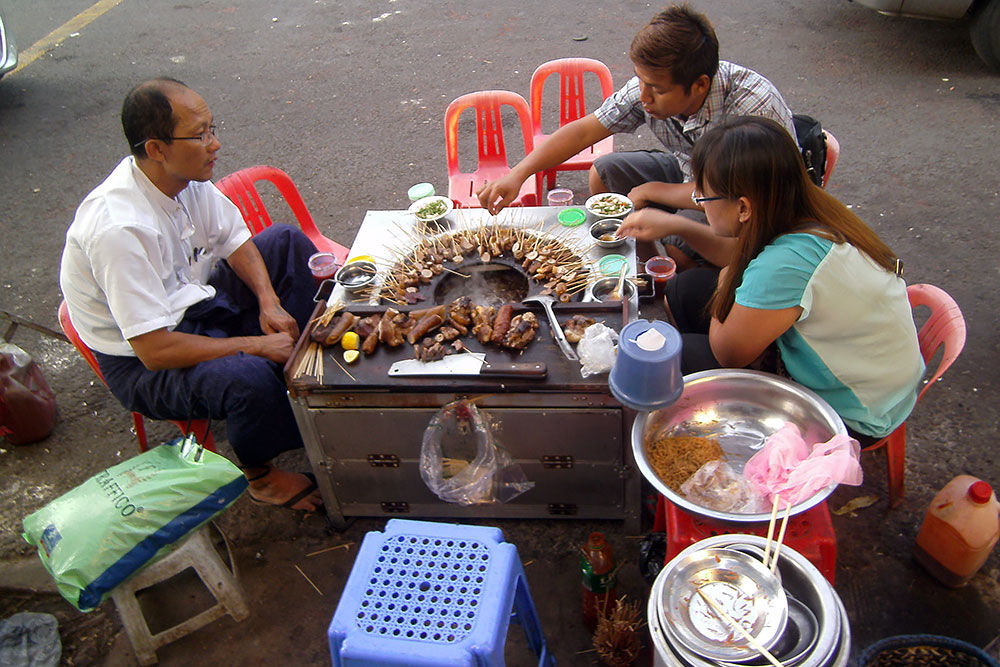 Sport in Myanmar. Der Hunger treibt mich weiter und in einer belebten Straße werde ich sehr lecker satt: |