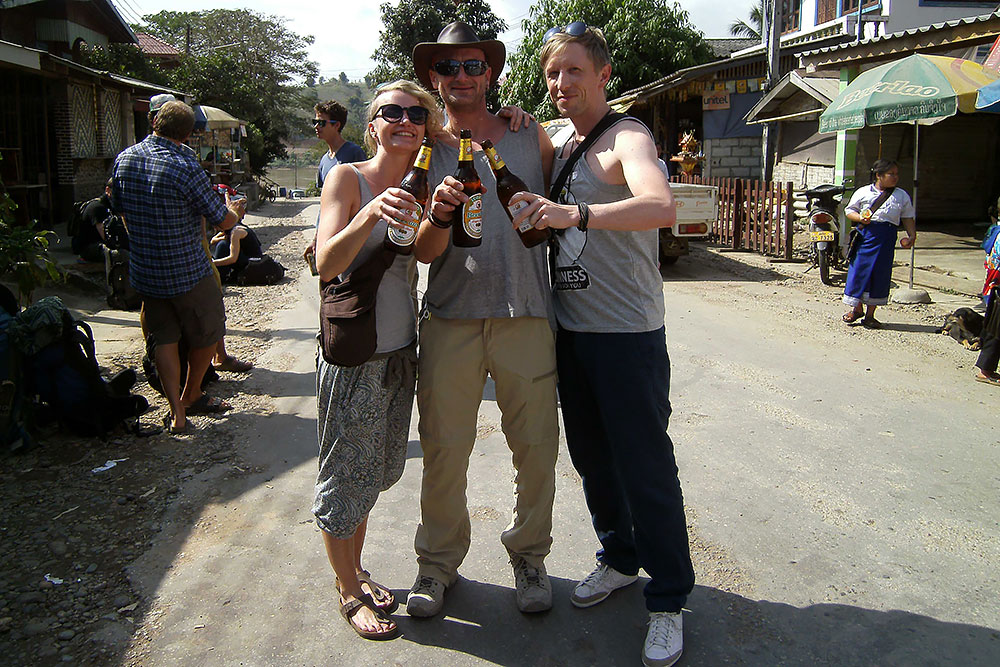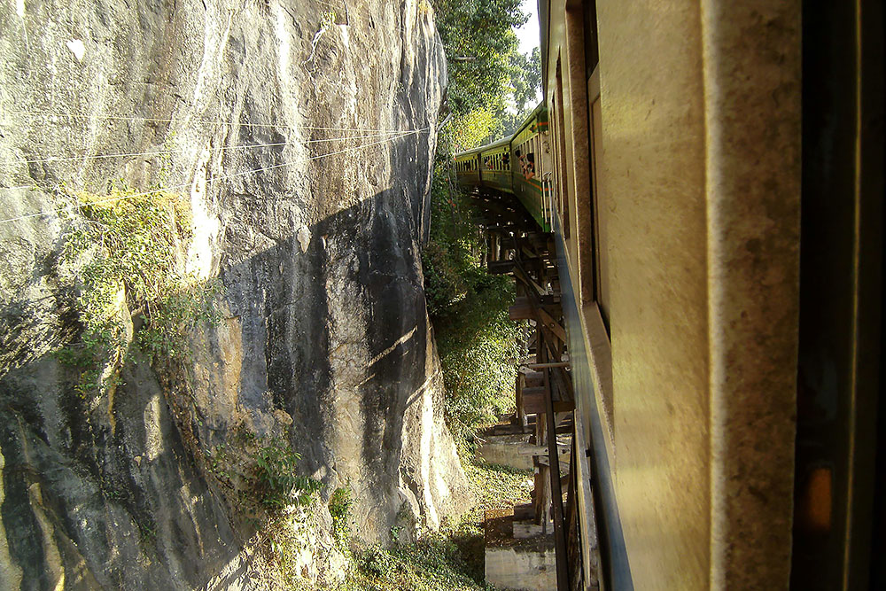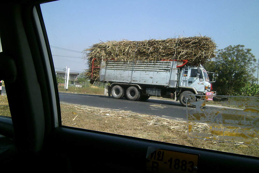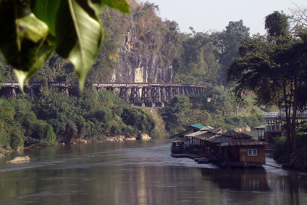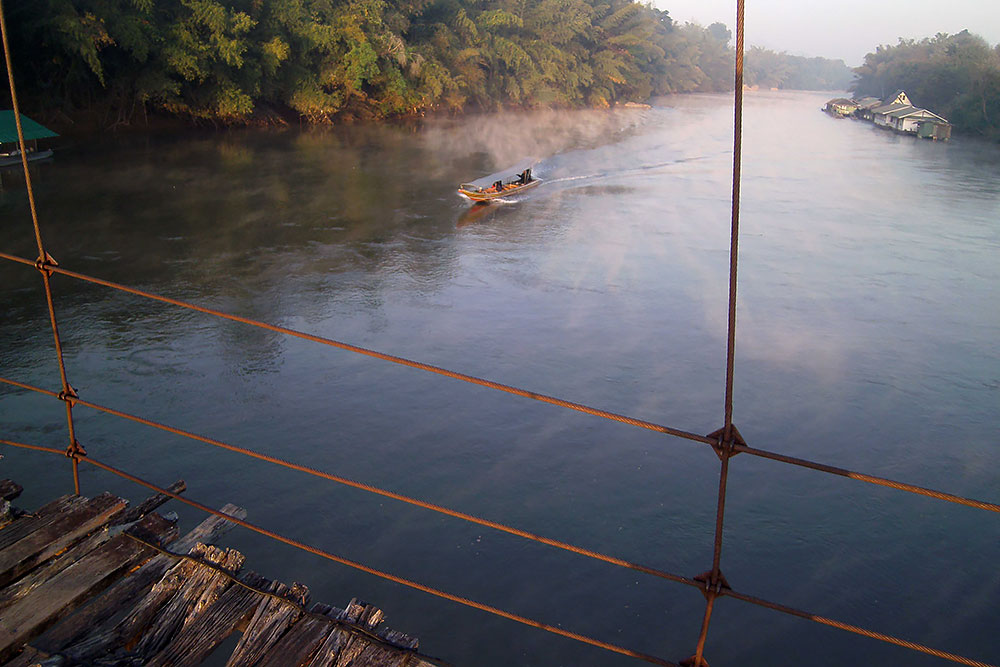 Ordnung wäre: „Thailand only“. Mit Zuckerrohr überladene LKW kündigen an, dass es ländlicher wird. Berge tauchen auf und die Thais machen aus 3 Spuren 4. Die Ampel ist rot, es fahren noch zehn weitere Fahrzeuge rüber, wir auch „Thailand only“. Tom bekommt die Karre aber wirklich immer noch rechtzeitig zum Stehen, auch wenn die Vorderachse rauszubrechen droht. Über staubige Pisten erreichen wir so den River Kwae. |