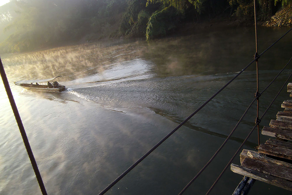 | Ich miete mich auf einem Hausboot ein. Klingt toll aber nur eiskaltes Wasser und kein Handtuch. Ich trockne mich mit der Bettwäsche ab, die Bude ist dreckig, suche Bier. Werde geweckt von dem Geschrei des Urwalds. Schaue auf den mit Nebel bedeckten River. Die Nacht war kalt, gehe spazieren. Von einer alten Hängebrücke aus schaue ich den Speedbooten zu, wie sie den Fluss in zwei Hälften teilen. Die Sonne blinzelt durch das Geäst, der Dschungel verstummt zunehmend. Einsamkeit kann so herrlich sein. |