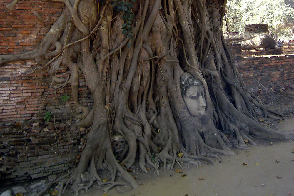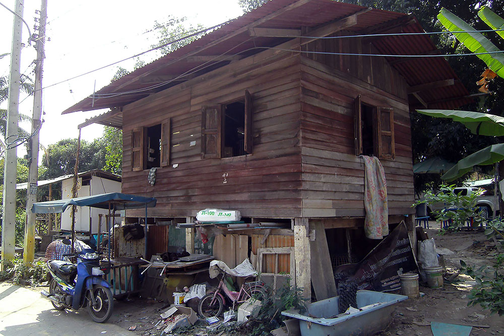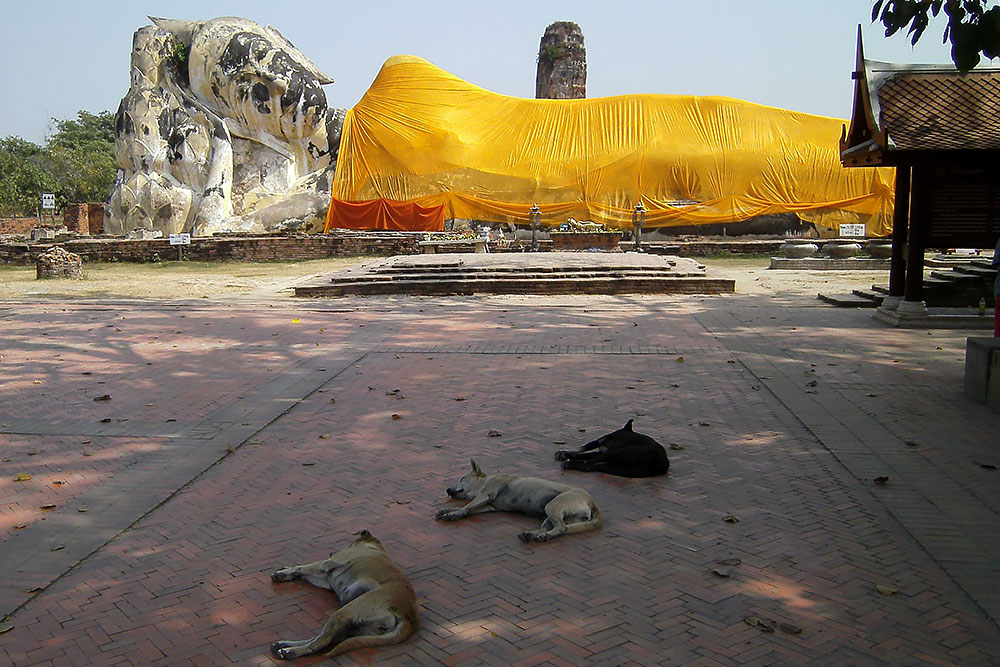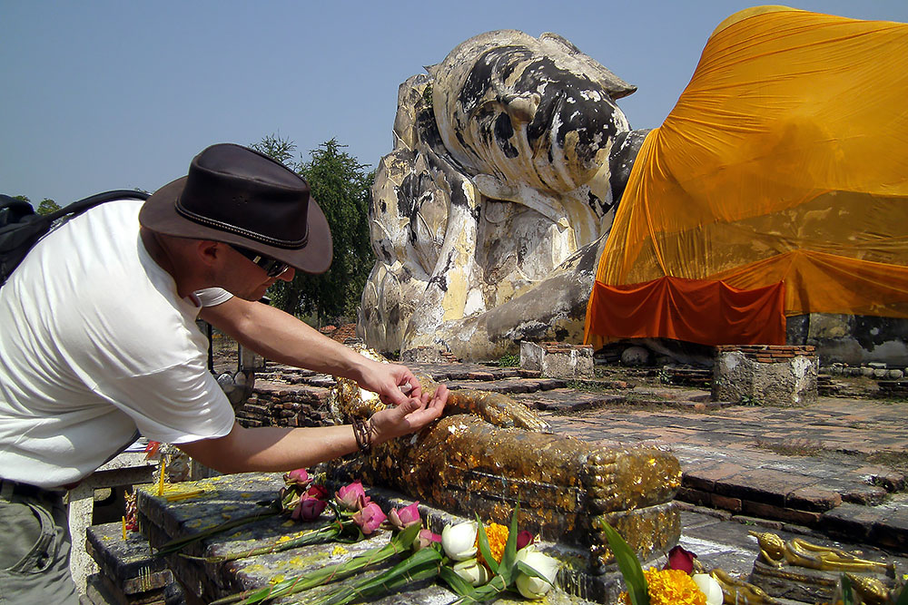 bekomme ein Zimmer mit nur einem aber immerhin noch Doppelbett. 20:00Uhr, ich kann eine ganze Wohnungseinrichtung kaufen, mich neu einkleiden und natürlich auch essen gehen, komme aber nicht ins Internet. There is closed! Ich schlender durch die Strassen, zusammen mit vielen Hunden, es werden immer mehr. Auch ich, ein streunender Köter, will dazu gehören, die frische Abendluft geniessen aber der Boss knurrt mich an, soll verschwinden oder was zum Fressen geben, ich ziehe mich zurück, er bleibt der Boss. 07:00Uhr, ein neuer Tag, ein neuer Versuch. Auf der Strasse der erste Unfall. Kinder auf dem Weg zur Schule, Garküchen mit ihrem Aufbau beschäftigt. Bestelle einen Americano-Kaffee (hot) und bekomme noch gratis einen Tee dazu, auch beim zweiten. Wahrscheinlich falls der Kaffee nicht schmeckt oder so? Die drei Söhne der Dame müssen antreten und mich begrüßen, als der Schulbus kommt, auch wieder verabschieden. Ein tolles Land! Schenke ihnen ein paar Schreiber und winke ihnen nach. Der Winter ist heiß in Ayutthaya, sehr heiß. Lasse mich nach ein paar Kilometern zu Fuß gern von einem TukTuk mitnehmen. War schon beim „Wat Maha That“ und auch bei der großen liegenden Buddhafigur "Wat Lokayasutharam". Hab sogar Blattgold gekauft und angebracht, so dass ich mich zukünftig um Geld kein Sorgen mehr machen brauch, sie hat es mir versprochen. Eine todsichere Sache sei das! Sage dem Fahrer er soll mir sein Thailand zeigen, das nicht auf seiner Karte ist und er versteht. Wir fahren in den ärmsten Teil der Stadt, in das muslimische Viertel. Trinke später noch einmal Kaffee mit Tee, die Jungs kommen aus der Schule. |