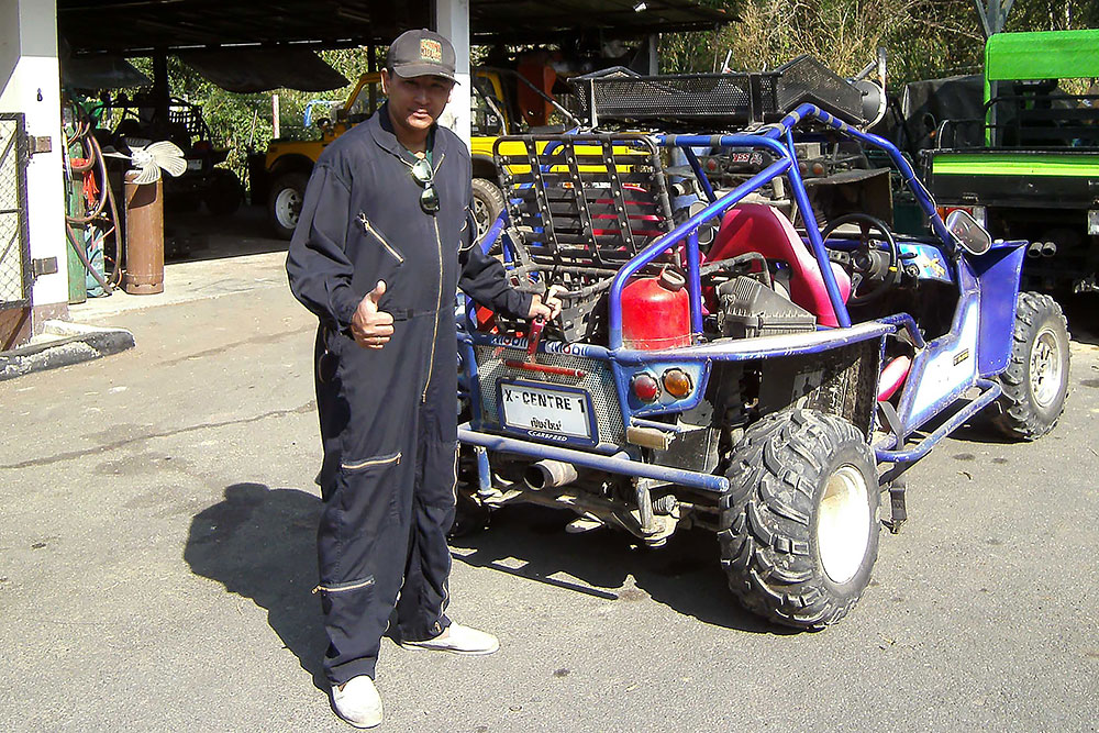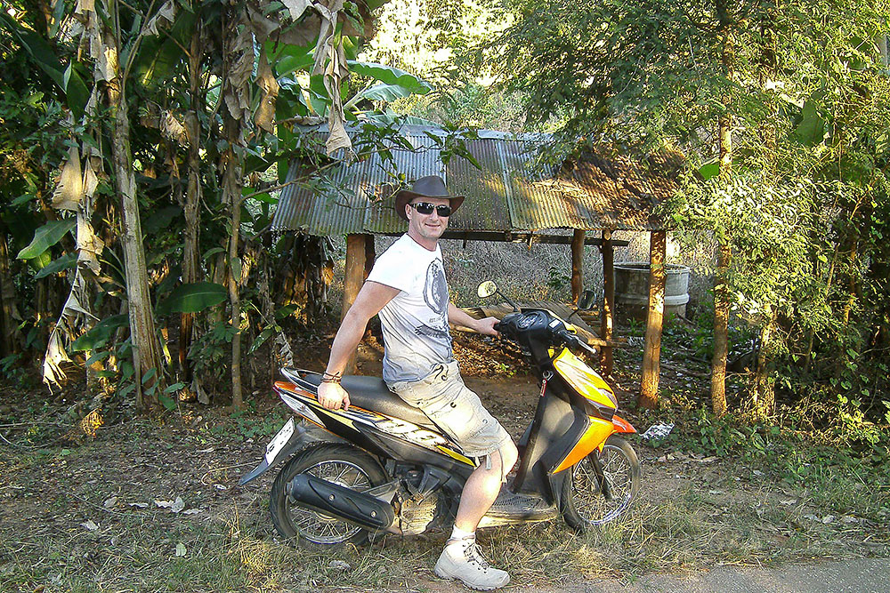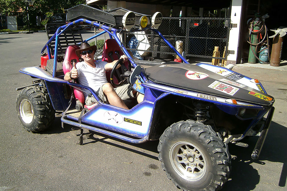 Versicherung wieder. Ist gebongt! Ziehe einen Overall an, Mundschutzmaske und einen Helm und gehe mit einem zu den Buggys. Er fährt vor, ich soll folgen. OK, so weit kein Thema, wo ist die Strecke? In den Bergen! Gurte um und los, ziemlich komisch mit dem Lenkrad auf der rechten Seite. Nach einen Führerschein hat keiner gefragt, nicht einmal ob ich überhaupt Auto fahren könnte „Thailand only“ aber was macht er denn da? Der Fährt ja auf die Strasse, ach du Sch... Wir brettern ca. 10km durch die Ortschaft, wenn ich nur einwenig zuviel Gas gebe, heben die Vorderräder ab, ein Geschoss, eine Waffe aber geiler Sound. Über eine staubige Piste ab in den Dschungel, klappt doch super, macht Spass, ja sag mal geht’s noch? Er beschleunigt, ich sehe nur noch Staub und einen Buggy fliegen. Wie soll ich das beschreiben, mind. 25% Steigung, der Weg schmaler als der Buggy, links der Abhang und ein paar Bäume, rechts nur Bäume. Im Weg bis zu 80cm tiefe Fahrrinnen, Gruben, Steine, Äste... darum der Speed, nur die Flugkraft bringt es. Nur kurz den Fuß vom Gas und man stürzt nach hinten runter, die Karre fliegt von links nach rechts, überschlägt sich ein paar mal fast, knallt hier und da zum Glück noch links an einen Baum und verhindert den Absturz in die Tiefe. Bekomme Angst, kann aber nicht halten, der Hang ist viel zu steil. Ich sterbe Tode, alles an Adrenalin ist schon ausgeschüttet, der Overall nass, als wäre ich ins Wasser gefallen. Die Fahrt will nicht enden, ich könnte heulen, was für dämliche Idee. Ewigkeiten später können wir auf dem Gipfel halten, ich zitter am ganzen Körper, kann nicht sprechen. Ob ich einen Fotoapparat dabei hätte, dann würde er ein schönes Bild von mir mit der tollen Aussicht machen. Du Idiot, wie weit ist es noch? Wo geht es weiter? Ab hier nur noch mit einem Crossbike. Ja und wo fahren wir dann lang? The same way! What there down? Yes! Hölle, mein Gehirn auf Sparflamme, kein Gefühl mehr. Zu wenig Gas rutscht die Kiste unkontrollierbar den Hang runter und lässt sich auch nicht mehr stoppen. Zu viel Gas, kaum noch Bodenkontakt, also der gleiche Effekt. Was denken die sich eigentlich, dass ich mir Sorgen um meine 100,-€ mache? Das kann doch nur ein Witz sein, wenn ich den Abhang runter segle, brauche ich kein Geld mehr! Sonst keine Erinnerung mehr aber ich lebe noch und bekam auch mein Geld zurück. Eines der dümmsten Aktionen meines Lebens. OK, es gab schon viele aber nur wenige haben es gefährdet. |