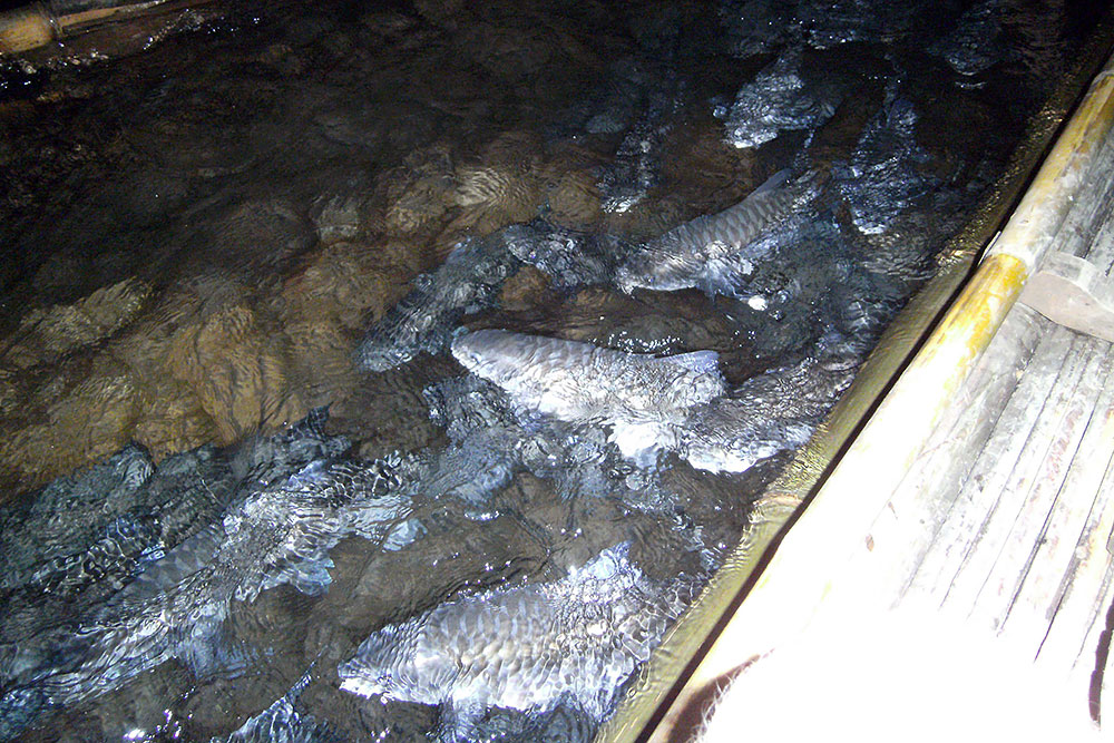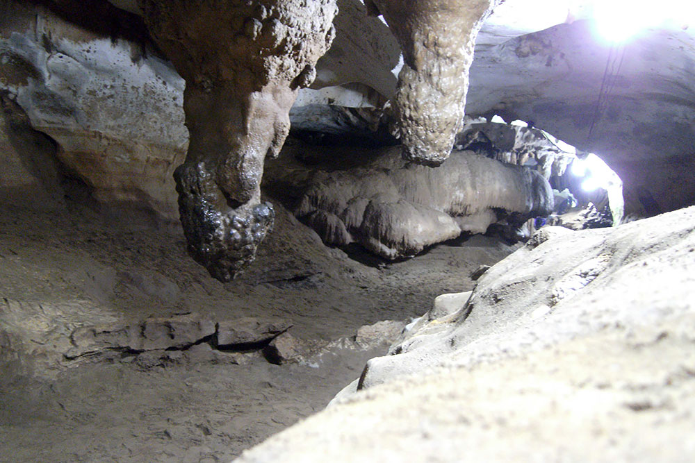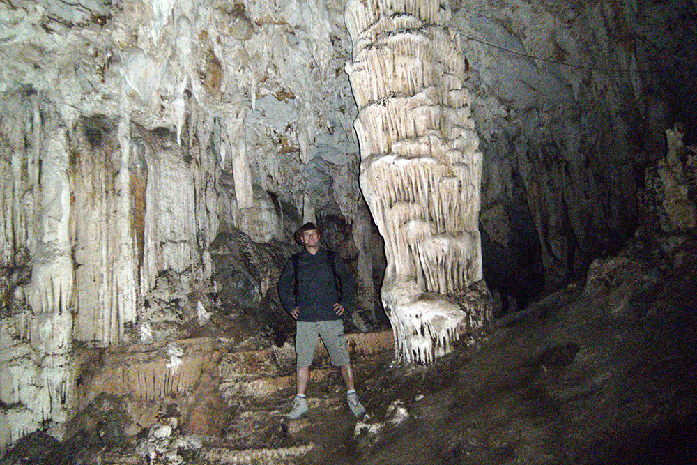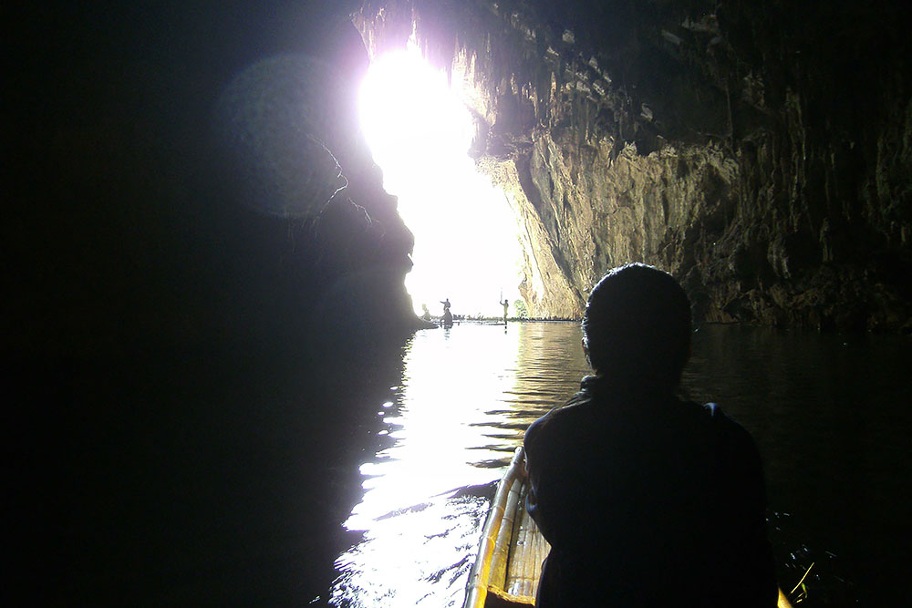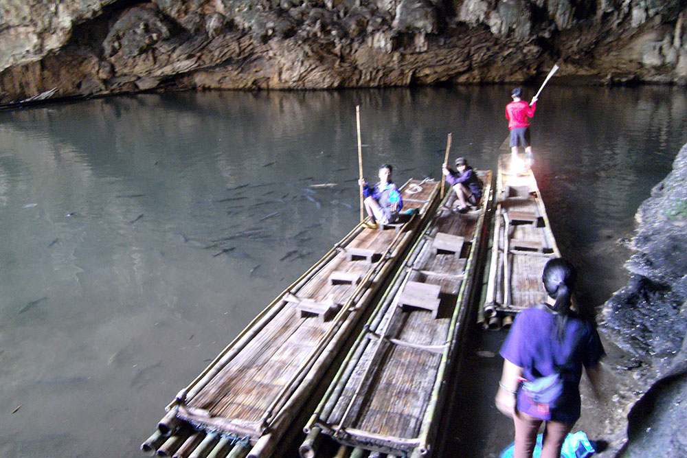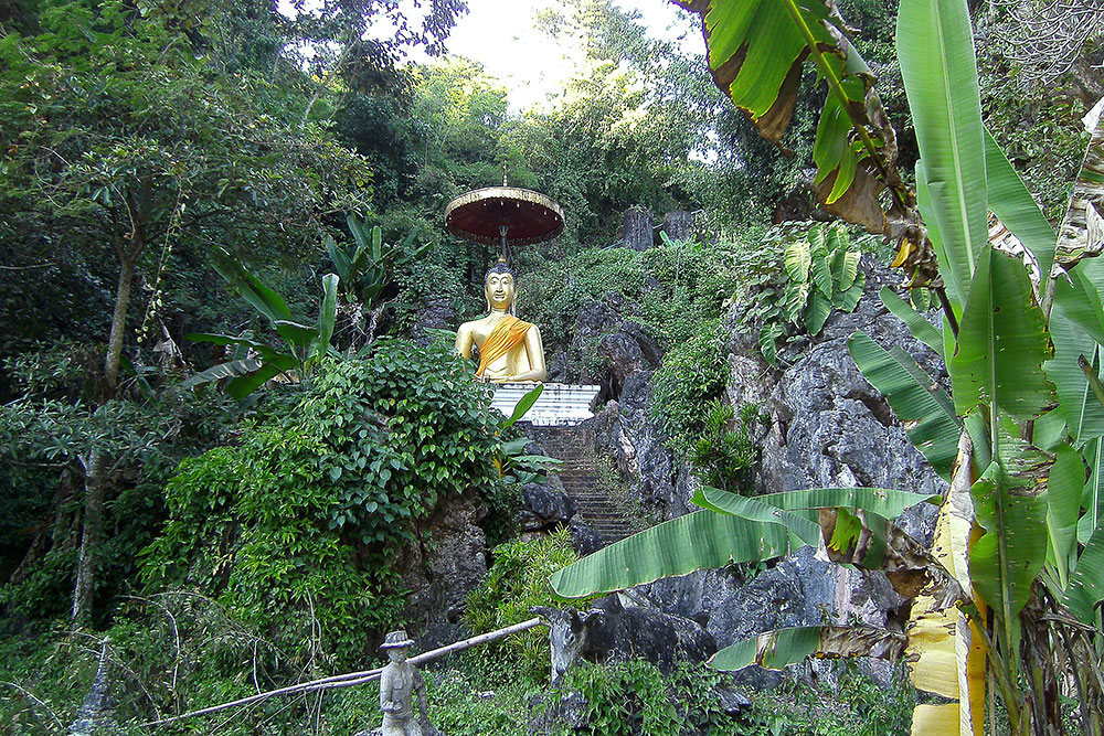 | Auf dem Gerät jage ich durch die Berge, weiter nördl. zu der Tham Nam Lod (Lot). Autos kommen mir entgegen wo sie nicht sein sollten, auf meiner Spur. Das Benzin reicht gerade so bis zur nächsten Säule, hab zuvor mit Händen und Füßen versucht den Leuten eine Tankstelle zu erklären. Die Cave ist kaum zu finden. Der Weg dorthin ist schmal und führt durch kleine Dörfer aber es lohnt sich. Ist die größte Höhle, die ich je gesehen habe. Meine Kamera aber viel zu schwach, um das Dunkel der einzelnen Bereiche auszuleuchten. Nur in kleinen Gängen war dies möglich. |