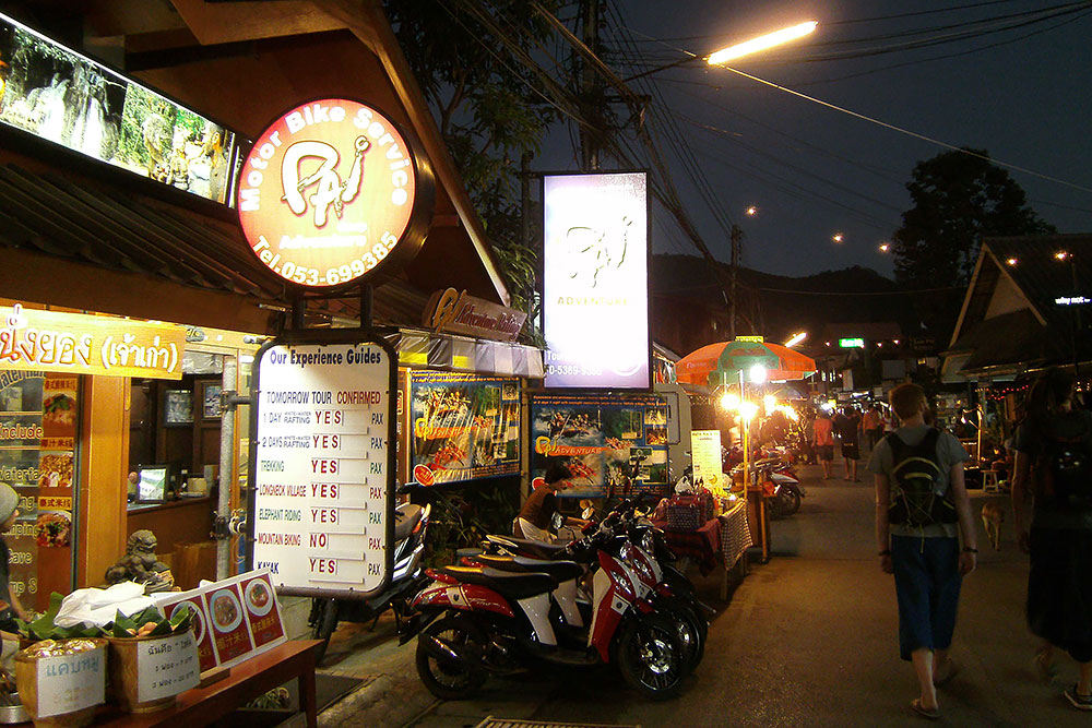 aus den Bergen ihre Waren anbieten. Ein Meer aus Blumen, wunderschön! Für 150,-Baht pro Person schlängelt sich der Kleinbus No. 3/1 ein paar Stunden durch die Berge. Treffe in Pai auf viele Touristen und auf diejenigen, die einfach nur irgendwann hier hängengeblieben sind. Eine Stunde später habe ich ein Zimmer und ein fahrbares Gerät unterm Hintern. Ich erkunde die Gegend. |