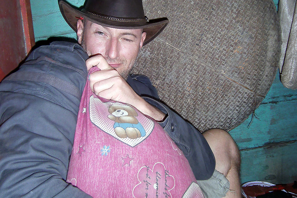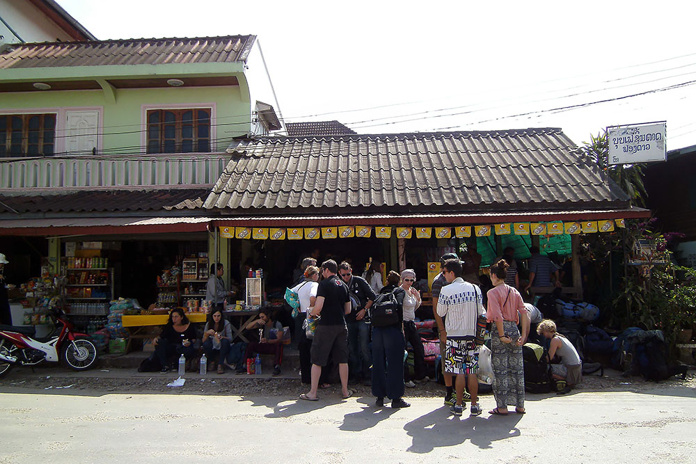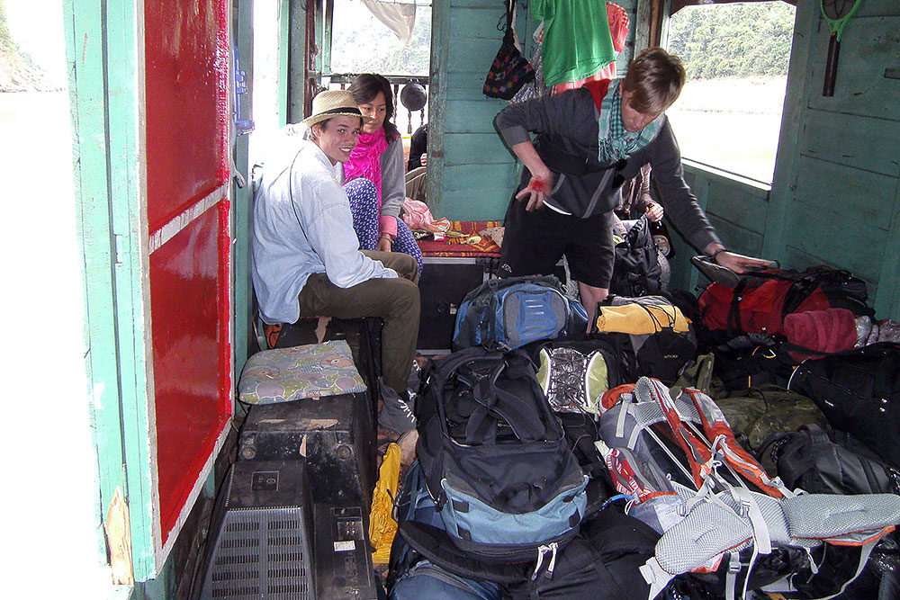 Stunden auf die dreckigen Matratzen. Morgens gibt’s eine Lunchbox mit, sie endet als Fischfutter, ist ungenießbar. Erfahre auch das es heute zu meinem Geburtstag kein Speedboat gibt. Herzlichen Glückwunsch, ihr spinnt wohl? Ich habe doch dafür bezahlt! „No speedboat today“ und höre auf zu nerven! Beate und Stefan sind am lachen, sie werden mich einfach nicht los. OK, dann eben statt 7h zwei Tage lang mit euch auf einem Slowboat. Die Visa-Abfertigung dauert. Wir kaufen uns unterdessen Bärchenkissen für 1,25€ das Stück. Die Holzbänke auf den Booten sollen nach ein paar Stunden zur Qual werden und wir zwei Tage damit unterwegs sein. Die Pässe werden ausgeteilt und viele Nationalitäten gerufen. Schleppen unsere Rucksäcke auf das Boot, nach hinten in den Laderaum. |