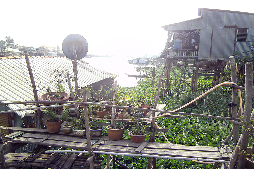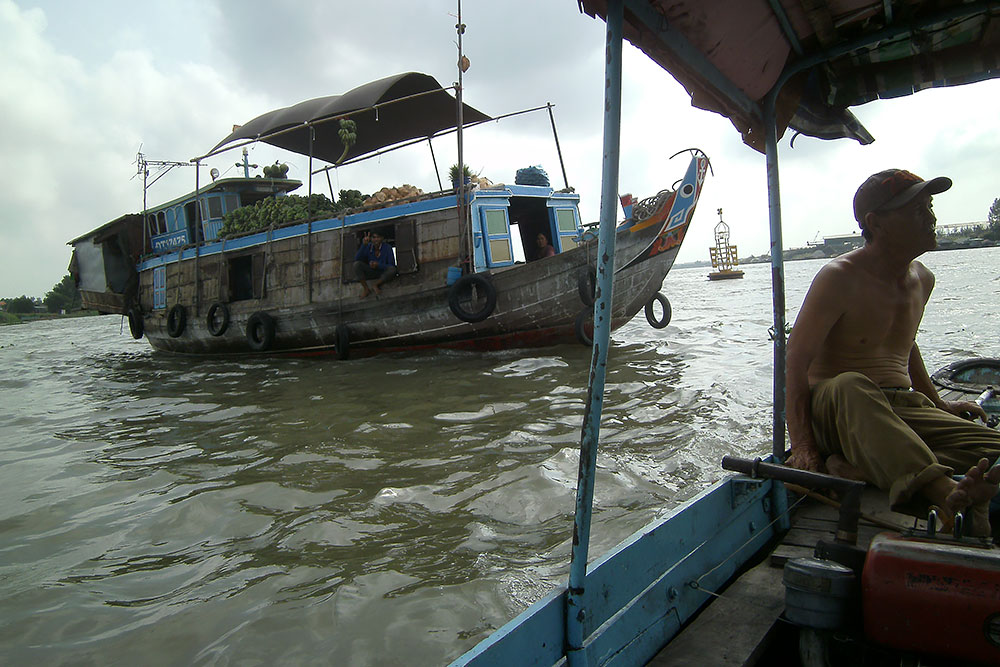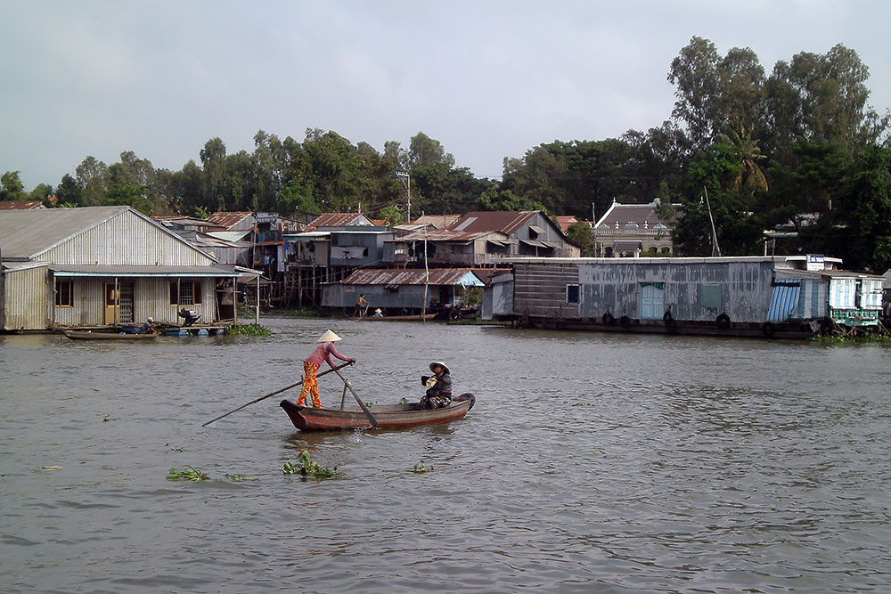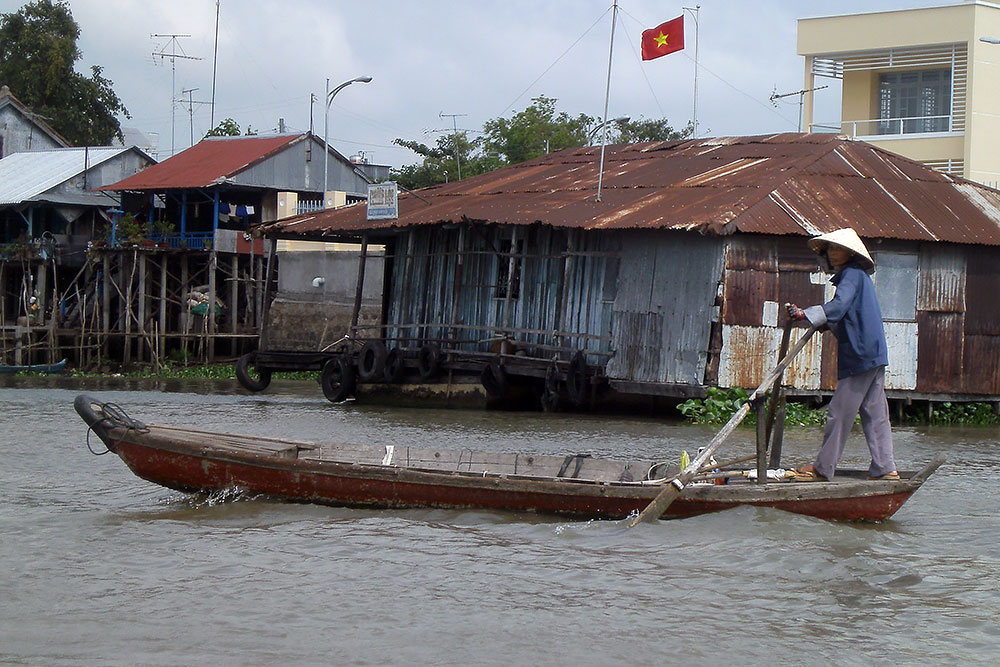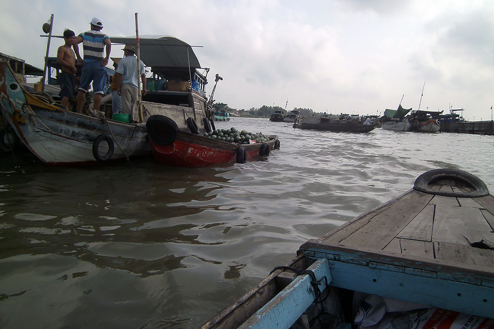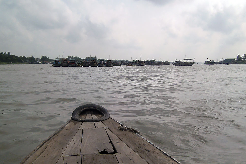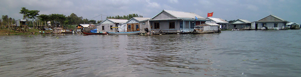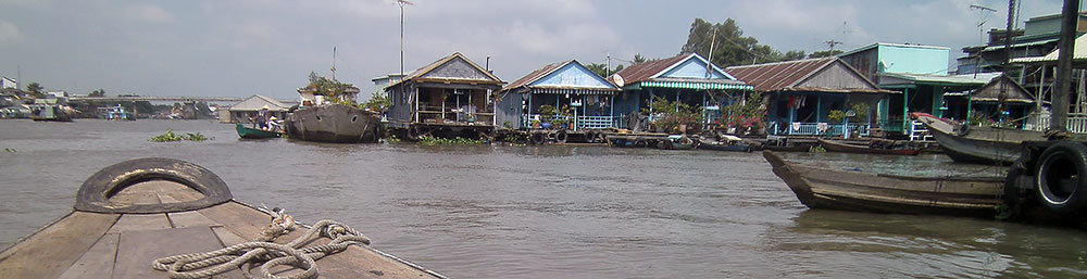 ASIEN VIETNAM CHAU DOC Das Boot legt nach ca. 5h Fahrt am späten Abend in Chau Doc an, einem kleinen Fischerstädtchen im Süden des Landes. Chau Doc liegt direkt an der Hau Giang (Bassac River) Flussgabelung. Hier gibt es einen regen Bootsverkehr und einen schwimmenden Markt. Ein Hotel ist schnell gefunden und der Blick aus dem Fenster am Morgen darauf verspricht Aufregendes!