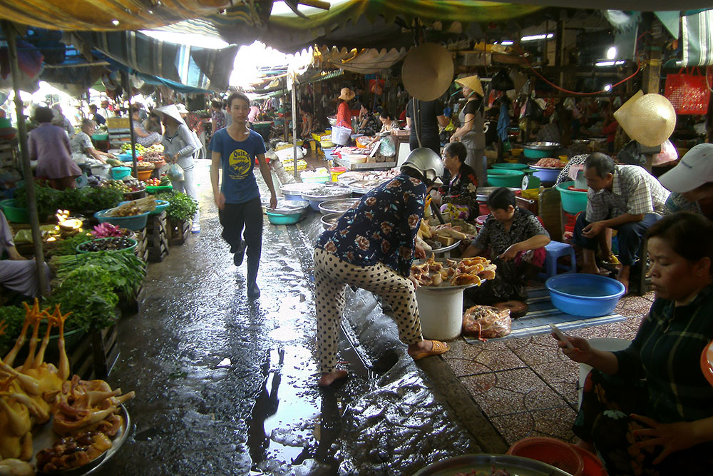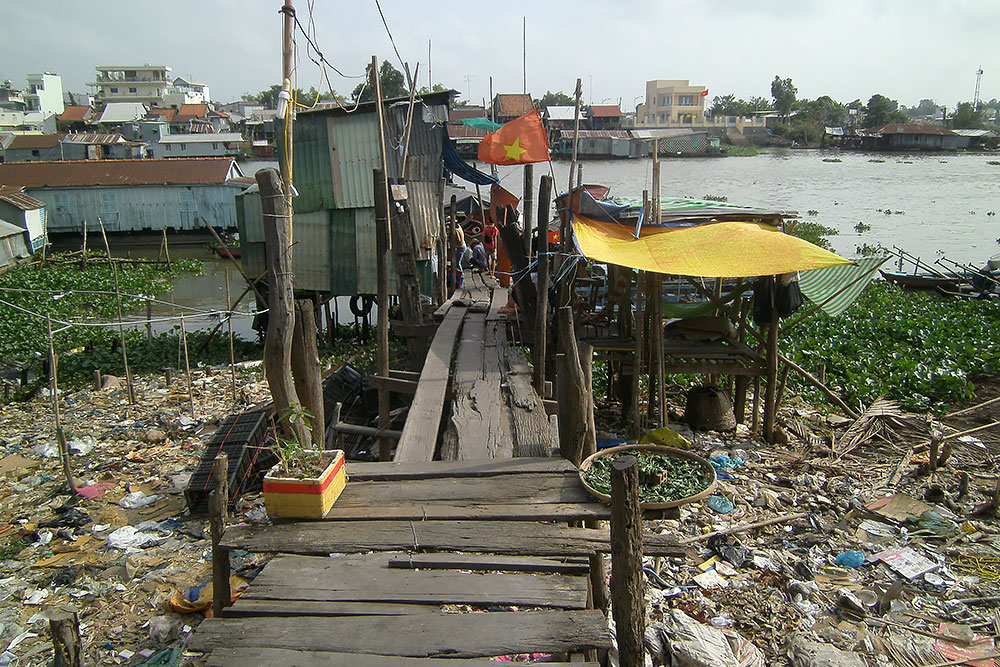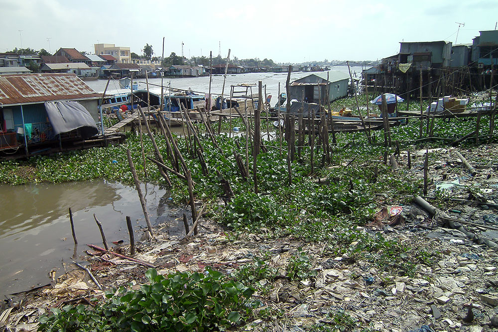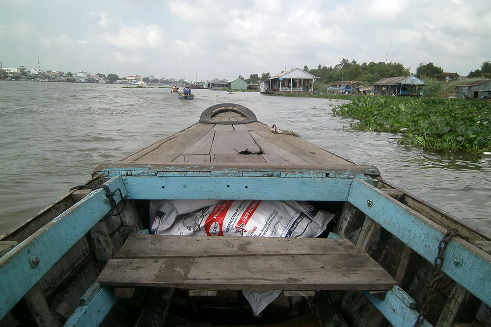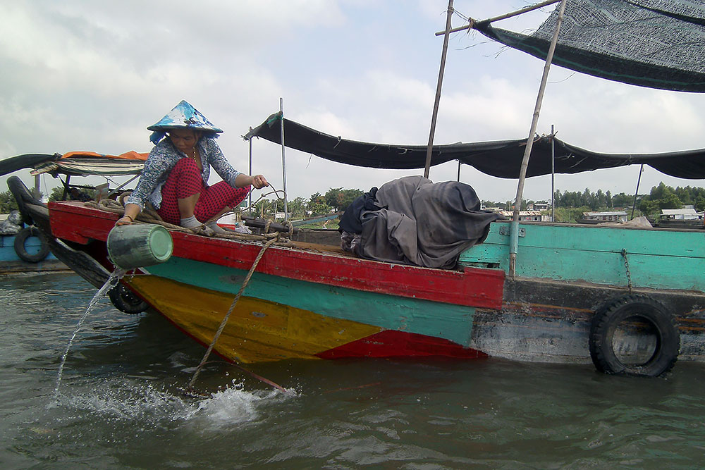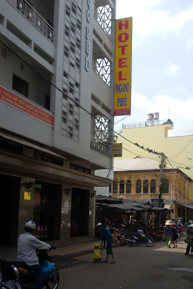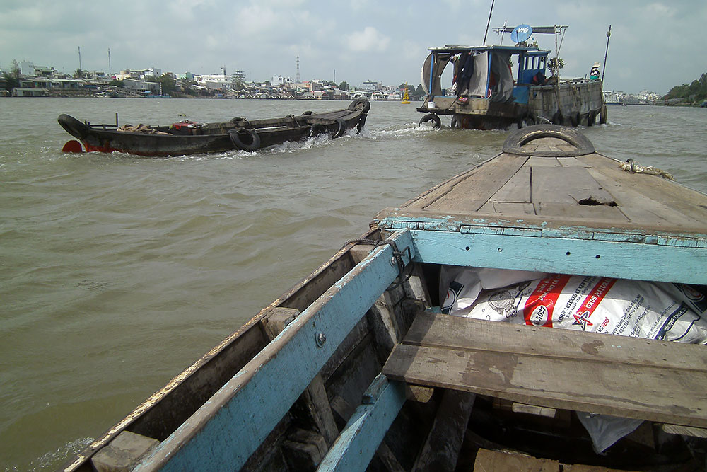 ASIEN VIETNAM CHAU DOC Das Boot legt nach ca. 5h Fahrt am späten Abend in Chau Doc an, einem kleinen Fischerstädtchen im Süden des Landes. Chau Doc liegt direkt an der Hau Giang (Bassac River) Flussgabelung. Hier gibt es einen regen Bootsverkehr und einen schwimmenden Markt. Ein Hotel ist schnell gefunden und der Blick aus dem Fenster am Morgen darauf verspricht Aufregendes!