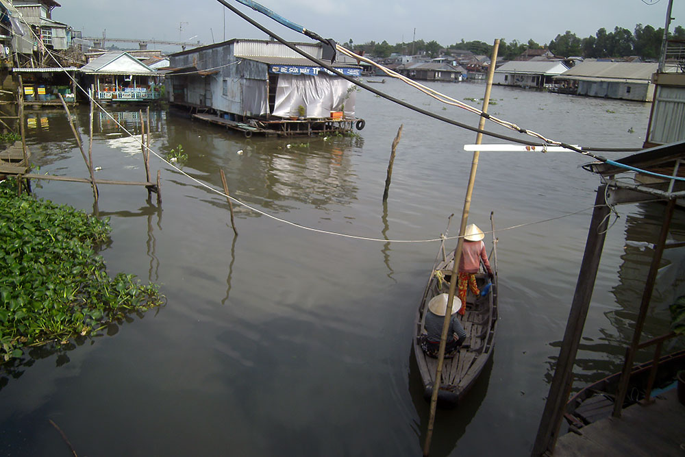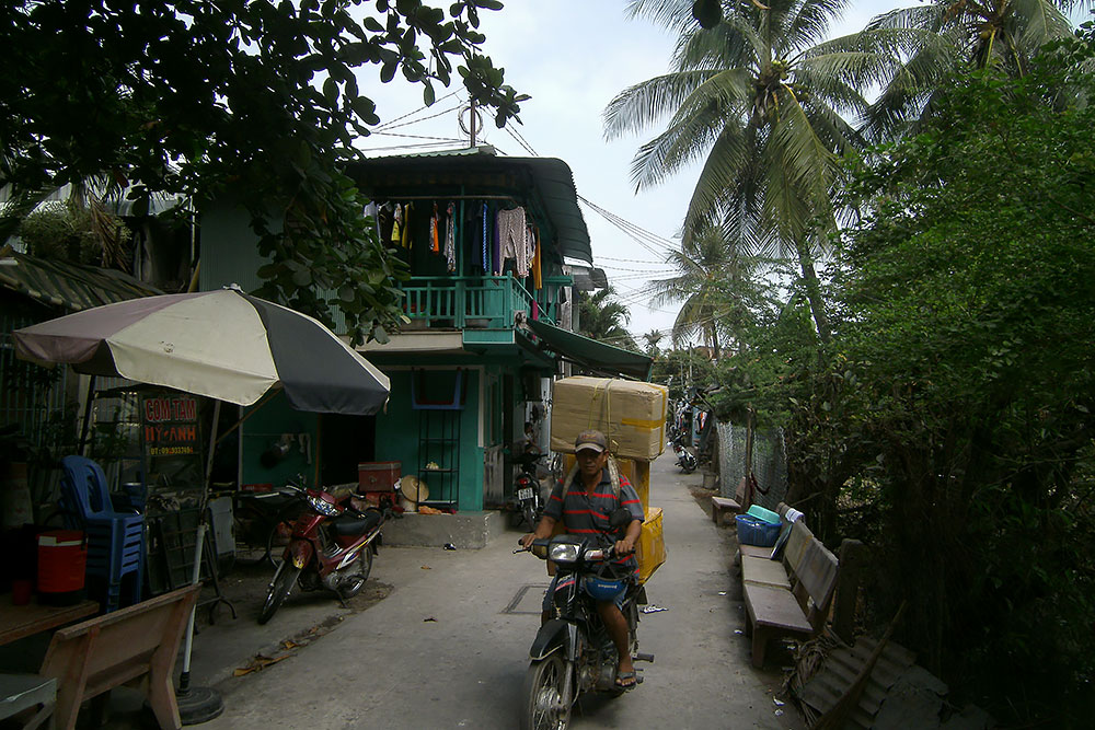nächsten Tag laufe ich durch schmale Gassen von Chau Doc, um Land und