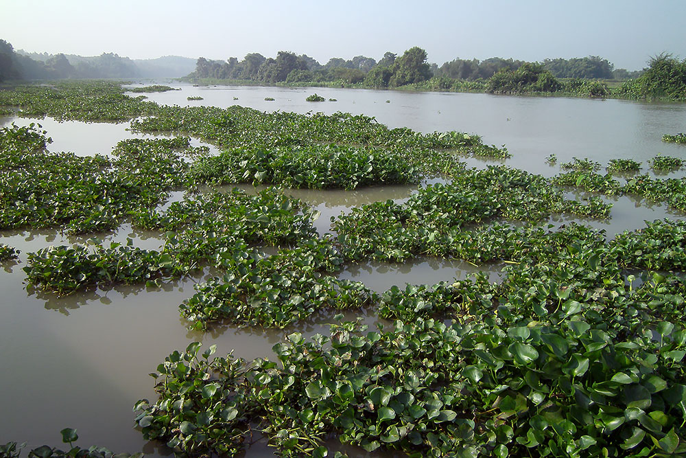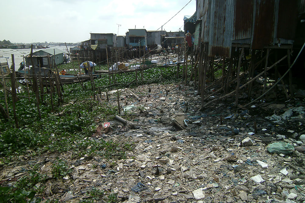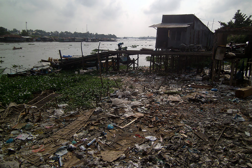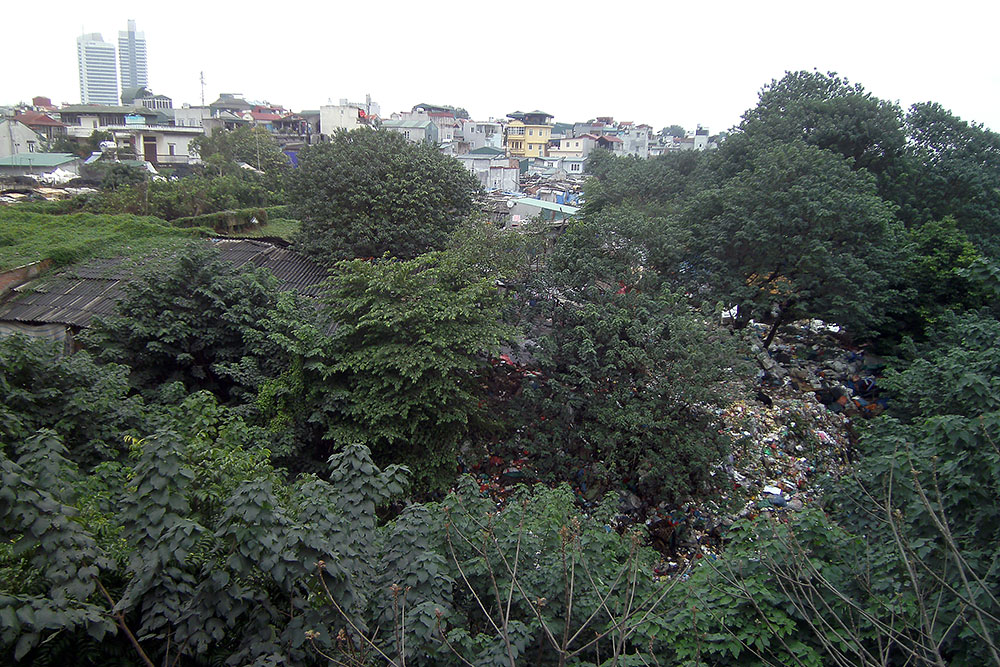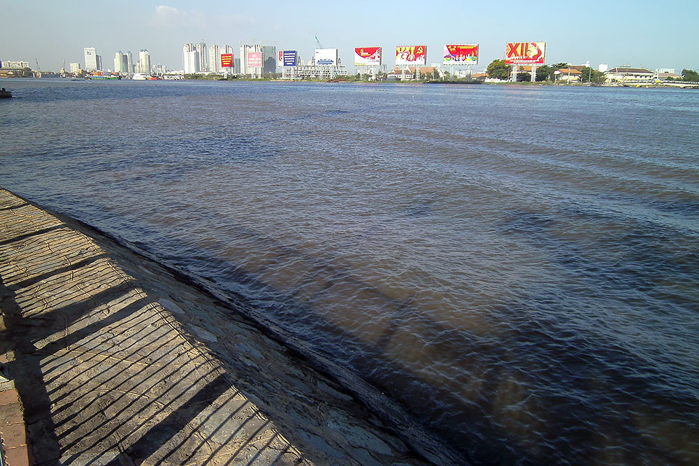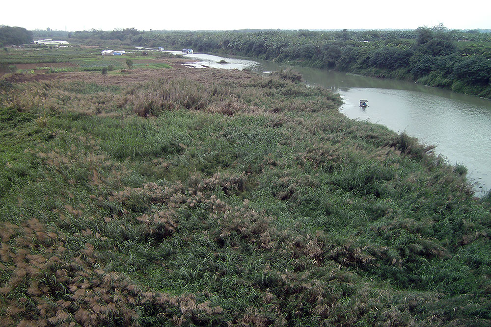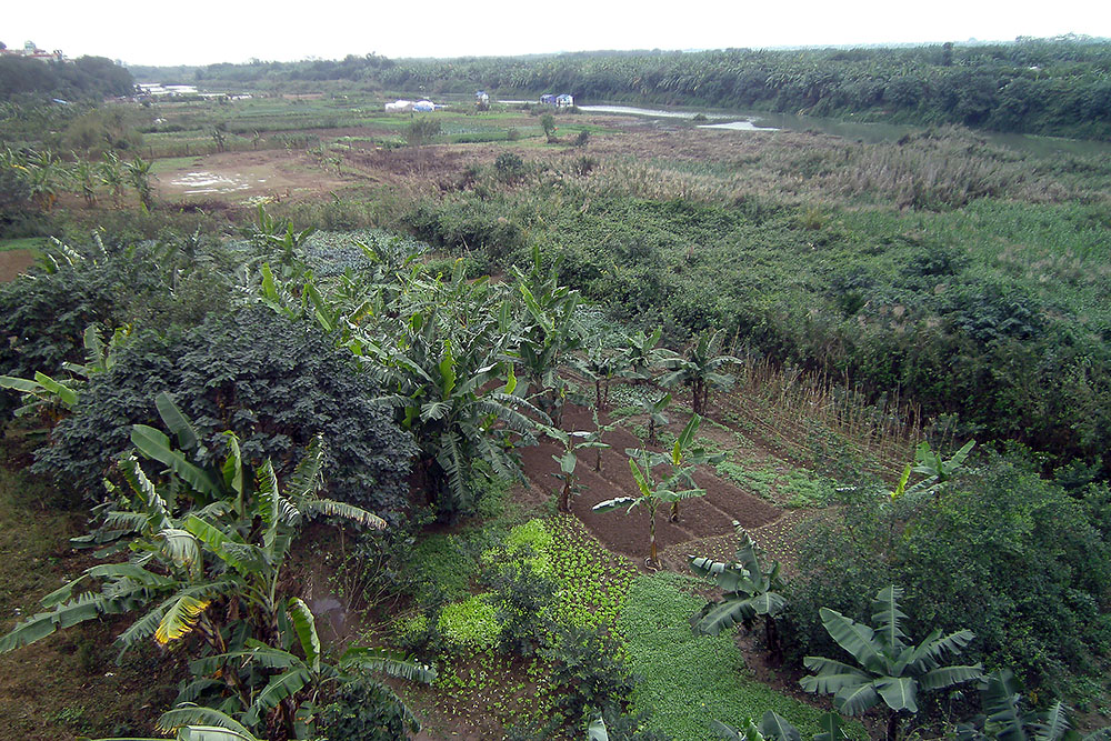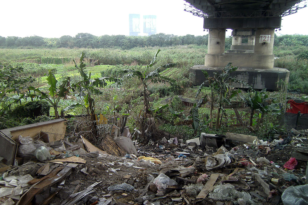| Ich erklimme die Brücke, laufe auf ihr entlang und sehe, wie im fruchtbaren Delta Obst und Gemüse direkt neben einer Müllkippe angebaut wird. Na lecker! Auch den Fluss kann ich finden aber der ist zur Zeit eher ein Flüsschen. |