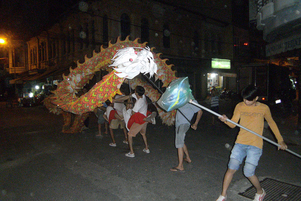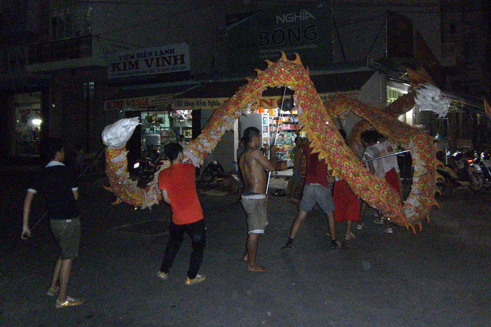 Ziel etwas näher zu kommen! Wie grotesk! Noch naiver oder dümmer sind die, welche in der Innenstadt Spenden für Hundefutter oder Katzenhäuser sammeln. Versklavt, verkrüppelt, geschlagen, gepeinigt, zum Gehorsam gezwungen, zum Spielzeug gemacht...rettet die Welt...ich lach mich kaputt! Hört auf sie retten zu wollen, um so eher wird sie ihre Chance haben! Zurück in der Stadt. Hier wird schon überall geprobt, für das Vietnamesische Neujahr (Tet-Fest) das am 08. Februar 2016 stattfindet: |