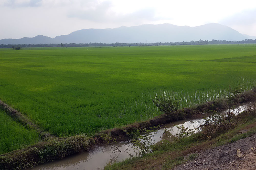 südwestlich der Stadt aus den üppig grünen Reisfeldern. Über den