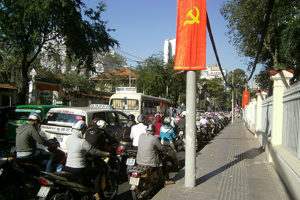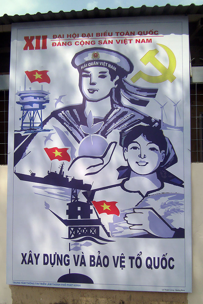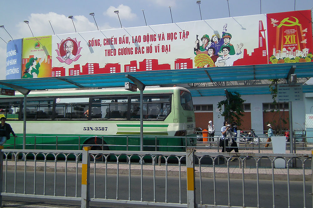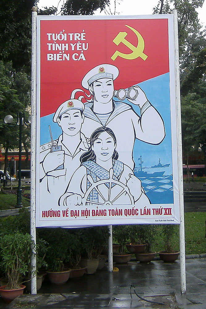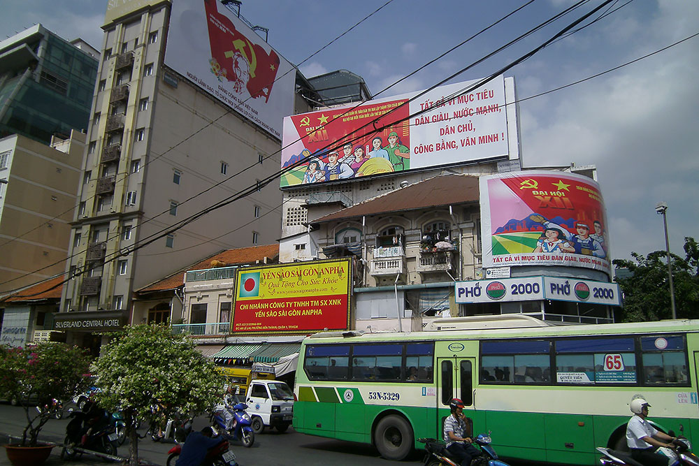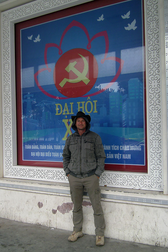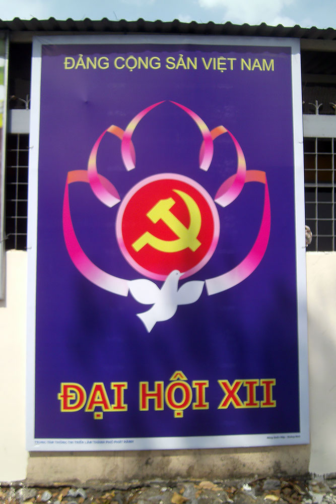 anständigen Kaffee! So auch hier in Saigon am frühen Morgen. Nach dem Wachwerden mache ich mich auf die Hotelsuche. Es dauert eine Weile, bis ich für 15,-$/Nacht eine bezahlbare heruntergekommene Kaschemme finde. Die ersten Eindrücke in ehemals Saigon wecken in mir Erinnerungen an ein ehemals kommunistisches Land in dem ich geboren wurde. Der XII Kongress der Kommunistischen Partei Vietnams, die Stadt mit Plakaten zugepflastert. |
