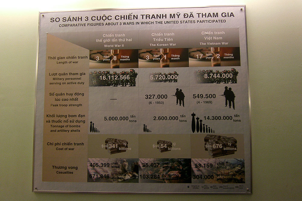 Darstellung der Fakten, keine Hetze oder Hasspredigt. Missgebildete Kinder, verseuchte Felder, todkranke Menschen = Agent Orange. Menschen foltern Menschen, Menschen töten Menschen. Kinder die um ihr Leben rennen, Zerstückelte Leichen, halbverbrannte Menschen, Feuer, Tod, Zerstörung. Gräuel eines Guerillakrieges auf S/W-Bildern. Man braucht auch in diesem Museum starke Nerven noch mehr, wenn man wie ich, das Kichern von dämlichen, respektlosen amerikanischen Touris ertragen muss! |