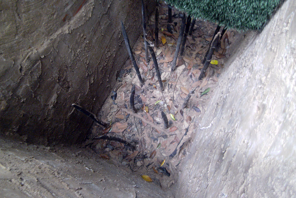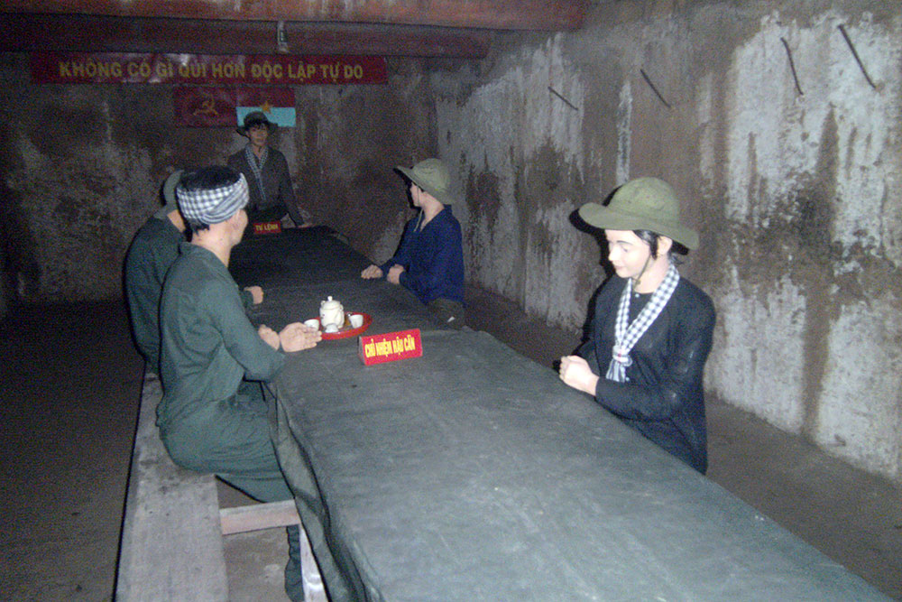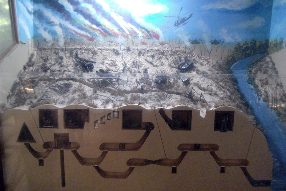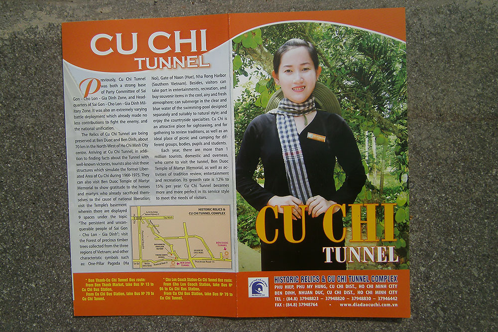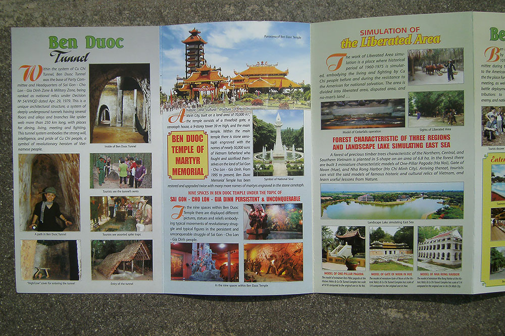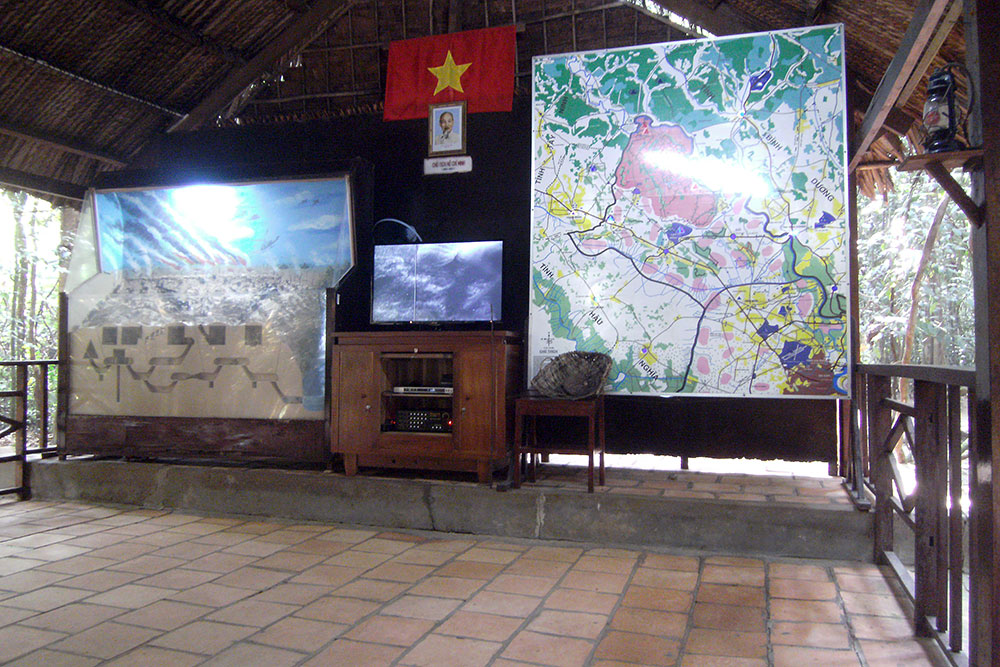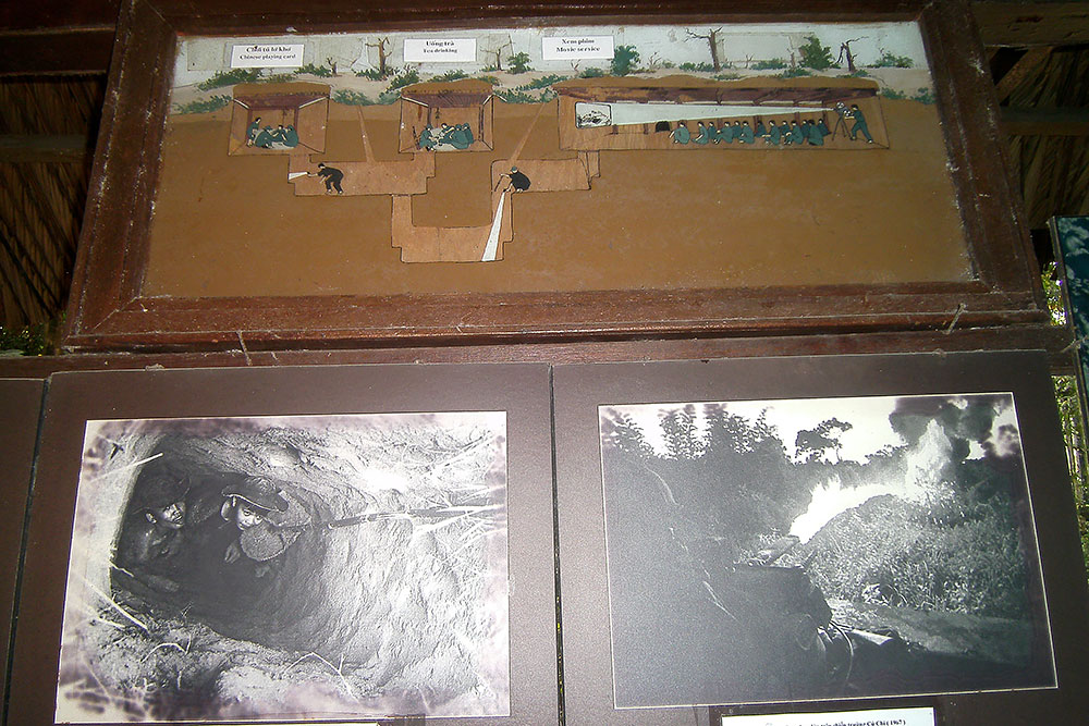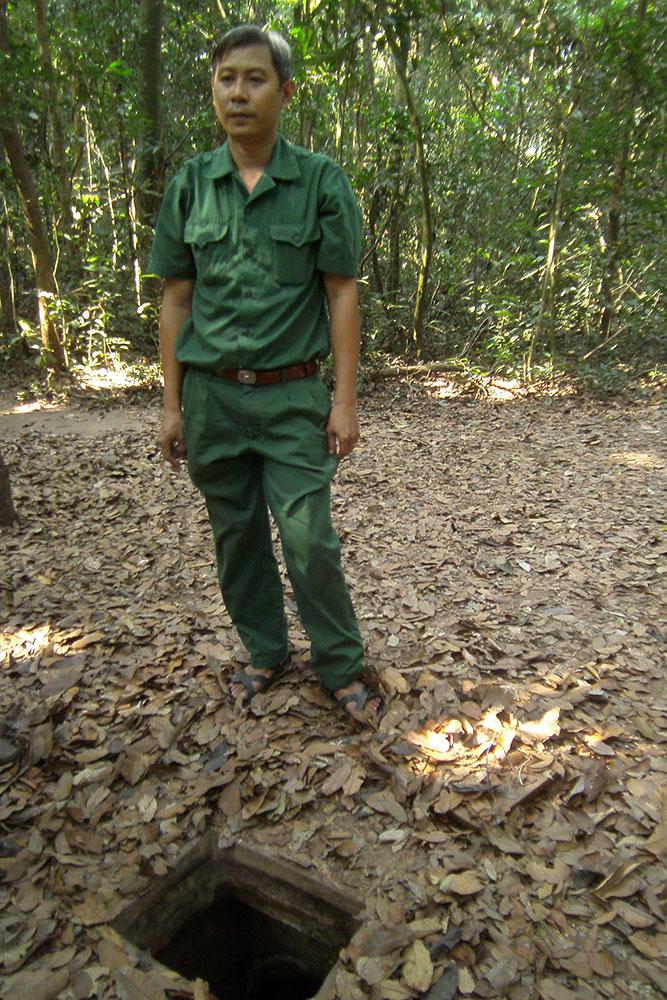 der Erde lauerte. In den 1960er-Jahren erweiterten vietnamesische Partisanen, die Vietcong, das Tunnelsystem in Ausdehnung und Tiefe massiv, bis es schließlich auf eine Gesamtlänge von 200 Kilometern auf drei Ebenen angewachsen war. Unter der Erde waren ganze Städte entstanden mit Schulen, Lazaretten, Büros und Schlafgelegenheiten. Die unterirdischen Gebäude waren durch Tunnel von ca. 80 cm Höhe und 60 cm Breite verbunden. Als Eingänge dienten mit Grasbewuchs und Laub getarnte Klapptüren. Die Eingänge waren zudem durch einfache, aber wirkungsvolle Fallen wie Bambusspieße gesichert.“ |
