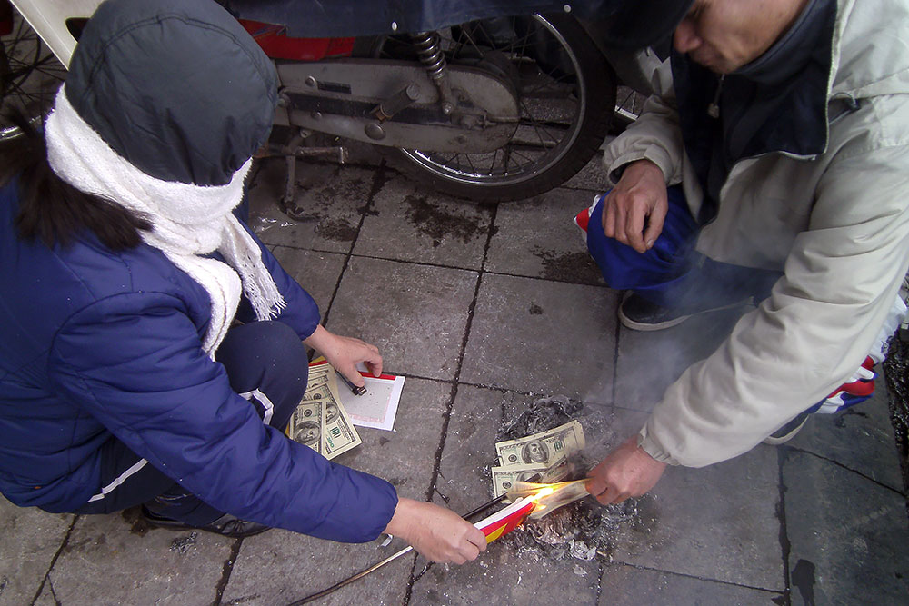 Ahnenkult. Traditionen und Ahnenverehrung spielen eine große Rolle in Vietnem. Viele wollen, dass ihre Vorfahren auch im Jenseits ein schönes Leben haben und verbrennen dafür gerne Autos, Häuser, Frauen, sowie Falschgeld aus Papier. Wer es sich leisten kann, nimmt natürlich echte Scheine. |