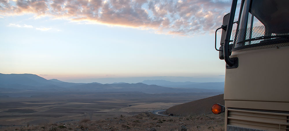 Wie in den Bergen so üblich, ist neben einem der tiefe Abgrund und keine Leitplanke davor, was die Angelegenheit noch etwas spannender machte. Irgendwann konnte ich endlich halten, um auf Mammut zu klettern und die Windschutzscheibe zu waschen. Keine 20km weiter auf der Staubpiste, schickte wieder jemand zum Spass 98Tropfen direkt auf die Scheibe. Es war wie Achterbahn fahren in der Nacht. Auf einmal versperrte an einer Nebenstrasse das Militär den Weg. Sie schauten mich an, grinsten und winkten mich mit ihrer MP durch. Ein Schild zeigte nach links in die Nebenstrasse mit der Aufschrift „Iran“, das GPS war der Meinung, ich sollte den Strassenverlauf geradeaus folgen und kannte gar keine andere Strasse. Ich wollte ja in den Iran und so folgte ich dem Schild.