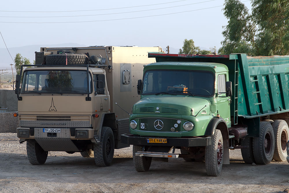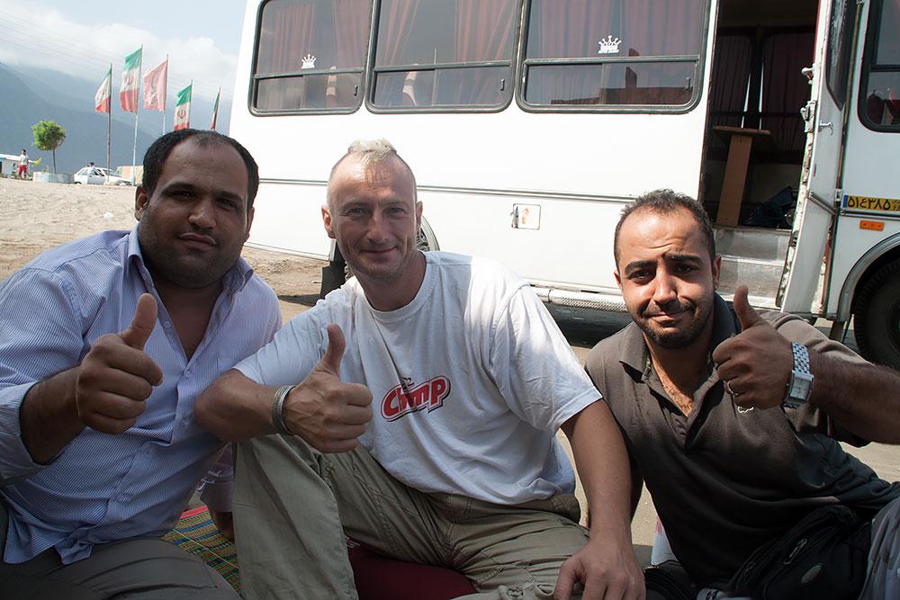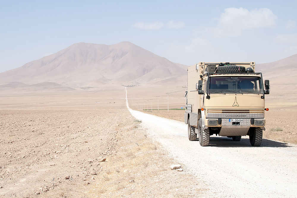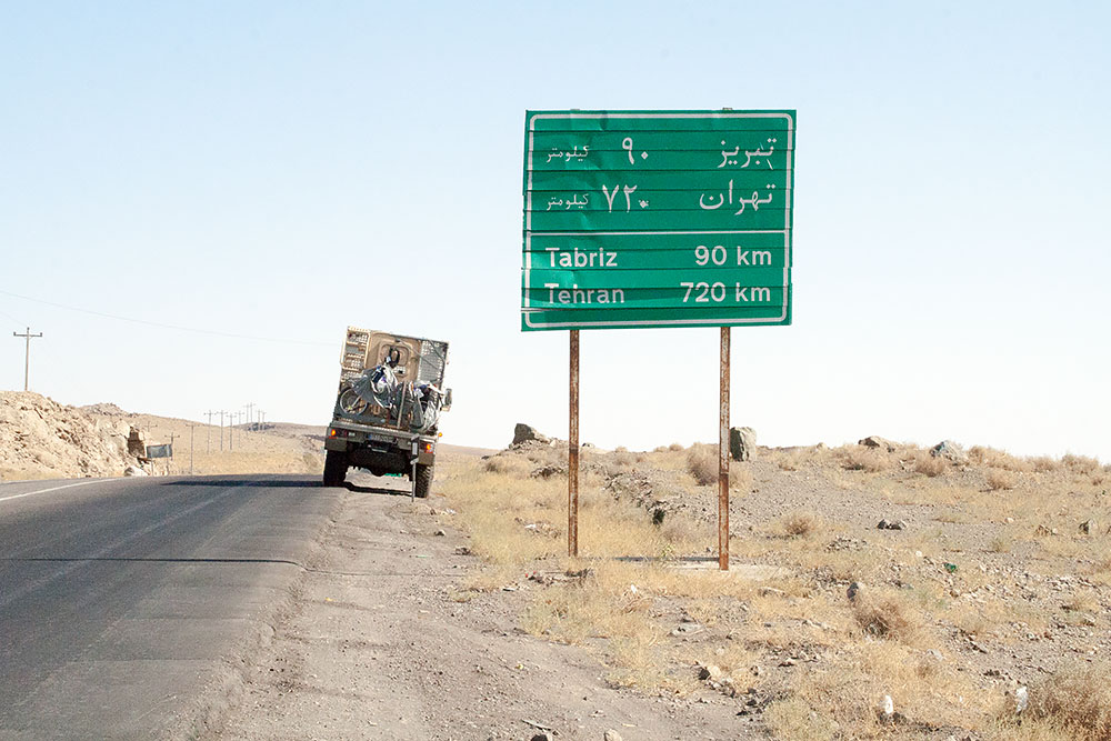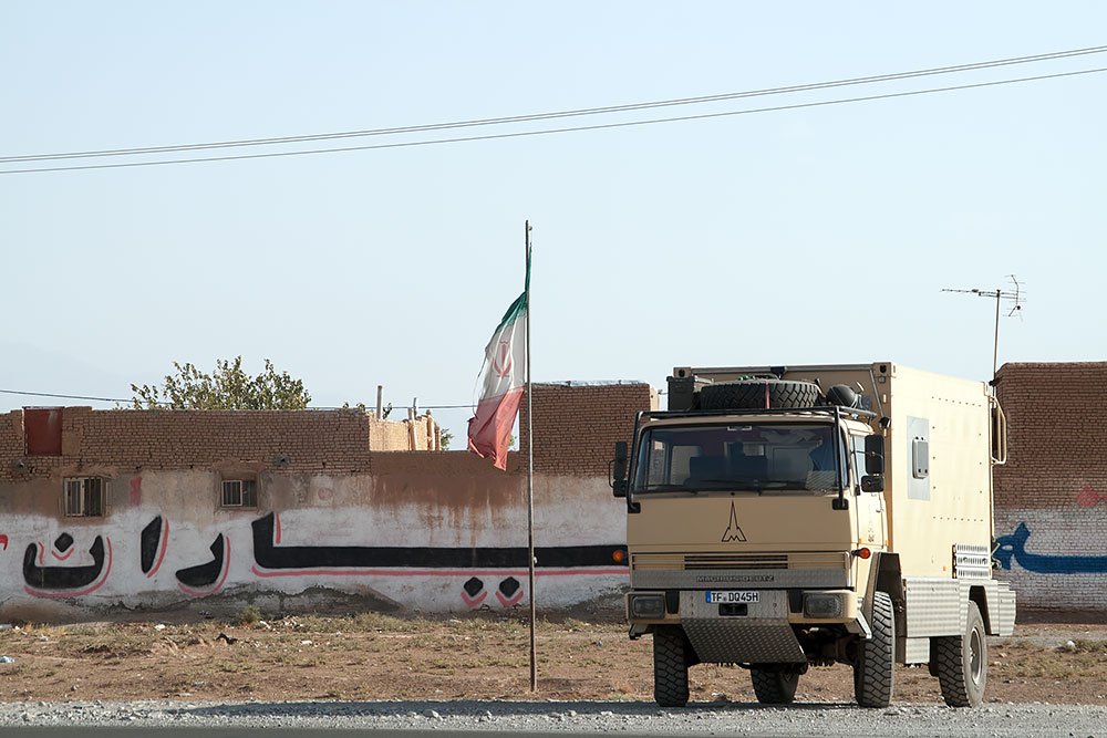 Die junge Frau war schon längst wieder im Wagen verschwunden aber der Kerl stand mit seinem Handy noch eine gefühlte Ewigkeit neben Mammut und quatschte mit seinem Onkel. Irgendwann wurde mir das zu blöd, gab ihm ein Handzeichen und fuhr einfach los. Etwa eine Stunde später, schrie mich wieder einer an und auch er brachte mich zum Anhalten. Es war der Onkel, der sichtlich einen „im Kahn“ hatte. Fünf Euro würde ein Bier im Iran unter dem Ladentisch kosten und der Wodka wäre genauso teuer, er freue sich schon sehr darauf, endlich wieder in Berlin zu sein. Selbst gefahren war er aber nicht, sondern hatte noch zwei Jungs dabei, die ihn zum Flughafen brachten. Wir verabredeten uns auf ein Bier in Berlin und setzten unsere Reise fort.
